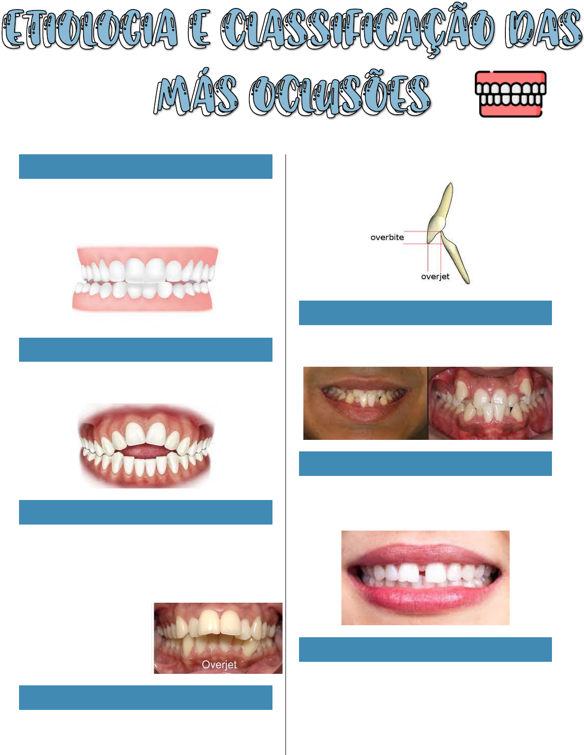 MORDIDA CRUZADA ➔ A relação oclusal onde os dentes inferiores são localizados vestibularmente aos superiores correspondentes; MORDIDA ABERTA ➔ A maloclusão onde os dentes superiores não tocam os inferiores; OVERJET OU TRESPASSE HORIZONTAL ➔ É a distância horizontal medida em mm, entre a face palatina do incisivo superior, e a face vestibular do incisivo inferior; SOBREMORDIDA OU OVERBITE ➔ A quantidade de incisivo inferior coberta pelo incisivo superior; ➔ Medida em porcentagem; ➔ Ideal: 20 %; APINHAMENTO DENTÁRIO ➔ Os dentes se encontram desalinhados por falta de espaço, nos arcos dentários ; DIASTEMAS ➔ Espaço entre dois ou mais dentes, impossibilitando o ponto de contato; ➔ Mais comum na região anterior; GIROVERSÃO ➔ Condição dentária, onde o dente realiza um giro em torno de seu próprio eixo; CLARICE LIOBA PROTRUSÃO ➔ Situação em que os dentes ou arcadas dentárias ocupam uma posição mais anteriorizadas; RETRUSÃO ➔ Situação em que os dentes ou arcadas dentárias ocupam uma posição mais retraídas; MÁ OCLUSÃO ➔ É todo e qualquer desvio da oclusão dentária normal ( Strang, 1957); ➔ Podem afetar os quatro sistemas simultâneos: dentes, ossos, músculos e nervos; ➔ Podem mostrar irregularidades apenas nos dentes, ou podem apresentar dentes alinhados, todavia numa base óssea anormal; OCLUSÃO IDEAL ➔ Dentes bem posicionados; ➔ Boa estética; ➔ Sorriso agradável; ➔ Bom funcionamento do sistema estomatognático; MÁ OCLUSÃO ➔ Diferentes classificações de más oclusões surgiram ao longo da historia da Odontologia; ➔ Angle (1899); ➔ Case ( 1921); ➔ Carabelli ( 1842); ➔ Simon (1922); ➔ Margilot( 1877); ANGLE ➔ Dividiu as más oclusões em três categorias básicas; ➔ Classe I; ➔ Classe II; ➔ Classe III; ➔ Ocorrendo a partir dos molares permanentes; CLASSIFICAÇÃO DAS MÁS OCLUSÕES ➔ Classificação de Angle; ➔ 1899: pressuponha que o primeiro molar superior permanente ocupava uma posição estável no esqueleto craniofacial e que as desarmonias decorriam de alterações anterioposteriores da arcada inferior em relação a ele; CLASSE I ➔ A cúspide mesiovestibular do primeiro molar permanente superior oclui no sulco mesiovestibular do primeiro molar inferior; ➔ É frequente a presença de um perfil reto com equilíbrio nas funções musculares, peribucal, mastigadora e da língua; ➔ Geralmente o canino também esta esta em CL I; ➔ Obs : é possível existir uma maloclusão nesta classe II; ➔ Perfil reto → ortognatico; MAL OCLUSÃO DE CLASSE I ➔ Os molares se encontram em chave de oclusão, mas podem apresentar mordida aberta, sobremordida, falta ou excesso de espaço nas arcadas; CLASSE I I ➔ A cúspide mesiovestibular do primeiro molar permanente superior oclui á frente do sulco central do primeiro molar inferior; ➔ Nos portadores de classe II de Angle é frequente a presença de um perfil convexo e desequilibro muscular; ➔ Perfil convexo → retrognatico; DIVISÃO 1 ª ➔ As características marcante dessa divisão é a protusão acentuada dos incisivos superiores, que apresenta uma inclinação labial; ➔ Superiores para a vestibular; DIVISÃO 2 ª ➔ Incisivos centrais superiores lingualizados; ➔ O arco superior geralmente apresenta-se achatado na região anterior; ➔ Sobremordida exagerada; ➔ Curva de Spee aumentada; ➔ Os portadores de CL II divisão 2 de Angle normalmente apresentam perfil reto ou levemente convexo associado a musculatura equilibrada ou com suave alteração; SUBDIVISÃO DA CLASSE II ➔ Ocorre quando o paciente é classe I de um lado e classe II do outro lado; ➔ Subdivisão direta ou esquerda: a subdivisão informa onde esta a classe II; Exemplo: paciente classe II, divisão primeira, subdivisão direta, isso quer dizer que o paciente apresenta classe II apenas do lado direito com os incisivos centrais vestibularizados; CLASSE I I I ➔ A cúspide mesiovestibular do primeiro molar permanente oclui atras do sulco central do primeiro molar inferior; ➔ Os portadores de CL III apresentam um perfil predominantemente côncavo, e musculatura esta em geral desequilibrada. Os cruzamentos de mordidas anterior/ posterior são frequentes; ➔ Pode apresentar mordida cruzada; ➔ Não tem divisões, mas como na classe II, apresenta as subdivisões direita e esquerda; SUBDIVISÕES DA CLASSE II I ➔ Subdivisões direta ou esquerda: informar o lado da classe III; QUAL A IMPORTÂNCIA DE SABER A ETIOLOGIA DAS MÁS OCLUSÕES ? ➔ Curar → doença → conhecer a causa da sua origem; ➔ Tratar → má oclusão→ conhecer a razão que a causou; ETIOLOGIA DAS MÁS OCLUSÕES ➔ Multifatoriais; Congênitos; Hereditários; Adquiridos; ➔ Graber ( 1966) : intrínsecos ( locais ) e extrínsecos ( gerais ); FATORES EXTRÍNSECOS HEREDITARIEDADE Características raciais; Tipo facial; 1- Braquiocefalo; 2- Dolicocéfalo; 3- Mesocéfalo; Influencia no padrão de crescimento e desenvolvimento; ( face longa ) ( face curta ) MOLÉSTIAS OU DEFORMIDADES CONGÊNITAS Labio leporino ou fendas labiais : anomalias decorrente da falta de coalescência dos segmentos que formam os lábios e o palato; gerando a falha da falta de fusão dos processos nasais com os processos maxilares e estes entre si. Pode gerar uma serie de outras alterações dentais , como: agenesias, supranumerios, mordida cruzada, dentes ectópicos, etc Paralisia cerebral Torcicolo: atrofia do musculo esternocleidomastoideo, assimetria faciais, desvio de LM dental, o tratamento deve ser o mais precoce possível; Disostose cleidocraaneana: síndrome genética rara com padrão de herança autossômica dominante, hipoplasia da clavícula, retrusão maxilar, protrusão mandibular, erupção tardia dos dentes permanentes; grande frequência de supra numerários; Sífilis congênita: dentes de hucthinson; dentes anteriores em forma de chave de fenda ou molares em amora; MEIO AMBIENTE Influencia pré- natal: m