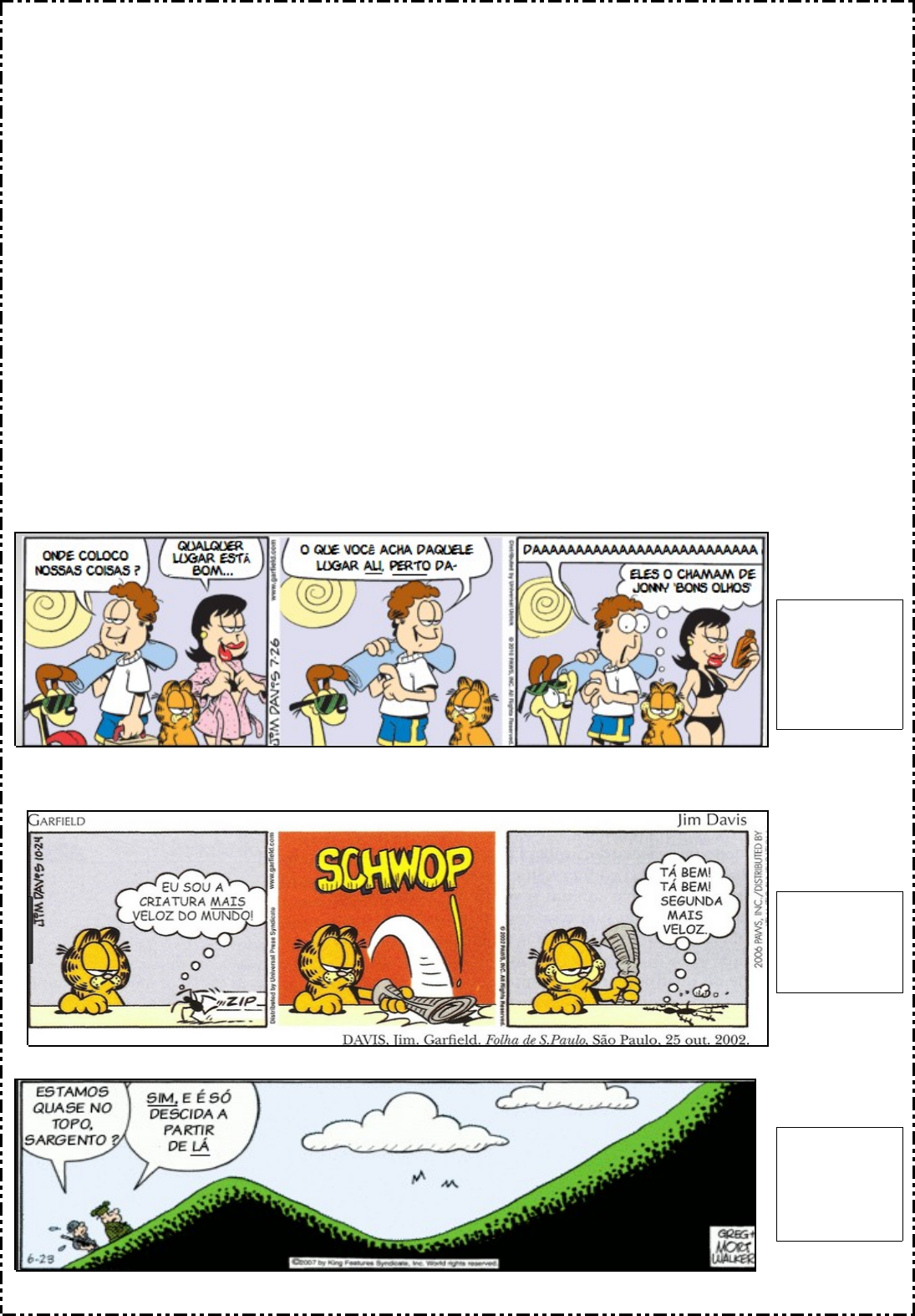 ESCOLA ________________________________________DATA:_____/_____/_____ PROF:______________________________________________TURMA:___________NOME:_______________________________________________________________ 1.Faça a leitura das tirinhas abaixo, em seguida, classifique os advérbios grifados de acordo com o seguinte código: Atenção faça a classificação dos advérbios na caixa de texto ao lado de cada tirinha. A = advérbio de lugar B = advérbio de tempo C = advérbio de modo D = advérbio de negação E = advérbio de intensidade F = advérbio de afirmação ( https ://tirinhasdogarfield.blogspot.com.br/ ) ( https ://peramblogando2.wordpress.com/category/recruta-zero/ ) ( https ://tirinhasdogarfield.blogspot.com.br/ ) ( http://elcabron.sjdr.com.br/wp-content/uploads/2008/05/hagar10.gif ) Texto para as questões de 2 a 9 A criatura A tempestade tornava a noite ainda mais escura e assustadora. Raios riscavam o céu de chumbo e a luz azulada dos relâmpagos iluminava o vale solitário, penetrando entre as árvores da floresta espessa. Os trovões retumbavam como súbitos tiros de canhão, interrompendo o silêncio do cenário [...]. Alimentadas pela chuva insistente, as águas do rio começavam a subir e a invadir as margens, carregando tudo o que encontravam no caminho. Barrancos despencavam e árvores eram arrancadas pela força da correnteza, enquanto o rio se misturava ao resto como se tudo fosse uma coisa só. Mas algo... ou alguém... ainda resistia. Agarrado desesperadamente a um tronco grosso que as águas levavam rio abaixo, um garoto exausto e ferido lutava para se manter consciente e ter alguma chance de sobreviver. Volta e meia seus braços escorregavam e ele quase afundava, mas logo ganhava novas forças, erguia a cabeça e tentava inutilmente dirigir o tronco para uma das margens. De repente, no período de silêncio que se seguia a cada trovão, ele começou a ouvir um barulho inquietante, que ficava mais e mais próximo. Uma fumaça esquisita se erguia à frente, e ele então compreendeu: era uma cachoeira! [...] Num pulo desesperado, agarrou o ramo de uma árvore que ainda se mantinha de pé perto da margem e soltou o tronco flutuante, que seguiu seu caminho até a beira do precipício e nele mergulhou descontrolado. A tempestade prosseguia e cegava o garoto, o rio continuava seu curso feroz e a cachoeira rosnava bem perto de onde ele estava. De repente, percebeu que a distância entre uma das margens e o galho em que se pendurava talvez pudesse ser vencida com um pulo. Deu um jeito de se livrar da camisa molhada, que colava em seu corpo e tolhia seus movimentos. Respirou fundo para tomar coragem. Se errasse o pulo, seria engolido pela queda d’água... mas, se acertasse, estaria a salvo. Viu que não tinha outra saída e resolveu tentar. Tomou impulso e [...] conseguiu alcançar a margem. [...] Ficou de pé meio vacilante e examinou o lugar em torno, tentando decidir para que lado ir. Foi quando ouviu um rugido horrível, que parecia vir de bem perto. Correu para o lado oposto, mas não foi longe. Logo se viu encurralado em frente a um penhasco gigantesco, que barrava sua passagem. O rugido se aproximava cada vez mais. Estava sem saída. De um lado, o penhasco intransponível; de outro, uma fera esfomeada que o cercava pronta para atacar. Então, viu um buraco no paredão de pedra e se meteu dentro dele com rapidez. A fera o seguiu até a entrada da caverna, mas foi surpreendida. Com uma pedra grande que achou na porta da gruta, o garoto golpeou a cabeça do animal com toda a força que pôde e a fera cambaleou até cair, desacordada. Já fora da caverna, ele examinou o penhasco que teria que atravessar antes que o bicho voltasse a si. [...] Foi quando uma águia enorme passou voando bem baixo e o garoto a agarrou pelos pés, alçando voo com ela. Vendo-se no ar, olhou para baixo, horrorizado. Se caísse, não ia sobrar pedaço. Segurou com firmeza as compridas garras do pássaro e atravessou para o outro lado do penhasco. O outro lado tinha um cenário muito diferente. Para começar, era dia, e o sol brilhava num céu sem nuvens sobre uma pista de corrida cheia de obstáculos, onde se posicionavam motocicletas devidamente montadas por pilotos de macacão e capacete, em posição de largada. Apenas em uma das motos não havia ninguém. A águia deu um voo rasante sobre a pista, e o garoto se soltou quando ela passava bem em cima da moto desocupada. Assim que ele caiu montado, foi dado o sinal de largada. As motos aceleraram ruidosamente e partiram em disparada, enfrentando obstáculos como rampas, buracos e lamaçais. O páreo era duro, mas a motocicleta do garoto era uma das mais velozes. Logo tomou a dianteira, seguida de perto por uma moto preta reluzente, conduzida por um piloto de aparência soturna. [...] Inclinando o corpo um pouco mais, o garoto conseguiu acelerar sua moto e aumentou a distância entre ele e o segundo colocado. Mas o piloto misterioso tinha uma carta na manga: num golpe rápido, fez sua moto chegar por trás e, com um movimento preciso, deu uma espécie de rasteira na moto do garoto. A motocicleta derrapou e caiu, rolando estrondosamente pelo chão da pista e levantando uma nuvem de poeira. O garoto rolou com ela e ambos se chocaram com violência contra uma montanha de terra, um dos últimos obstáculos antes da chegada. A moto negra ganhou a corrida, sob os aplausos da multidão excitada, e o garoto ficou desmaiado no chão. Com um sorriso vitorioso, Eugênio viu aparecer na tela as palavras FIM DE JOGO. Soltou o joystick e limpou na bermuda o suor da mão. [...] Laura Bergallo. A criatura. São Paulo: SM, 2005. p. 37-44. LEITURA 2 Romance de aventura 2.Podemos classificar esse texto como: a.( ) uma narrativa de ficção b.( ) uma narrativa de aventura c.( ) uma descrição d.( ) um conto 3. O personagem principal da história a quem também chamamos de protagonista é quem vivencia muitas aventuras. Em sua opinião, quem é o protagonist