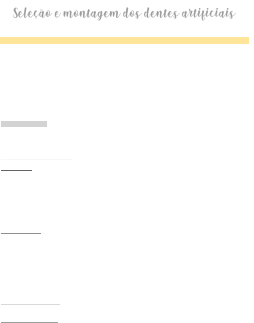 Seleção e montagem dos dentes artificiais SELEÇÃO DOS DENTES A vida útil da PT recai sobre a resistência dos dentes artificiais; Fatores relacionados: ✓ Frequência mastigatória – maior uso, maior desgaste; ✓ Força de mordida; ✓ Tipo de dieta; ✓ Presença de hábitos parafuncionais; ✓ Ação dos agentes de limpeza. Tipos de dentes Os dentes que usamos são os dentes de estoque: dente de porcelana e dente de resina 1) Dentes de porcelana: tem mais desvantagens do que vantagens. Vantagens: → Durabilidade; → Dureza – menor desgaste; → Estabilidade dimensional e de cor – os dentes se mantêm com a cor e tamanho originais por bastante tempo; → Resistência ao desgaste. Desvantagens: → Preço – caro; → Descolam da base da prótese – não tem uma boa aderência com a resina acrílica; → Dificuldade de ajuste e desgaste; → Barulho audível ao contato na mastigação; → Dificuldade de adquirir no mercado odontológico; → Isso tudo faz com que venha caindo sua indicação e uso. 2) Dentes de resina: possuem mais vantagens que desvantagens, são bastantes ofertados no mercado. Principal vantagem: união química com a base da prótese. Prensagens: ▪ Dupla: incisal e corpo do dente ▪ Tripla: incisal, corpo e colo do dente ▪ Quarta: incisal, corpo, colo do dente e lateral translúcida Outras vantagens: → São resistentes a rachaduras e a solventes orgânicos; → Maior resistência ao impacto; → Contato dentário mais próximo do dente natural e menor trauma ao rebordo; → Fáceis de serem desgastados para adaptação na montagem; → Permite acréscimo, fácil polimento, facilitando ajuste estético e oclusal. Desvantagens: → Baixa tolerância ao meio bucal; → Baixa resistência ao desgaste; → Absorve líquidos e fluidos orais; → Estabilidade de cor comprometida; → Alta porosidade que favorece a ação de microrganismos. ESTÉTICA X BELEZA Teoria dentogênica ou de Frush e Fisher – diz que a prótese do idoso deve refletir o desgaste e o envelhecimento natural dos dentes; Princípio da percepção visual ou teoria de Lombardi – diz que a estética só é alcançada quando o resultado final espelha toda a beleza que o caso pode exibir. A palavra final é do paciente, se ele quer um dente branquinho, vai ser aquele. → Dimensões da estética em PT (são três) 1ª – biótipo do paciente: ajuste e individualização dos planos de orientação; 2ª – seleção dos dentes artificiais: harmonia com o rosto do paciente; 3ª – montagem dos dentes artificiais: movimento, arranjo no detalhe de cada dente SELEÇÃO DOS DENTES ARTIFICAIS DO DENTE Critérios: cor, formato e tamanho 1) COR a. Utilizar a escala do fabricante; b. Considerar os dentes remanescentes; c. A prótese em uso; d. Idade – pacientes mais jovens, o dente é mais claro e maior em relação ao idoso; e. Cor da pele; f. Opinião do paciente; g. Bom senso. 2) FORMATO a. Teoria de Willis – concluiu que a forma do rosto poderia ser utilizada como ponto de partida para a seleção do formato dos dentes artificiais – utilizava a régua Nelson para medir o formato do rosto: › Quadrangular – geralmente são homens; › Triangular; › Ovoide – geralmente em mulheres. b. Teoria de Tamaki – concluiu que a forma do rebordo pode ser comparada com a forma do incisivo central e auxiliar na seleção dos dentes artificiais: › Quadrangular; › Triangular; › Ovoide. 3) TAMANHO a. Trabalho de Clapp – define a largura dos seis dentes anteriores superiores em curva. Observamos isso nos planos de orientação em cera nas marcações correspondentes às comissuras labiais (linha dos caninos). b. Linha alta do sorriso – numa manobra de sorriso forçado ou sorriso máximo, marca-se essa linha. Deve ser paralela ao plano oclusal e ela definirá a altura do incisivo central superior; c. Linha média ou mediana – três pontos faciais como referência: trichion (início do couro cabeludo), nasium (glabela) e pogônio (mento). Podemos usar também como referência o filtrum do lábio superior. De posse dessas marcações, vamos medir como uma régua flexível as distâncias relacionadas e selecionar os dentes na CARTA MOLDE CARTA MOLDE – é um catálogo fornecido pelo fabricante que contém os códigos dos dentes, as tabelas de combinação e as cores, para auxiliarem na seleção dos dentes artificiais. O que precisamos para utilizar a carta molde? › Cor; › Forma do incisivo central superior; › Altura da linha alta do sorriso; › Distância entre as linhas dos caninos. 1º selecionar os 6 dentes anteriores superiores (através desses dados acima); › A partir daí teremos um código ex: 2º vamos na tabela de combinação e com o código dos 6 dentes anteriores superiores, achamos o código dos dentes posteriores superiores e dentes inferiores MONTAGEM DOS DENTES Pino incisal em 0 – no lab; Por onde começar – lado superior direito (do dentista) e lado superior esquerdo (do paciente); Levantar o pino; Transferir a marcação do centro da papila piriforme para a área posterior do modelo. Com auxílio de uma régua, vamos transferir essa linha do rebordo para região anterior do modelo que é denominada linha de esforço mastigatório ou linha de Pondes. Essa linha é marcada no plano de orientação inferior. → Essa linha vai orientar na montagem dos dentes posteriores superiores; → As cúspides palatinas dos dentes superiores posteriores vão ter que encostar nessa linha. Quando formos montar, utilizamos a técnica do recorte do rolete ou técnica limpa – recortar o rolete na altura da linha alta do sorriso de um dos lados. Os dentes ficam limpos durante a montagem. ▪ Em um sorriso forçado, a ponta dos incisivos superiores deve tangenciem na linha seco úmida do lábio que no plano de cera, corresponde a ponta dos incisivos superiores tocando na borda anterior do plano de orientação inferior; ▪ O plano do orientação inferior é referênc