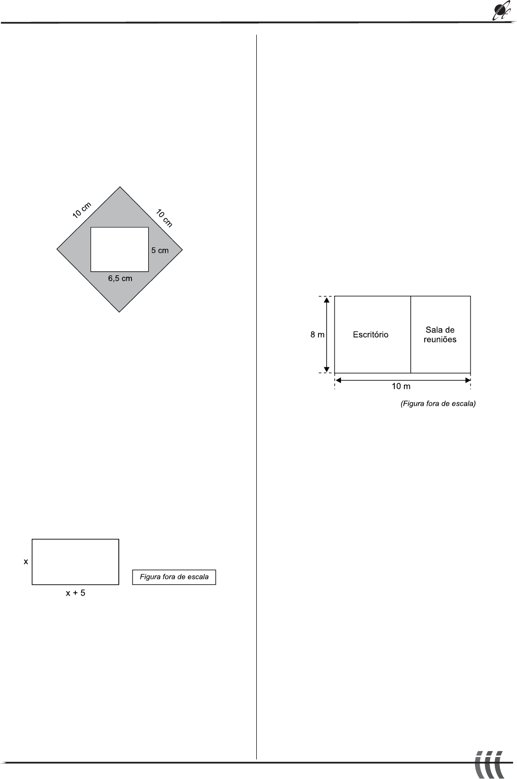 NOÇÕES DE GEOMETRIA – VUNESP 2020 . AULÃO DE GEOMETRIA – VUNESP 2020 LISTA #1 – EXERCÍCIOS Conteúdo da lista: Noções de Geometria – forma, ângulos, área, perímetro, volume, Teoremas de Pitágoras ou de Tales. 01. (VUNESP-2019) Carlinhos desenhou um quadrado com 10 cm de lado e recortou de dentro desse quadrado um retângulo de 5 cm por 6,5 cm, conforme a figura a seguir. A área cinza resultante, em cm2, é de (A) 60,5. (B) 62,5. (C) 67,5. (D) 70,5. (E) 72,5. 02. (VUNESP-2019) Um pedaço retangular de papel tem 50 cm de perímetro, e a medida do seu comprimento tem 5 cm a mais do que a medida da sua largura, conforme indica a figura, cujas medidas indicadas estão em centímetros. Esse pedaço de papel foi recortado e somente a medida de seu comprimento foi reduzida em 2 cm. A medida do comprimento após a redução passou a ser de (A) 14 cm. (B) 13 cm. (C) 12 cm. (D) 11 cm. (E) 10 cm. 03. (VUNESP-2019) O quadro de avisos de uma firma tem a forma de um retângulo com 80 cm de altura e 1,2 m2 de área. A medida do comprimento desse quadro é (A) 1,2 m. (B) 1,3 m. (C) 1,4 m. (D) 1,5 m. (E) 1,6 m. 04. (VUNESP-2019) Uma sala retangular foi dividida em 2 salas, ambas retangulares também, sendo que uma delas será utilizada como escritório, e a outra, como sala de reuniões, conforme mostra a figura. Sabendo que o perímetro do escritório é de 28 m, então, a área da sala de reuniões é (A) 26 m2. (B) 28 m2. (C) 30 m2. (D) 32 m2. (E) 34 m2. 05. (VUNESP-2019) Uma área foi totalmente coberta por 300 peças de vidro colocadas lado a lado sem sobras entre elas. Cada peça tinha 70 cm de comprimento por 50 cm de largura. A área coberta por essas peças é de (A) 350 m2. (B) 290 m2. (C) 210 m2. (D) 150 m2. (E) 105 m2. NOÇÕES DE GEOMETRIA – VUNESP 2020 . 2 06. (VUNESP-2019) Em uma casa, há 2 quartos. O quarto A é quadrado e o quarto B, retangular, conforme mostram as figuras, cujas medidas indicadas estão em metros. (Figuras fora de escala) Sabendo que o perímetro do quarto A tem 2 m a menos do que o perímetro do quarto B, então, o perímetro do quarto B é (A) 14 m. (B) 13 m. (C) 12 m. (D) 11 m. (E) 10 m. 07. (VUNESP-2019) Deseja-se pintar a área dos quatro triângulos retângulos da figura a seguir: Considerando que as figuras são idênticas, a área total a ser pintada é igual a (A) 216 m2. (B) 224 m2. (C) 248 m2. (D) 260 m2. (E) 282 m2. 08. (VUNESP-2019) Uma empresa utiliza bicicletas para entregar pequenos pacotes em locais próximos à sua sede. O preço de entrega praticado por essa empresa é definido a partir da distância, em quilômetros e em linha reta, entre a sede e o local de entrega, sendo obtido a partir da seguinte fórmula: Preço da entrega = R$ 1,80 x distância + R$ 5,00 Considere o seguinte esquema que apresenta a distância entre a sede da empresa e o local de entrega. Nesse caso, o valor da entrega será de (A) R$ 44,20. (B) R$ 28,40. (C) R$ 26,60. (D) R$ 16,70. (E) R$ 15,80. R A S C U N H O NOÇÕES DE GEOMETRIA – VUNESP 2020 . 3 09. (VUNESP-2019) Um terreno retangular ABCD foi dividido em 3 lotes, con- forme mostra a figura. (Figura fora de escala) A área do lote ΙΙΙ é (A) 400 m2. (B) 370 m2. (C) 350 m2. (D) 320 m2. (E) 280 m2. 10. (VUNESP-2019) Em um terreno retangular ABCD, foi construído um galpão com 360 m2 de área, e uma garagem, com 66 m de perímetro, ambos retangulares, conforme mostra a figura. O perímetro da área livre, sombreada na figura, é (A) 80 m. (B) 85 m. (C) 90 m. (D) 95 m. (E) 100 m. 11. (VUNESP-2019) Um jardim, com a forma do quadrilátero ABCD, foi dividido em dois canteiros triangulares, I e II, por uma grade com 8 m de extensão, indicada pelo segmento AC, conforme ilustra a figura. O perímetro desse jardim é (A) 28 m. (B) 27 m. (C) 26 m. (D) 29 m. (E) 30 m. 12. (VUNESP-2019) Em um painel de formato retangular, com área de 14 400 cm2, destaca-se uma região triangular, conforme mostra a figura. A região triangular destacada tem área igual a (A) 3 800 cm2. (B) 4 400 cm2. (C) 5 600 cm2. (D) 3 600 cm2. (E) 2 800 cm2. NOÇÕES DE GEOMETRIA – VUNESP 2020 . 4 13. (VUNESP-2019) Um piso quadrado foi totalmente revestido com 144 placas de porcelanato quadradas de 50 cm de lado, todas iguais e inteiras. O perímetro desse piso é (A) 30 m. (B) 36 m. (C) 28 m. (D) 20 m. (E) 24 m. 14. (VUNESP-2020) Uma sala retangular ABCD, com 8 m de largura, teve parte de sua área reservada para estocar materiais, conforme mostra a figura. Sabendo que o perímetro da sala reservada é igual à metade do perímetro da sala ABCD, então, a área da sala reservada é igual a (A) 12 m2. (B) 14 m2. (C) 16 m2. (D) 18 m2. (E) 20 m2. 15. (VUNESP-2019) A figura mostra as medidas internas, em centímetros, de uma caixa na forma de um prisma reto de base retangular, com 15 cm de altura. (Figura fora de escala) Sabendo que o volume dessa caixa é 21 000 cm3, então, a área da face lateral, destacada na figura, é (A) 450 cm2. (B) 475 cm2. (C) 500 cm2. (D) 525 cm2. (E) 550 cm2. 16. (VUNESP-2019) Vários blocos de papel, todos iguais entre si, e cada um deles no formato de um prisma reto de base retangular, com 30 cm de comprimento, 20 cm de largura e 5 cm de altura, foram empilhados, conforme mostra a figura. Se o volume total dessa pilha é 45 000 cm3, o número de blocos dela é (A) 11. (B) 12. (C) 13. (D) 14. (E) 15. NOÇÕES DE GEOMETRIA – VUNESP 2020 . 5 17. (VUNESP-2019) A terça parte do volume total de um reservatório com formato de paralelepípedo reto retângulo está preenchido com água, conforme mostra a figura. Para que a água atinja exatamente a metade do volume total desse reservatório, será necessário adicionar mais uma quantidade de água igual a (A) 1,4 m3. (B) 1,6 m3. (C) 1,7 m3. (D) 1,8 m3. (E) 2,0 m3. R A S C U N H O SOLUÇÃO DA LISTA: CLIQUE AQUI! E-BOOK MATEMÁTICA VUNESP 2019: CLIQUE AQUI! INSCREVA-SE EM NOSSO CANAL: CLIQUE AQUI! https://youtu.be/mKiitpAZxAA https://cienciaexata.com/loja/ https://w