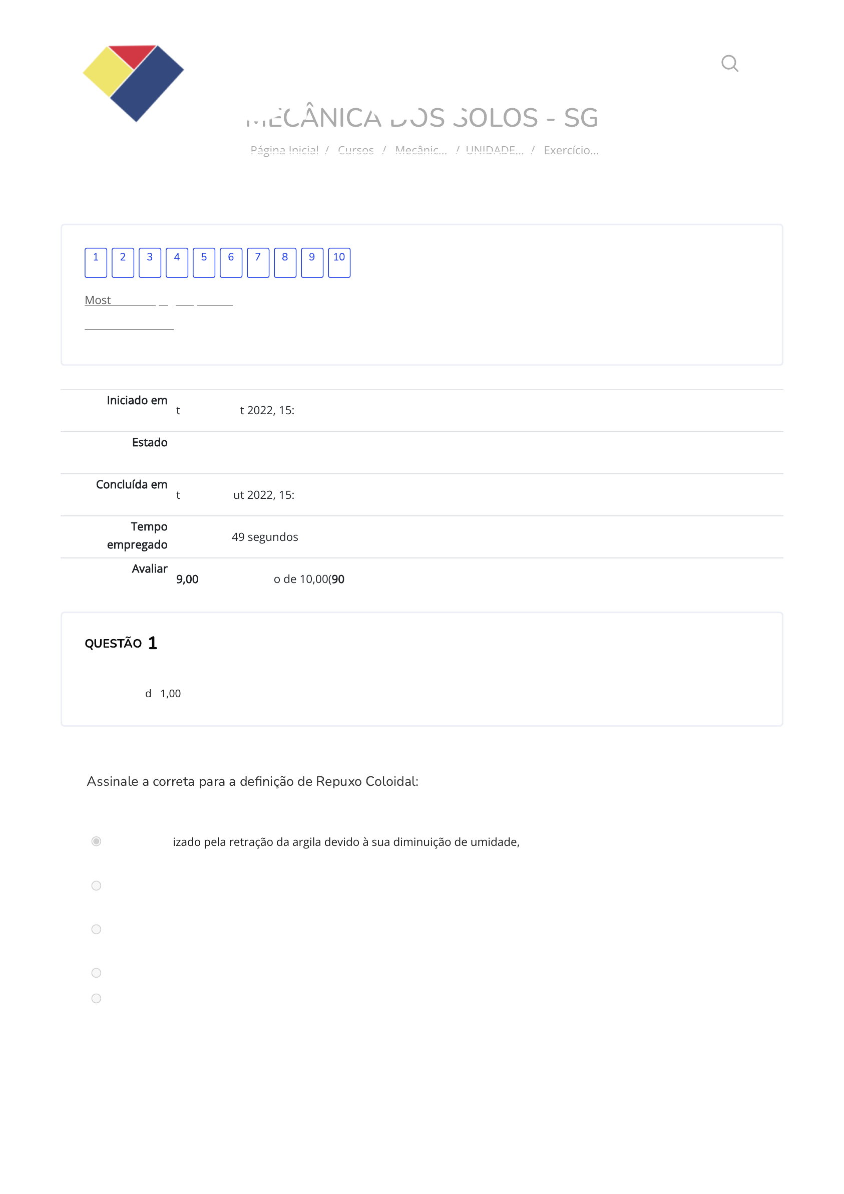 18/10/2022 15:08 Exercícios de Fixação - Aula 01: Tipificação dos Solos: Revisão da tentativa https://cpetead.com.br/mod/quiz/review.php?attempt=3075439&cmid=45839 1/6 MECÂNICA DOS SOLOS - SG Página Inicial / Cursos / Mecânic… / UNIDADE… / Exercício… Iniciado em terça, 18 Out 2022, 15:05 Estado Finalizada Concluída em terça, 18 Out 2022, 15:08 Tempo empregado 2 minutos 49 segundos Avaliar 9,00 de um máximo de 10,00(90%) QUESTÃO Correto Atingiu 1,00 de 1,00 Mostrar uma página por vez Terminar revisão 1 2 3 4 5 6 7 8 9 10 1 Assinale a correta para a de�nição de Repuxo Coloidal: Escolha uma opção: a. É caracterizado pela retração da argila devido à sua diminuição de umidade, o que em contato com a rocha pode gerar tensões capazes de fraturá-la b. Mesmo rochas com uma uniformidade de componentes não têm uma arrumação que permita uma expansão uniforme, pois grãos compridos deformam mais na direção de sua maior dimensão c. Irá ocorrer em um maciço rochoso sempre que da retirada de material sobre ou ao lado do maciço, provocando a sua expansão d. As fraturas existentes nas rochas podem se encontrar parcialmente ou totalmente preenchidas com água e. Processo de decomposição da rocha com a alteração química dos seus componentes Sua resposta está correta. https://cpetead.com.br/ https://cpetead.com.br/course/index.php https://cpetead.com.br/course/view.php?id=1976 https://cpetead.com.br/mod/quiz/view.php?id=45839 https://cpetead.com.br/mod/quiz/review.php?attempt=3075439&cmid=45839&showall=0 https://cpetead.com.br/mod/quiz/view.php?id=45839 https://cpetead.com.br/ 18/10/2022 15:08 Exercícios de Fixação - Aula 01: Tipificação dos Solos: Revisão da tentativa https://cpetead.com.br/mod/quiz/review.php?attempt=3075439&cmid=45839 2/6 QUESTÃO Correto Atingiu 1,00 de 1,00 QUESTÃO Incorreto Atingiu 0,00 de 1,00 2 Associe o termo ao conceito: Podem ser �exíveis ou rígidos. __________ Estruturas de drenagem, dutos, túneis e as obras de contenção como os muros de arrimo, cortinas atirantadas somente podem ser projetadas e construídas usando os princípios da mecânica dos solos. __________ As cargas de qualquer estrutura têm de ser, em última instância, descarregadas no solo. __________ Pavimentos Obras Subterrâneas e Estruturas de Contenção Fundação Sua resposta está correta. 3 Solos orgânicos são aqueles formados pelo deslizamento de solo do topo das encostas. Escolha uma opção: Verdadeiro Falso 18/10/2022 15:08 Exercícios de Fixação - Aula 01: Tipificação dos Solos: Revisão da tentativa https://cpetead.com.br/mod/quiz/review.php?attempt=3075439&cmid=45839 3/6 QUESTÃO Correto Atingiu 1,00 de 1,00 QUESTÃO Correto Atingiu 1,00 de 1,00 4 São solos que permanecem no local de decomposição da rocha: Escolha uma opção: a. Eólicos b. Glaciais c. Aluvionares d. Sedimentares e. Residuais Sua resposta está correta. 5 Associe: Material trifásico, composto basicamente de ar, água e partículas sólidas. __________ Junção da mecânica dos solos, da engenharia de fundações, da mecânica das rochas, da geologia de engenharia e geotecnia ambiental. __________ É o estudo do comportamento de engenharia do solo quando este é usado ou como material de construção ou como material de fundação. __________ Solo Geotecnia Mecânica dos Solos Sua resposta está correta. 18/10/2022 15:08 Exercícios de Fixação - Aula 01: Tipificação dos Solos: Revisão da tentativa https://cpetead.com.br/mod/quiz/review.php?attempt=3075439&cmid=45839 4/6 QUESTÃO Correto Atingiu 1,00 de 1,00 QUESTÃO Correto Atingiu 1,00 de 1,00 6 Associe: É o processo de decomposição da rocha sem a alteração química dos seus componentes. __________ Conjunto de processos físicos, químicos e biológicos pelos quais a rocha se decompõe para formar o solo. __________ Pode-se dizer, que praticamente todo processo depende da presença da água. __________ Intemperismo Físico Intemperismo Intemperismo Químico Sua resposta está correta. 7 O conceito: "O processo de laterização é típico de regiões onde há uma nítida separação entre períodos chuvosos e secos e é caracterizado pela lavagem da sílica coloidal dos horizontes superiores do solo, com posterior deposição desta em horizontes mais profundos, resultando em solos super�ciais com altas concentrações de óxidos de ferro e alumínio". Refere-se a "Solos de Evolução Pedogênica". Escolha uma opção: Verdadeiro Falso 18/10/2022 15:08 Exercícios de Fixação - Aula 01: Tipificação dos Solos: Revisão da tentativa https://cpetead.com.br/mod/quiz/review.php?attempt=3075439&cmid=45839 5/6 QUESTÃO Correto Atingiu 1,00 de 1,00 QUESTÃO Correto Atingiu 1,00 de 1,00 QUESTÃO Correto Atingiu 1,00 de 1,00 8 "Mecanismo que leva a destruição dos silicatos, que são os compostos químicos mais importantes da litosfera". A de�nição diz respeito à (ao): Escolha uma opção: a. Hidrólise b. Repuxo Coloidal c. Degelo d. Carbonatação e. Hidratação Sua resposta está correta. 9 Turfas são solos que incorporam �orestas soterradas em estado avançado de decomposição. Escolha uma opção: Verdadeiro Falso 10 Solos Loéssicos são aqueles formado por deposições sobre vegetais que ao se decomporem deixam seu molde no maciço, o Loess é um solo bastante problemático para a engenharia, pois a despeito de uma capacidade de formar paredões de altura fora do comum e inicialmente suportar grandes esforços mecânicos, podem se romper completa e abruptamente devido ao umedecimento. Escolha uma opção: Verdadeiro Falso 18/10/2022 15:08 Exercícios de Fixação - Aula 01: Tipificação dos Solos: Revisão da tentativa https://cpetead.com.br/mod/quiz/review.php?attempt=3075439&cmid=45839 6/6 ◄ Vídeo Obrigatório 2 - Aula 01: Tipi�cação dos Solos Seguir para... Caracterização dos Solos ► Quem somos Cursos Certi�cação Unidades Contato Copyright © 2021 CPET - Centro de P