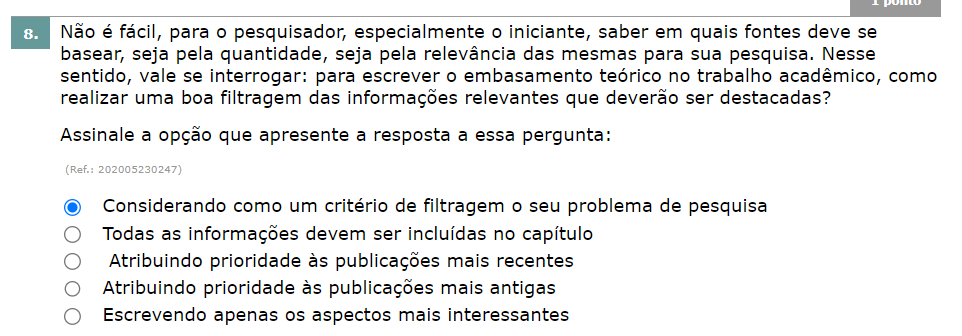 Não é fácil, para pesquisador, especialmente iniciante, saber em quais fontes deve se basear, seja pela quantidade, seja pela relevância das mesmas para sua pesquisa. Nesse sentido, vale se interrogar: para escrever embasamento teórico no trabalho acadêmico, como realizar uma boa filtragem das informações relevantes que deverão ser destacadas? Todas as informações devem ser incluídas no capítulo Atribuindo prioridade às publicações mais recentes Atribuindo prioridade às publicações mais antigas Escrevendo apenas os aspectos mais interessantes