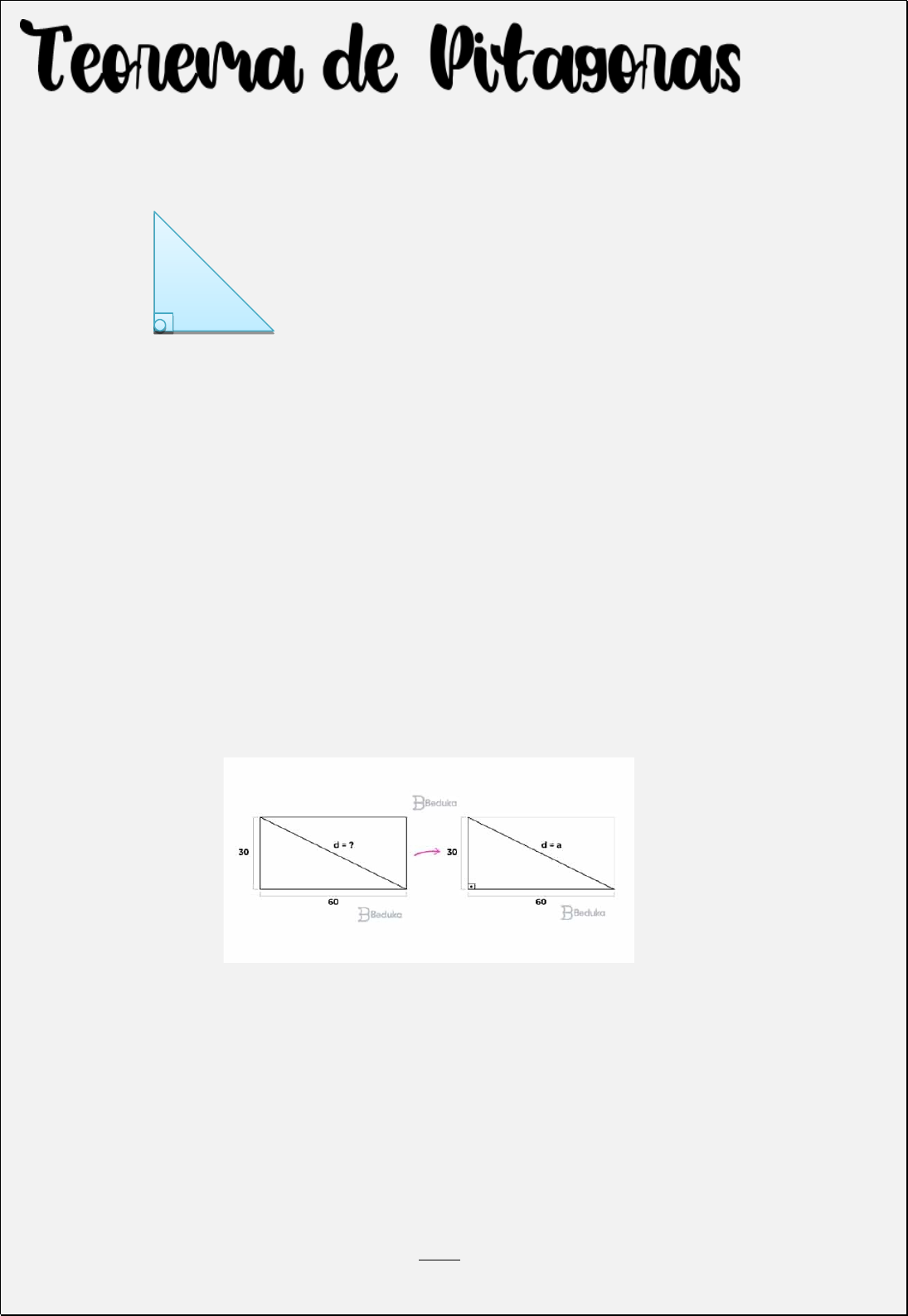 O Teorema de Pitágoras se relaciona as medidas dos lados de triângulos retângulos, ou seja, triângulos que possuem um ângulo interno reto. Nesses triângulos destacamos os seguintes elementos. hipotenusa cateto cateto cateto A hipotenusa é o lado oposto ao ângulo reto, e os outros dois lados são chamados catetos. O Teorema de Pitágoras estabelece a seguinte relação: Em todo triângulo, a soma dos quadrados das medidas dos catetos é igual ao quadrado da medida da hipotenusa. No caso seria (=) Exemplo: 1.Qual é a medida da diagonal de um retângulo cujo lado maior mede 60 cm e o lado menor mede 30 cm? A diagonal de um retângulo divide-o em dois triângulos retângulos iguais, sendo que essa diagonal mede exatamente a hipotenusa do triângulo formado. Como já temos o valor dos dois catetos, basta aplicar a regra do Teorema de Pitágoras para descobrir quanto vale a hipotenusa ( que no caso é a diagonal) = = 900+3600 = (a=67,08 aproximadamente) Um terreno retangular será dividido ao meio, pela sua diagonal, formando dois triângulos retângulos. A metade desse terreno será cercada com 4 fios de arame farpado. Sabendo que as dimensões desse terreno são de 20 metros de largura e 21 metros de comprimento, qual será a metragem mínima gasta de arame? A) 300 metros B) 280 metros C) 140 metros D) 70 metros E) 29 metros A área do triângulo retângulo que possui base medindo 5 cm e hipotenusa medindo 13 cm é igual a: A) 30 cm² B) 60 cm² C) 24 cm² D) 16 cm² E) 12 cm² Analisando os triângulos a seguir, podemos afirmar que a soma x + y é igual a: A) 29 B) 9 C) 30 D) 38 E) 40 Gabarito de Correção Alternativa B Desenhando a situação, temos que: Pelo teorema de Pitágoras, temos que: d² = 30² + 40² d² = 900 + 1600 d² = 2500 d = √2500 d = 50 metros Alternativa A Como o triângulo é retângulo, seja x a sua altura, que coincide com o cateto que não conhecemos, aplicando o teorema de Pitágoras, temos que: x² + 5² = 13² x² + 25 = 169 x² = 169 – 25 x² = 144 x = √144 x = 12 Para calcular a área do triângulo, temos que: Alternativa D Encontrando o valor de x, temos que: 41² = x² + 40² 1681 = x² + 1600 x² = 1681 – 1600 x² = 81 x = √81 x = 9 Encontrando o valor de y: y² = 21² + 20² y² = 441 + 400 y² = 841 y = √841 y = 29 x + y = 9 + 29 = 38
