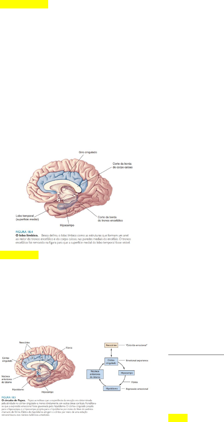 1 P4 1. Conhecer o sistema límbico Lobo límbico de Broca Em um artigo publicado em 1878, o neurologista francês Paul Broca observou que todos os mamíferos possuem, na superfície medial do cérebro, um grupo de áreas corticais que são bastante distintas do córtex circundante. Utilizando a palavra latina para “borda” (limbus), Broca designou essa coleção de áreas corticais como sendo o lobo límbico, porque elas formam um anel, ou borda, ao redor do tronco encefálico. De acordo com essa definição, o lobo límbico consiste no córtex ao redor do corpo caloso, principalmente do giro cingulado, e no córtex na superfície medial do lobo temporal, incluindo o hipocampo. Broca não escreveu sobre a importância dessas estruturas para a emoção, e por algum tempo pensou-se que estivessem envolvidas primariamente com o olfato. A palavra límbico e as estruturas no lobo límbico de Broca, entretanto, foram mais tarde fortemente associadas à emoção. Circuito de Papez Por volta da década de 1930, evidências sugeriram que algumas estruturas límbicas estivessem envolvidas na emoção. Refletindo a respeito de trabalhos anteriores, o neurologista americano James Papez propôs que houvesse, na parede medial do encéfalo, um “sistema da emoção”, que ligaria o córtex com o hipotálamo. A Figura mostra o grupo de estruturas que veio a ser chamado circuito de Papez. Cada uma está conectada com outra por algum importante trato axonal. Papez acreditava, como muitos cientistas hoje em dia, que o córtex estivesse criticamente envolvido com a experiência emocional. Algumas vezes, lesões em certas áreas corticais promovem mudanças profundas na expressão emocional com poucas mudanças na percepção ou na inteligência. Além disso, tumores próximos ao córtex cingulado estão associados com certas perturbações emocionais, incluindo medo, irritabilidade e depressão. Papez propôs que a atividade evocada em outras áreas neocorticais por projeções do córtex cingulado adicionaria o “colorido emocional” Apesar de os estudos anatômicos demonstrarem que os componentes do circuito de Papez estão interconectados, conforme Papez havia proposto, havia apenas evidências sugestivas de que cada uma dessas estruturas estivesse envolvida na emoção. Uma razão pela qual Papez imaginou que o hipocampo estivesse envolvido com a emoção é o fato de que ele é afetado pelo vírus da raiva. Uma indicação de infecção pelo vírus da raiva, e uma ferramenta no seu diagnóstico, é a presença de corpos citoplasmáticos anormais nos neurônios, em especial no hipocampo. Uma vez que a raiva caracteriza-se por uma hiper-responsividade emocional, como medo ou agressividade exagerados, Papez propôs que o hipocampo deveria estar normalmente envolvido na experiência emocional. Embora poucas evidências estivessem relacionadas com o papel do tálamo anterior, relatos clínicos estabeleceram que lesões nessa área promoviam transtornos emocionais aparentes, tais como o riso ou o choro espontâneo. Você talvez tenha percebido a correlação entre os elementos que compõem tanto o circuito de Papez quanto o lobo límbico de Broca. Devido a suas semelhanças, o grupo de estruturas hipoteticamente responsável pela sensação e pela expressão da emoção é frequentemente chamado de sistema límbico, embora a noção anatômica do lobo límbico de Broca nada tivesse a ver, originalmente, com a emoção. O termo sistema límbico foi popularizado em 1952 pelo fisiologista norte-americano Paul MacLean. De acordo com MacLean, a evolução de um sistema límbico permitiu aos animais experimentar e exprimir emoções e os emancipou do comportamento estereotipado ditado pelo tronco encefálico. Definimos um grupo de estruturas anatômicas interconectadas que, a grosso modo, circundam o tronco encefálico, como sistema límbico. Síndrome de Kluver-Bucy: “parecia que tanto a experiência quanto a expressão normal de medo e agressividade estavam intensamente diminuídas pela lobotomia temporal. Praticamente todos os sintomas relatados em macacos foram observados em humanos com lesões no lobo temporal. Além de problemas de reconhecimento visual, tendências orais e hipersexualidade, esses pacientes pareciam tem as emoções atenuadas.” Amígdala 2 Se situa no polo do lobo temporal, logo abaixo do córtex, do lado medial. Seu nome deriva da palavra grega para amêndoa, devido a sua forma. A amígdala é um complexo de núcleos, divididos em três grupos: os núcleos basolaterais, os núcleos corticomediais e o núcleo central. A informação proveniente de todos os sistemas sensoriais alimenta a amígdala, especialmente os núcleos basolaterais. Cada sistemas sensorial apresenta um padrão de projeção diferente para os núcleos da amigdala e interconexões dentro dela, permitindo a integração de informações provenientes de diferentes modalidade sensoriais. Ela se conecta ao hipotálamo pelas vias amigdalofugal ventral e a estria terminal. 2. Descrever como ocorrem os seguintes processos: Os neurônios conhecidos coletivamente como sistemas de moduladores difusos se originam na formação reticular no tronco encefálico e projetam seus axônios para grandes áreas do encéfalo. Existem quatro sistemas moduladores que, em geral, são classificados de acordo com os neurotransmissores que secretam: noradrenérgico (noradrenalina), serotoninérgico (serotonina), dopaminérgico (dopamina) e colinérgico (acetilcolina). Os sistemas moduladores difusos regulam as funções do encéfalo por influenciar a atenção, a motivação, a vigília, a memória, o controle motor, o humor e a homeostasia metabólica. 2.1 Aprendizagem A motivação é definida como os sinais internos que determinam comportamentos voluntários. Alguns destes, como comer, beber, ter relações sexuais, estão relacionados à sobrevivência. Outros, como a curiosidade e ter relações sexuais (novamente), estão associado
