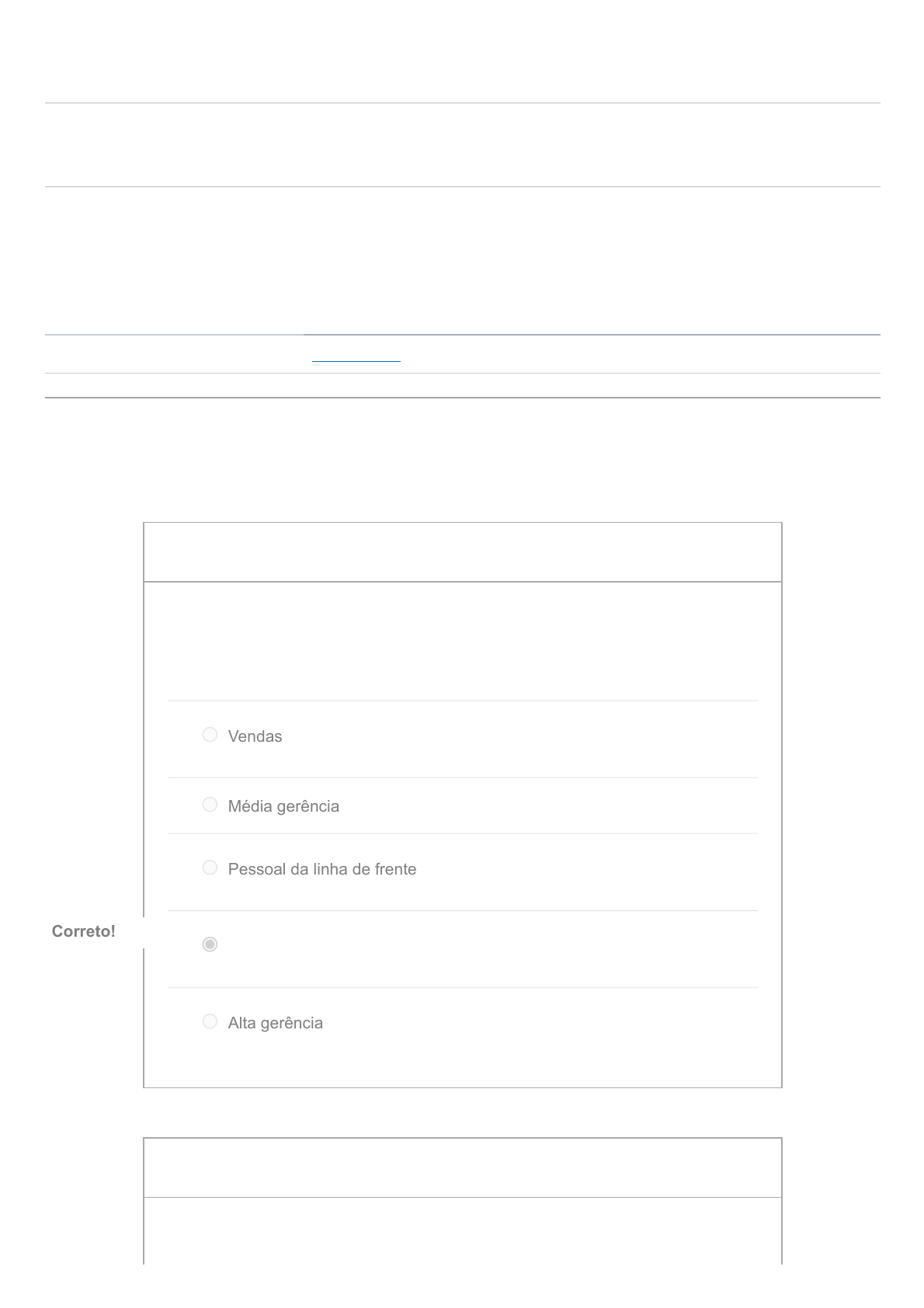 20/09/2022 18:45 Atividade Objetiva 04: Gestão de Negócios - G1/T1 - 2022/2 https://pucminas.instructure.com/courses/112793/quizzes/327633 1/7 Atividade Objetiva 04 Entrega 20 set em 23:59 Pontos 1 Perguntas 10 Disponível 14 set em 0:00 - 20 set em 23:59 Limite de tempo Nenhum Histórico de tentativas Tentativa Tempo Pontuação MAIS RECENTE Tentativa 1 16 minutos 1 de 1 Pontuação deste teste: 1 de 1 Enviado 20 set em 18:45 Esta tentativa levou 16 minutos. 0,1 / 0,1 ptsPergunta 1 No moderno organograma orientado ao cliente, qual dos seguintes pode-se considerar que esteja no topo da pirâmide organizacional? Vendas Média gerência Pessoal da linha de frente Clientes Correto!Correto! Alta gerência 0,1 / 0,1 ptsPergunta 2 https://pucminas.instructure.com/courses/112793/quizzes/327633/history?version=1 20/09/2022 18:45 Atividade Objetiva 04: Gestão de Negócios - G1/T1 - 2022/2 https://pucminas.instructure.com/courses/112793/quizzes/327633 2/7 Qual das seguintes atividades é o primeiro passo na análise de valor para o cliente? Avaliar o desempenho da empresa e dos concorrentes sobre os diferentes valores para os clientes em relação a sua importância nominal. Monitorar os valores para os clientes ao longo do tempo. Avaliar a importância quantitativa dos diferentes atributos e benefícios. Identificar os principais atributos e benefícios valorizados pelos clientes. Correto!Correto! Examinar como os clientes de um segmento específico avaliam o desempenho da empresa. 0,1 / 0,1 ptsPergunta 3 Qual das seguintes afirmações é verdadeira sobre o valor percebido pelo cliente? É a diferença entre a avaliação feita por um potencial cliente de todos os benefícios e todos os custos de um produto e as alternativas percebidas. Correto!Correto! 20/09/2022 18:45 Atividade Objetiva 04: Gestão de Negócios - G1/T1 - 2022/2 https://pucminas.instructure.com/courses/112793/quizzes/327633 3/7 É o processo de investigar a hierarquia dos atributos que os consumidores examinam na escolha de uma marca, quando usam estratégias escalonadas de decisão. É o conjunto dos custos percebidos que os clientes esperam incorrer para avaliar, obter, utilizar e descartar determinado produto. É o valor presente líquido do fluxo de lucros futuros esperados nas compras do cliente ao longo da vida. É o valor monetário percebido do pacote de benefícios econômicos, funcionais e psicológicos que os clientes esperam de um produto. 0,1 / 0,1 ptsPergunta 4 Pode-se definir ____________ como um compromisso profundamente arraigado de comprar ou recomendar repetidamente certo produto ou serviço preferido no futuro, apesar de influências situacionais e ações de marketing potencialmente capazes de causar mudanças comportamentais. Selecione a alternativa que completa corretamente a proposição citada: proposta de valor respeito 20/09/2022 18:45 Atividade Objetiva 04: Gestão de Negócios - G1/T1 - 2022/2 https://pucminas.instructure.com/courses/112793/quizzes/327633 4/7 satisfação valor para o cliente fidelidade Correto!Correto! 0,1 / 0,1 ptsPergunta 5 Alex fez compras na “VeggiesNmore”. Ele ficou satisfeito com a experiência e achou que poderia ser uma alternativa à GreenFoods. No entanto, também está ansioso para experimentar outras lojas da vizinhança. Ele está na fase de ________________ do funil de marketing, no que se refere a fazer compras na “VeggiesNmore”. usuário mais frequente experimentador (não rejeitador) Correto!Correto! usuário frequente aberto a experimentar ciente 0,1 / 0,1 ptsPergunta 6 O fabricante de telefones celulares LZT precisa escolher entre duas opções de fornecedor de peças: a japonesa Keiko Inc. e a norte- americana Global Tech. Como a Keiko pode reduzir o custo total para o cliente em relação à LZT? 20/09/2022 18:45 Atividade Objetiva 04: Gestão de Negócios - G1/T1 - 2022/2 https://pucminas.instructure.com/courses/112793/quizzes/327633 5/7 Investindo no desenvolvimento de marca para os produtos. Melhorando os aspectos funcionais dos produtos. Aumentando os benefícios psicológicos dos produtos. Treinando o pessoal de manutenção para aprimorar suas competências. Absorvendo parte do risco com a oferta de uma garantia. Correto!Correto! 0,1 / 0,1 ptsPergunta 7 Recentemente, a “TBS Bikes” lançou uma linha de bicicletas chamada Surami. O posicionamento central da empresa é “velocidade”. A Surami é uma bicicleta de cinco marchas e, além de velocidade, a empresa promete incluir outros atributos, como segurança, bom desempenho e dispositivos de controle da poluição. Isso descreve ________________ da bicicleta. o sistema de entrega de valor o valor percebido, pelo cliente, a proposta de valor Correto!Correto! o custo total, para o cliente, o benefício total, para o cliente, 20/09/2022 18:45 Atividade Objetiva 04: Gestão de Negócios - G1/T1 - 2022/2 https://pucminas.instructure.com/courses/112793/quizzes/327633 6/7 0,1 / 0,1 ptsPergunta 8 Qual dos seguintes exemplos ilustra um aumento do potencial de crescimento de cada cliente por meio de vendas cruzadas? A 2Wheels incentiva os clientes a enviar sugestões de melhoria do produto. A 2Wheels deixou de oferecer entrega gratuita, passando a cobrar frete quando são para fora da cidade. A 2Wheels mantém um clube para seus clientes fiéis e organiza eventos de ciclismo e festas para eles. A 2Wheels permite que seus clientes adquiram um modelo mais novo por um preço menor que o de tabela, aceitando o modelo antigo como parte do pagamento. Além de bicicletas, a 2Wheels vende acessórios, como capacetes, frascos e casacos, entre outros. Correto!Correto! 0,1 / 0,1 ptsPergunta 9 ___________________ podem monitorar diretamente a satisfação do cliente, medir a intenção de recompra e também avaliar a disposição do consumidor em recomendar a empresa e a marca a outros. Taxas de perda de clientes 20/09/2022 18:45 Atividade Objetiva 04: Gestão de Negócios - G1/T1 - 2022/2 https://pucminas.instr