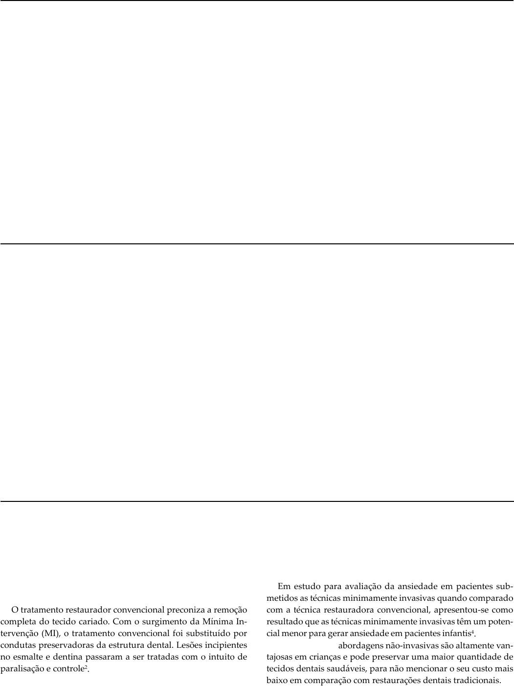 Rev Odontol Bras Central 2017; 26(77): 26-32 26 PesquisaISSN 1981-3708 INTRODUÇÃO Com o avanço da odontologia preventiva e minimamente in- vasiva, o tratamento de lesões de cárie em crianças e adolescen- tes tem sido visto com grande preocupação, a fim de se evitar abordagens invasivas. Assim, medidas preventivas que minimi- zem a instalação e progressão da doença cárie em superfícies oclusais são essenciais1. O tratamento restaurador convencional preconiza a remoção completa do tecido cariado. Com o surgimento da Mínima In- tervenção (MI), o tratamento convencional foi substituído por condutas preservadoras da estrutura dental. Lesões incipientes no esmalte e dentina passaram a ser tratadas com o intuito de paralisação e controle2. Pitts3 (2004), classificou a profundidade da lesão de cárie em quatro regiões: D1 - lesão de cárie em esmalte, sem presença de cavidade; D2 - lesão de cárie em esmalte com presença de cavidade; D3 - lesão de cárie acometendo dentina (com ou sem cavidade); D4 - lesões de cárie que atingem a polpa dental. As lesões de cárie com envolvimento nas regiões D1, D2 e D3 são passíveis de serem tratadas com tratamento não invasivo resul- tando na paralisação, ou até mesmo, na regressão da lesão. Em estudo para avaliação da ansiedade em pacientes sub- metidos as técnicas minimamente invasivas quando comparado com a técnica restauradora convencional, apresentou-se como resultado que as técnicas minimamente invasivas têm um poten- cial menor para gerar ansiedade em pacientes infantis4. Para Bor- ges et al.5 (2012) as abordagens não-invasivas são altamente van- tajosas em crianças e pode preservar uma maior quantidade de tecidos dentais saudáveis, para não mencionar o seu custo mais baixo em comparação com restaurações dentais tradicionais. Embora superfícies oclusais representem apenas 12,5% das superfícies totais da dentição permanente, elas são SELAMENTO DE LESÕES DE CÁRIE OCLUSAIS EM METADE EXTERNA DE DENTINA EM DENTES DECÍDUOS : ESTUDO CLÍNICO RANDOMIZADO EM CRIANÇAS CEARENSES SEALING DENTINAL CARIES LESION IN DECIDUOUS TEETH: CLINICAL TRIAL RANDOMIZED Amanda de Albuquerque VASCONCELOS1; Daniela Cavalcante GIRÃO1; Thaís Manzano PARISOTTO2; José Carlos Pettorossi IMPARATO3 1 - Mestre em Odontopediatria, Doutoranda em Odontopediatria Faculdade São Leopoldo Mandic Campinas-SP; 2 - Mestre e Doutora em Odontopediatria FOP-UNICAMP. Professora do Curso de Odontologia da Universidade São Francisco. Professora do Programa de Pós-graduação da São Leopoldo Mandic em Campinas; 3 - Mestre e Doutor em Ciências Odontológicas – USP. Professor Livre Docente da Disciplina de Odontopediatria da Universidade de São Paulo, Professor do Programa de Pós-graduação da São Leopoldo Mandic em Campinas. RESUMO Objetivo: Avaliar o efeito do selamento de lesões de cárie com resina flow no controle de lesões cariosas oclusais comparado ao tratamento restaurador com resina composta. Material e Méto- do: foram selecionadas 22 crianças na faixa etária de 4 a 9 anos que frequentam a Clínica Infantil da Universidade de Fortaleza (UNIFOR). Foi realizado um exame clínico inicial a fim de sele- cionar molares decíduos apresentando lesão de cárie na superfí- cie oclusal, com envolvimento de dentina e abertura em esmalte menor ou igual a 3 mm. O exame radiográfico foi utilizado para verificar a profundidade da lesão de cárie, onde foram selecio- nadas as lesões que se apresentavam em metade externa de den- tina. As crianças foram divididas aleatoriamente em 2 grupos, onde o primeiro foi realizado o selamento de cárie com resina flow (GRF) e o segundo grupo (GRC) restauração convencional com resina composta (remoção total do tecido cariado). Após 6 meses, 03 pacientes foram perdidos da pesquisa e, os grupos foram avaliados radiograficamente, afim de se verificar o com- portamento das lesões: progressão (escore 2), paralisação (escore 1), ou regressão (escore 0) para o grupo GRF e para o Grupo GRC progressão (escore 2) e paralisação (escore 1). Uma avaliação clí- nica foi conduzida para verificação da integridade dos selamen- tos e das restaurações: retenção completa, parcial, perda total. Os dados foram comparados por meio do teste Mann-Whitney, com nível de significância de 5%. Resultados: não houve dife- rença estatística entre os grupos, onde 90% dos dentes do grupo GRF apresentaram retenção completa do material e em 100% dos casos houve ausência de progressão da lesão. Cem por cento dos molares pertencentes ao grupo GRC apresentaram, reten- ção completa do material, em 100% dos casos houve ausência da progressão da lesão. Conclusão: o selamento de lesão de cárie com resina flow constitui-se uma alternativa conservadora ao tratamento restaurador, propiciando a paralisação de lesões de cárie em metade externa de dentina. PALAVRAS-CHAVE: Dente decíduo. Cárie dentária. Selantes de fossas e fissuras. Samsung X50 Realce Samsung X50 Realce Samsung X50 Realce Rev Odontol Bras Central 2017; 26(77): 26-32 27 PesquisaSelamento de leSõeS de cárie ocluSaiS em metade externa de dentina em denteS decíduoS responsáveis por quase 50% das cáries em crianças em idade escolar6. As lesões de cárie oclusais de dentina/esmalte apresen- tam como peculiaridade a possibilidade de lesões não cavitadas7. Os selantes de fossas e fissuras, fazem parte da mínima interven- ção e são uma forma não invasiva de controle de alguns fatores etiológicos da doença cárie, formando uma barreira mecânica entre o biofilme bacteriano e a superfície dentária8-10. A efeti- vidade da utilização de selantes com cunho preventivo já está fortemente evidenciada na literatura científica, por uma série de estudos clínicos e revisões sistemáticas11-14. Devido ao fato de alguns estudos, sugerirem que não é funda- mental a remoção do tecido infectado com o intuito de paralis