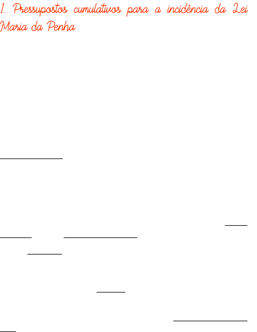 Violência doméstica e familiar Violência doméstica e familiar contra a mulher: Lei Maria da Penha – n. 11.340/06; Violência doméstica e familiar contra a criança e adolescente: Lei Henry Borel – n. 14.344/22. 1. Sujeito passivo: mulher; 2. Violência: art. 7º; 3. Contexto: no âmbito da unidade doméstica, da família ou em relação íntima de afeto (art. 5º). • Violência de gênero: a Lei Maria da Penha se destina às mulheres que se encontrem em uma situação de vulnerabilidade. Assim, é indispensável que a vítima esteja em uma situação de hipossuficiência física ou econômica, isto é, que a infração tenha como motivação a opressão à mulher. • Sujeito ativo: homem ou mulher, de modo que, sendo o agente um homem, a vulnerabilidade da vítima é absoluta; por outro lado, quando o sujeito ativo for mulher, a vulnerabilidade é relativa (depende do caso concreto). → O homem pode ser vítima de violência doméstica e familiar, não se aplicando, todavia, a Lei Maria da Penha, mas sim o art. 129, §9º do CP. → É inaplicável o princípio da insignificância nos crimes ou contravenções praticados contra a mulher no âmbito das relações domésticas (SÚM. 589 STJ). → A Lei Maria da Penha é aplicável às mulheres trans em situação de violência doméstica (STF e STJ). • Elemento subjetivo: é o dolo. Condutas culposas não se enquadram na LMP. 1.1 Âmbito da unidade doméstica → O que se exige é um nexo de causalidade entre a conduta criminosa e a relação de intimidade pré-existente, gerada pelo convívio doméstico, sendo desnecessária a coabitação ou convívio contínuo entre o agressor e a vítima, podendo o contato ocorrer de forma esporádica. → Não é todo e qualquer crime envolvendo relação entre parentes que enseja a aplicação da LMP. → O STJ já entendeu ser a LMP aplicável a crime cometido contra empregada doméstica. → “Relação íntima de afeto”: - 1ª corrente: interpretação ampla que pode abranger amizade/carinho/amor; - 2ª corrente: interpretação restritiva que abrange somente relacionamentos dotados de conotação sexual (mais acertada). → Em se tratando de relação de namoro, a aplicação ou não da LMP dependerá do caso concreto. Art. 5º Para os efeitos desta Lei, configura violência doméstica e familiar contra a mulher qualquer ação ou omissão baseada no gênero que lhe cause morte, lesão, sofrimento físico, sexual ou psicológico e dano moral ou patrimonial: I - no âmbito da unidade doméstica, compreendida como o espaço de convívio permanente de pessoas, com ou sem vínculo familiar, inclusive as esporadicamente agregadas; II - no âmbito da família, compreendida como a comunidade formada por indivíduos que são ou se consideram aparentados, unidos por laços naturais, por afinidade ou por vontade expressa; III - em qualquer relação íntima de afeto, na qual o agressor conviva ou tenha convivido com a ofendida, independentemente de coabitação. Parágrafo único. As relações pessoais enunciadas neste artigo independem de orientação sexual. 1.2 Formas de violência contra a mulher A violência doméstica pode se caracterizar por 5 formas distintas, que poderão ou não tipificar crime, ou seja, não existe um “crime de violência doméstica”. O juízo de tipificação é feito à luz do CP ou da legislação especial, de modo que os incisos do art. 7º da LMP, isoladamente considerados, não constituem crimes. Art. 7º São formas de violência doméstica e familiar contra a mulher, entre outras: I - a violência física, entendida como qualquer conduta que ofenda sua integridade ou saúde corporal; II - a violência psicológica, entendida como qualquer conduta que lhe cause dano emocional e diminuição da autoestima ou que lhe prejudique e perturbe o pleno desenvolvimento ou que vise degradar ou controlar suas ações, comportamentos, crenças e decisões, mediante ameaça, constrangimento, humilhação, manipulação, isolamento, vigilância constante, perseguição contumaz, insulto, chantagem, violação de sua intimidade, ridicularização, exploração e limitação do direito de ir e vir ou qualquer outro meio que lhe cause prejuízo à saúde psicológica e à autodeterminação; III - a violência sexual, entendida como qualquer conduta que a constranja a presenciar, a manter ou a participar de relação sexual não desejada, mediante intimidação, ameaça, coação ou uso da força; que a induza a comercializar ou a utilizar, de qualquer modo, a sua sexualidade, que a impeça de usar qualquer método contraceptivo ou que a force ao matrimônio, à gravidez, ao aborto ou à prostituição, mediante coação, chantagem, suborno ou manipulação; ou que limite ou anule o exercício de seus direitos sexuais e reprodutivos; IV - a violência patrimonial, entendida como qualquer conduta que configure retenção, subtração, destruição parcial ou total de seus objetos, instrumentos de trabalho, documentos pessoais, bens, valores e direitos ou recursos econômicos, incluindo os destinados a satisfazer suas necessidades; V - a violência moral, entendida como qualquer conduta que configure calúnia, difamação ou injúria. CP Art. 147-B. Causar dano emocional à mulher que a prejudique e perturbe seu pleno desenvolvimento ou que vise a degradar ou a controlar suas ações, comportamentos, crenças e decisões, mediante ameaça, constrangimento, humilhação, manipulação, isolamento, chantagem, ridicularização, limitação do direito de ir e vir ou qualquer outro meio que cause prejuízo à sua saúde psicológica e autodeterminação: Pena - reclusão, de 6 (seis) meses a 2 (dois) anos, e multa, se a conduta não constitui crime mais grave. → (Im)possibilidade de aplicação das imunidades absolutas e relativas aos crimes patrimoniais praticados no contexto de violência doméstica e familiar contra a mulher sem o emprego de violência ou grave amea