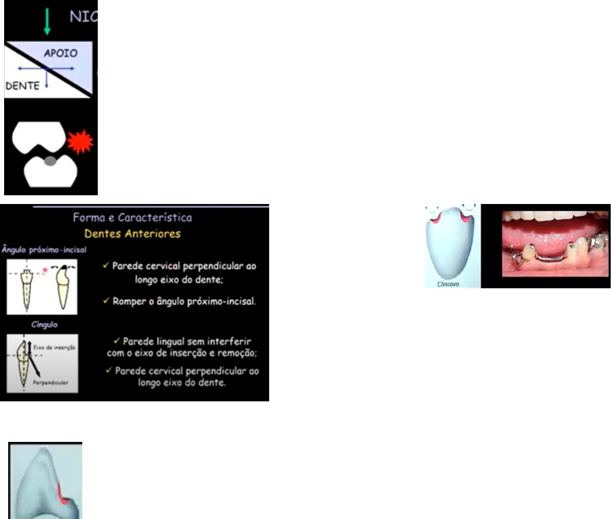 PREPARO DE BOCA II É preparar os locais nos dentes que vão abrigar os componentes da PPR NICHOS · São cavidades preparadas nas superfícies funcionais dos dentes pilares para acomodar os apoios oclusais · Não posso não pensar que se eu só colocar o apoio na tora, o antagonista vai ficar tocando e vai desconfigurar a oclusão (pct reclama que ta alto) NICHOS AUSENTES Haveria transmissão de forças laterais, nocivas aos dentes pilares Não haveria espaço suficiente para os apoios os apoios oclusais ocasionariam contatos prematuros Apoio oclusal metálico colocado sobre a superfície funcional do dente pilar que vai ocluir com o antagonista gera contato prematuro Isso gera forças oclusais que movimentam o dente em movimento de pêndulo luxação então o dente começa a ter movimentos laterais gera uma pressão na região de osso alveolar, e reabsorve. Toda força não fisiológica exercida sobre o osso alveolar gera reabsorção. Essa primeira foto eram os apoios incisais, não são mais usados. Mecanicamente são excelentes porque distribuem a força exatamente no longo eixo do dente; é até melhor que o de cíngulo (força um pouco mais lateral ao longo eixo do dente). Mas tem a questão estética, então o de cíngulo é preconizado. Rompia-se o ângulo proximo-incisal – parecendo preparo de duas classe IV. Apoio de cíngulo. No preparo, a parede lingual deve ser expulsiva/ divergente ou paralela ao longo eixo do dente (não pode interferir com eixo de inserção/remoção). se o apoio entra em área retentiva vai ser difícil pra sair. E a parede cervical vai ser perpendicular ao longo eixo. · Entao é formado um ângulo de 90° entre parece lingual e cervical. · Os angulos internos não podem ser vivos, devem estar sempre arredondados. · E tambem tem que romper a cristazinha permitindo passagem do metal do conector menor. · Preparo pode ser feita com broca esférica e broca cilíndrica *** O cíngulo dos incisivos inferiores é mais delicado, geralmente fazemos acréscimo de resina, já nos incisivos superiores com desgaste. Sempre em ângulo próximo-oclusal; Se for em espaço intercalar vizinho ao espaço protético, se for extremidade livre oposto ao espaço protético Pré molares: posso dividir a distancia mesio-distal em três (1/3 mesial, 1/3 central e 1/3 distal) e a mesma coisa na vestíbulo-lingual. Sempre respeitar esse terço. Não há necessidade de estender mais por uma questão de preservação dentária. Se fosse mais curto ia gerar uma pressão nesse lugar que geraria reabsorção Pode aumentar? Pode, mas não precisa Pode encurtar? Não pode, por uma questão de sobrevida do dente e cuidados com tecido de suporte Nos molares: divido a distancia mesio-distal em quatro terços. Dai vou pegar ¼ para fazer esse nicho O preparo deve ser restrito a esmalte – 1mm PREPARO DE NICHOS 1- Desgaste de esmalte ou amálgama ** em caso de amálgama, ele precisa ter uma estrutura de proteção, em torno de 1mm em cada parede Se você não consegue mensurar o tanto que tem de amalgama, já planeje uma substituição. 2- Resina composta ** quem usa o cíngulo de incisivos inferiores grampo contínuo de Kennedy, geralmente fazemos acréscimo de resina composta, deixando a parede lingual expulsiva e parede pulpar paralelo ao longo eixo. Se eu fizesse desgaste aumentaria risco de fraturar. 3- Enceramento de restaurações indiretas ** em coroas metálicas podemos aumentar esse nicho para que ele ocupe mais de ¼, ocupa quase 2/4 da extensão M-D. isso porque aqui você não precisa ficar preservando estrutura **Fazemos isso na etapa do enceramento, antes de fundir o metal ** quando estamos planejamento uma PPF pra ser um pilar direto, devemos comunicar o laboratório e pedir uma COROA FRESADA, que já vem pronta do laboratório. O nicho e o braço de oposição vao ficar em metal porque são 2 componentes metálicos que vao entrar e sair toda hora, se deixar em cerâmica provavelmente vai quebrar. Então eu deixo essa coroa fresada já com a parte que vai receber os componentes da PPR em metal. PREPARO DE NICHOS POR DESGASTE PREPARO DE CÍNGULO EM DENTES ANTERIORES A broca entra paralela ao longo eixo do dente Tem que deixar a parede lingual sem interferencias no eixo de inserção e remoção. nicho não pode causar problema Ideal entrar só com metade da broca (0,5mm) PREPARO OCLUSO-PROXIMAL EM DENTES POSTERIORES Varrer com a broca sempre de proximal para oclusal. Profundidade de 1mm ficando no máximo em esmalte Trabalhar com metade da broca PREPARO EM DENTES POSTERIORES NÃO VIZINHOS AOS ESPAÇOS PROTÉTICOS Grampos geminados possui uma particularidade na hora do preparo. Quando o braço de oposição sai de dentro do apoio, a cúspide tem que ser protegida para não gerar contato prematuro. Se necessário, romper vertentes proximais até 1mm; tem que ser o suficiente p metal passar sem interferências Princípios dos apoios fixação e suporte então ele vai suportar a prótese sobre o nicho que eu criei (seja por desgaste ou por acréscimo COROAS GUIAS DE DESGASTE · Um dos objetivos do delineamento é eliminar possíveis interferências na inserção na trajetória da peça protética · Planos guia · Confeccionados em duralay · Obter paralelismo das faces axiais Acréscimo de resina area de retenção muito pequena e muito próximo da gengiva. Ou desgasto dente ou acrescento resina*, assim vai aumentar o equador protético e ganhando retentividade. Após fazer o acréscimo tem que moldar de novo e colocar no delineador Outra forma de remover intervenções.