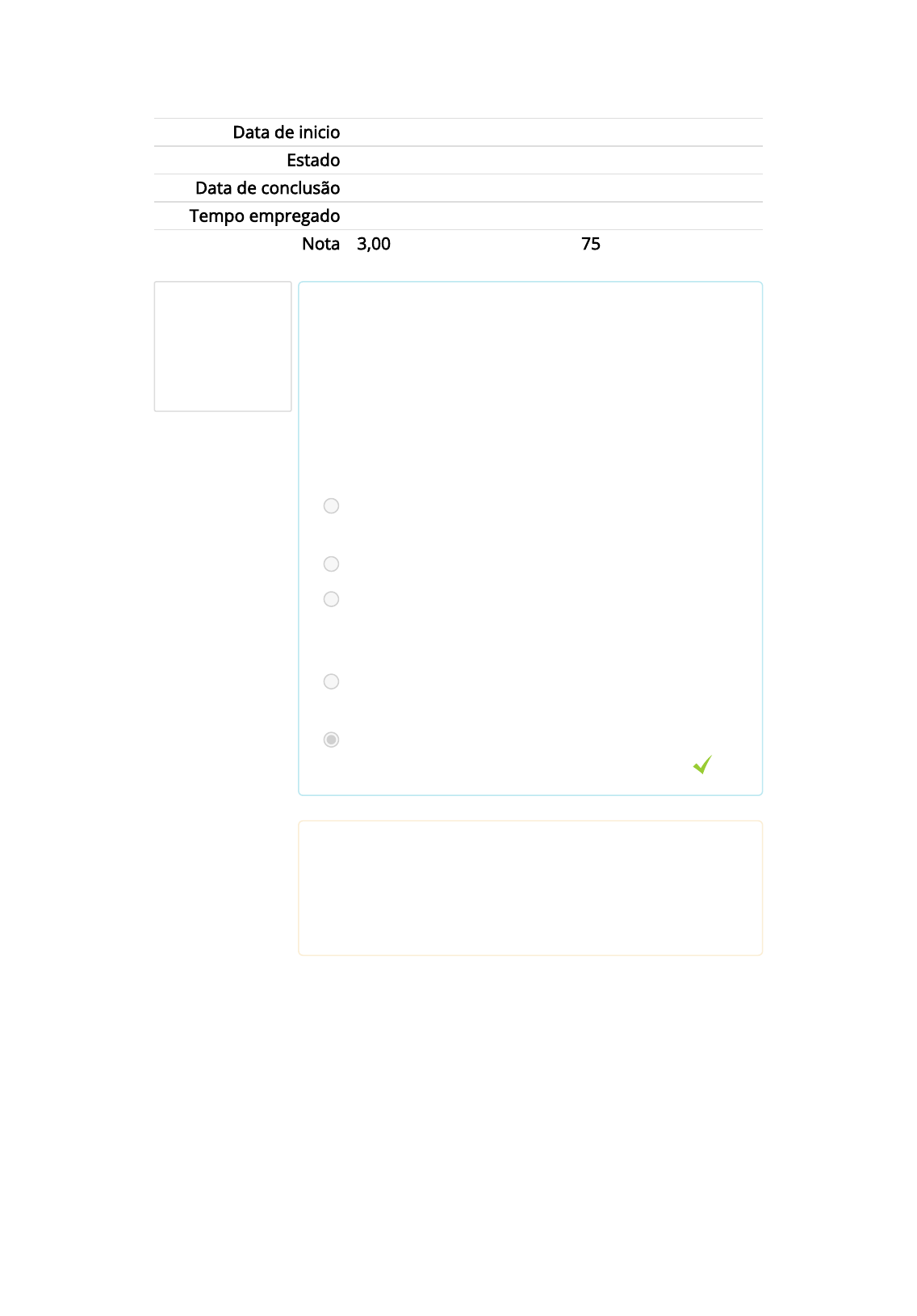 Questão 1 Correto Atingiu 1,00 de 1,00 Escalando Ágeis ► AVALIAÇÃO ► ATIVIDADE DE ESTUDO DE CASO Data de inicio quarta, 19 Out 2022, 17:10 Estado Finalizada Data de conclusão quarta, 19 Out 2022, 17:36 Tempo empregado 26 minutos 20 segundos Nota 3,00 de um máximo de 4,00(75%) Quando estamos trabalhando com diversos projetos ao mesmo tempo a previsibilidade e importante. Como João pode criar previsibilidade de todos os projetos em andamento na organização para não ter surpresas inesperadas próximo as entregas? Escolha uma: a. Criar um grá�co de Burndown único do projeto mais importante b. Nenhuma das alternativas está correta. c. Criar uma caixa de sugestões onde os membros das equipes informam o andamento dos projetos d. Criar um grá�co de Burndown geral somente para a diretoria e. Criar um grá�co de Burndown geral que acomode o andamento de todos os demais Sua resposta está correta. A resposta correta é: Criar um grá�co de Burndown geral que acomode o andamento de todos os demais. https://moodle.universoead.com.br/course/view.php?id=735 https://moodle.universoead.com.br/mod/quiz/view.php?id=9051 Questão 2 Incorreto Atingiu 0,00 de 1,00 Questão 3 Correto Atingiu 1,00 de 1,00 Em projetos de larga escala, o ciclo de vida do software tende a ser expandido. Dentro desse novo ciclo, qual a parte mais importante para ter uma visão clara do que deve ser entregue? Escolha uma: a. Alinhamento dos produtos que devem ser construídos. b. Conhecimento sobre práticas ágeis. c. Nenhuma das alternativas está correta. d. Priorização dos produtos. e. Treinamento da equipe. Sua resposta está incorreta. A resposta correta é: Alinhamento dos produtos que devem ser construídos.. Em termos das práticas ágeis, varias delas devem ser consideradas no momento do escalonamento. No cenário do João, quais delas ele deveria considerar para que o escalonamento seja considerado um sucesso? Escolha uma: a. Nenhuma das alternativas está correta. b. Plano de roadmap, o planejamento da Sprint, as reuniões diárias, a revisão e a retrospectiva c. Plano de release, o planejamento da Sprint, as reuniões diárias, a revisão e a confraternização d. Plano de release, o planejamento da confraternização, as reuniões diárias, a revisão e a retrospectiva e. Plano de release, o planejamento da Sprint, as reuniões diárias, a revisão e a retrospectiva Sua resposta está correta. A resposta correta é: Plano de release, o planejamento da Sprint, as reuniões diárias, a revisão e a retrospectiva. Questão 4 Correto Atingiu 1,00 de 1,00 Para escalonar a equipe existem algumas possíveis estratégias para criar uma equipe homogênea e difundir a cultura de agilidade por toda a organização. Qual estratégia João poderia utilizar? Escolha uma: a. Nenhuma das alternativas está correta. b. Adicionar 1 ou 2 novos membros à sua equipe para que os mesmos sejam treinados e recebam uma carga de experiência assistida, como se fosse uma residência médica. c. Dividir a equipe meio a meio pois dessa forma a disseminação ocorre mais rapidamente d. Adicionar somente membros novos para evitar a contaminação com as ideias anteriores e. Colocar somente um membro experiente em Scrum em uma equipe nova Sua resposta está correta. A resposta correta é: Adicionar 1 ou 2 novos membros à sua equipe para que os mesmos sejam treinados e recebam uma carga de experiência assistida, como se fosse uma residência médica..