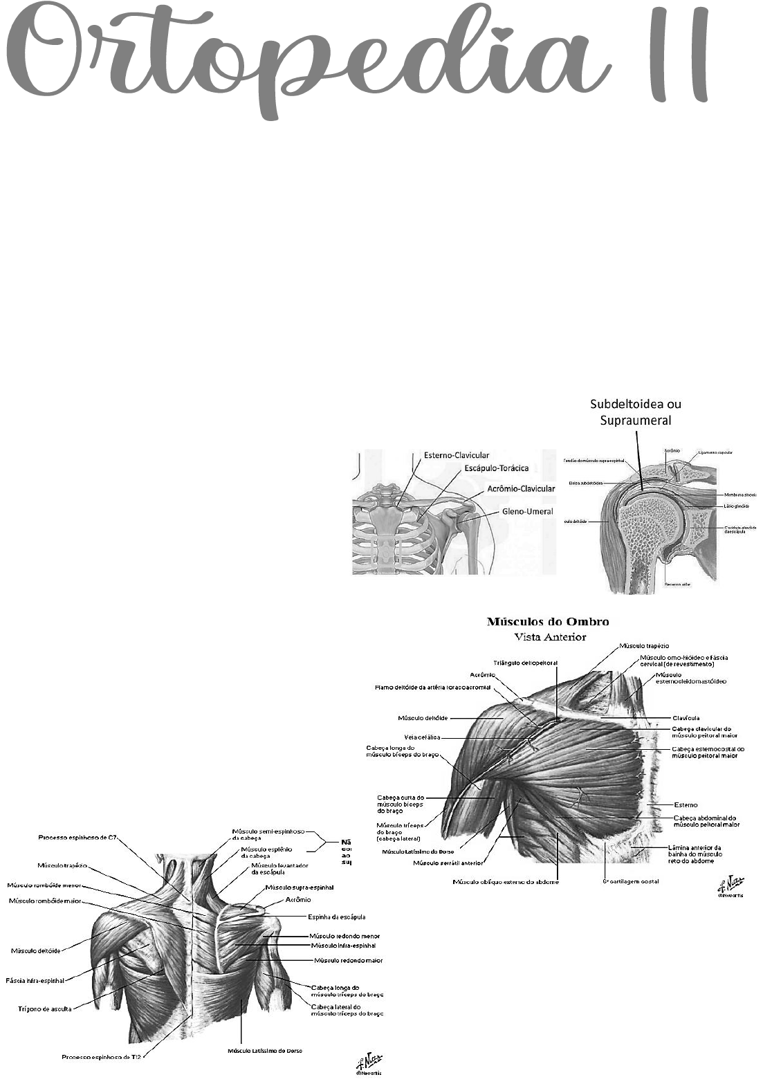 Membros Superiores (Ombro) • Articulação com maior capacidade e amplitude de movimento sendo uma das mais instáveis e luxadas • Para ficar estável é necessária uma harmonia sincrônica e constante entre todas as estruturas estáticas e dinâmicas que mantêm sua biomecânica normal. • Articulação primordial em AVD que passa por um uso excessivo e repetitivo em atividades, gerando traumas constantes facilitando patologias Estabilizadores estáticos dinâmicos ✓ Cavidade glenóide. ✓ M manguito rotador ✓ Lábio glenóide. ✓ M. escapuloumerais. ✓ Cápsula articular (balanço entre eles é pela ✓ Lig. Glenoumerais estabilidade da articulação) Articulações Síndrome do Impacto • Superfície inferior e anterior do acrômio. • Ligamento coracoacromial. • Articulação acromioclavicular. Área Crítica de Coodman: • Onde inicia degeneração do manguito. • Próximo a inserção do m. supraespinal e junto ao tubérculo maior do úmero. • Cerca de 1cm de largura. • Local vulnerável onde ocorre o impacto ✓ A SI é semelhante a uma ler/dort, que pode ser causada pelo excesso de movimentos com o ombro em abdução maior do que 90º de amplitude ou por um trauma. ✓ É uma denominação geral de algumas lesões no ombro, como as tendinites, bursites etc. ✓ Uma das causas mais comuns de dores no ombro em adultos. ✓ Resulta de uma pressão na musculatura do ombro (manguito rotador) exercida por parte da escápula quando o braço é elevado, por diminuição do espaço subacromial Compressão mecânica das estruturas sub acromiais: ✓ Tendão do supra espinhoso. ✓ Porção longa do bíceps. ✓ Bursa sub acromial. ✓ Em menor extensão, o tendão do infra espinhoso. Etiologia multifatorial 1. Tendinite dos músculos do manguito 2. Lassidão (comum no esporte) ou retração da cápsula. 3. Mudanças degenerativas (osteófitos). 4. Desvios posturais. 5. Função inadequada do manguito. 6. Hipomobilidade. 7. Entesopatia. 8. Sobrecarga de uso 9. Tipos de acrômio (Bigliani). QUADRO CLiNICo 1. DOR: principal sintoma. 1) início insidioso e de longa duração. 2) Região antêro-lateral do ombro e face lateral do braço. 3) Intensidade variável. 4) Maioria: dor noturna 5) Não consegue se deitar sobre o lado doloroso. 2. ADM diminuída. 3. Crepitação. 4. Perda da força muscular 5. Hipotrofia Incidencia 1. 95% das lesões são relacionadas ao 2. impacto. (esportes de arremesso) 3. Ambos os sexos 4. Formato do acrômio. 5. Osteoartrose Impacto Secundário: ➙ Alongamento progressivo da cápsula Aumento do volume capsular. . ↲ ↳ Instabilidade. ➙ Microtraumas nos tendões. (choque com o arco coracoacromial) Quem pode desenvolver? 1. Atletas: • Nadadores. • Beisebol. • Tênis. • Vôlei .• Basquete. • Handebol. 2. Sedentários: • Marceneiros. • Metalúrgicos. • Pintores .• Faxineiras. • Donas de casa. • Domésticas Lesão do manguito rotador • Ruptura parcial: dificuldade ao movimento (arco doloroso) • Ruptura total: impossibilidade de iniciar a abdução • Alteração degenerativa com a idade ou por queda. • Supra espinhoso ➙ tendões próximos do infra espinhoso e sub escapular ➙ cápsula articular (pois a ruptura é próximo à inserção) Prevalencia 1. Prevalência de 7 a 40% 2. Aumenta com a idade. 3. Inicia-se na 5ª década. entre 60 e 70 anos Estagios 1. Tendinite: Acomete jovens de 20-40 anos principalmente esportistas que fazem movimentos repetitivos e vigorosos de abdução e flexão do braço acima de 90º. É caracterizado por: ✓ Edema. ✓ Hemorragia, hiperemia. ✓ Bursit.e ✓ Dor à movimentação 2. Tendinose e Tendinopatia: Atinge pessoas de 40-50 anos. É caracterizado por: ✓ Tendinite e fibrose do manguito rotador (principalmente do supraespinhal). ✓ Bursite subacromial (geralmente secundária ao processo patológico dos tendões) ✓ Dor ao movimento e ao repouso. ✓ Rubor, Calor e Perda da Função. ✓ Crepitação ✓ Diminuição ADM. ✓ Diminuição de FM. 3. Ruptura: Atinge indivíduos acima de 50 anos. É caracterizado por: ✓ Aparecimento de osteófitos no acrômio, articulação acrômio-clavicular e tubérculo maior do úmero por ruptura ✓ Não sustenta o braço em movimento. ✓ Exposição da cartilagem e da cabeça longa do bíceps. CLASSIFICAcaO 1. Ruptura menor de ¼ da espessura do tendão e profundidade menor que 3mm. 2. Ruptura menor que ½ da espessura e profundidade entre 3 e 6mm 3. Ruptura maior que ½ da espessura e mais de 6mm de profundidade. TRATAMENTO • Tratamento Conservador: cuidados anti- inflamatórios, analgésicos e fisioterapêuticos. • Tratamento Cirúrgico: feitas por via artroscópica que gera menor esgotamento de forças pós-operatória e a recuperação mais rápida: 1. Acromioplastia., 2. Bursectomia. 3. Sutura de manguito. 4. Artroplastia: substituição da articulação por prótese. Tendinites Tendinopatia do supraespinhal – T. Calcarea A estrutura que mais sofre sobrecarga excessiva é o músculo supraespinhal, por estar situado entre duas estruturas ósseas, que pode sofrer compressões durante os movimentos de abdução ou flexão do úmero. Compressões indevidas provocam distúrbios biomecânicos significativos, como a tendinopatia do supraespinhal. → O músculo supraespinhal é o abdutor do úmero, que como o deltoide realiza tanto a flexão como a abdução → O supraespinhal é constante em toda ADM e superior ao deltoide para os primeiros 45º de abdução. → Quando o deltoide está paralisado, o supraespinhal consegue abduzir o braço sozinho por quase toda a ADM apesar do movimento ser fraco • Pode evoluir para uma micro/macro lesão até ruptura • 1/3 dos casos de ombro doloroso (fase da Síndrome do Impacto) • Processo degenerativo ➙ precipitação de cálcio entre as fibras musculares (tendão do supra espinhoso) ➙ inflamação (reação) no tendão e na bolsa sub acromial ➙ cálcio perfura o tendão e 