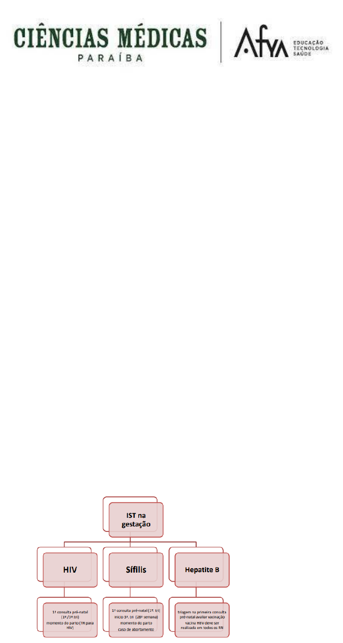 Sistemas Orgânicos Integrados IV – TICs Aluna: Anna Beatriz Gomes Moreira TRIAGEM DE IST’S NA GESTAÇÃO A triagem de IST’S na gestação tem como intuito principal a prevenção da transmissão vertical, de abortos espontâneos, má formações, doenças congênitas ou fatores que levem a morte do recém-nascido. Assim, é fornecida pelo SUS a triagem do vírus HIV, hepatite e sífilis, e em alguns casos, quando disponível a detecção de gonorreia e clamídia. O vírus do HIV deve triado na primeira consulta feita no pré-natal, ocorrendo no primeiro e no terceiro trimestre gestacional, mas quando a mãe, por motivos diversos não faz o pré-natal, o diagnóstico é realizado no momento do parto por intermédio do teste rápido. No primeiro trimestre gestacional ou quando dá inicio ao pré-natal é realizada a pesquisa para hepatite B, podendo dar negativo ou positivo. A sucessão do pré-natal varia a depender do resultado. A pesquisa para hepatite C não é realizada, pois a intervenção medicamentosa é quase inexistente. A sífilis pode ser detectável no rastreio, na primeira consulta, no primeiro trimestre de gravidez e na 28ª semana. É importante realizar, também, no momento do parto, independente dos resultados anteriores e em casos de abortamento. Como já citado, a triagem para gonorreia e clamídia é realizada apenas quando disponível em mães de 15 a 24 anos. Vale salientar que um pré-natal bem sucedido apresenta um êxito na saúde publica e individual, amenizando os índices de óbitos feitais, de recém-nascidos e de mães. FONTE:FOTOS GOOGLE REFERÊNCIA ATENÇÃO AO PRÉ NATAL RI SCO HABITUAL CADE RNO DE AT ENÇÃO AO PRÉ-NATAL RISCO HABITUAL . [s.l.: s.n., s.d.]. Disponível em: <https://www.saude.pr.gov.br/sites/default/arquivos_restritos/files/documento/2020-07/pdf6.pdf>.