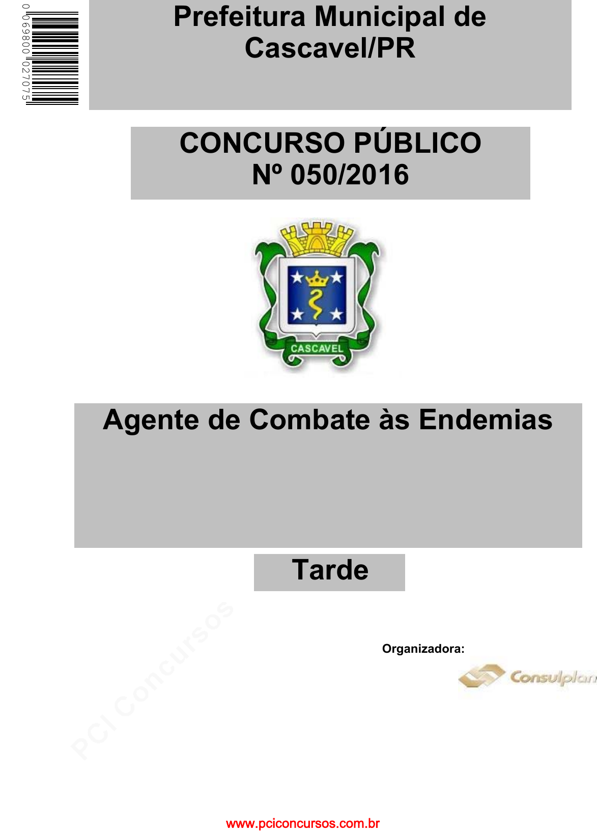 pcimarkpci MDAwMDowMDAwOjAwMDA6MDAwMDowMDAwOmZmZmY6YmIzMTo1M2M0:V2VkLCAxOSBPY3QgMjAyMiAxNjowMzoxOCAtMDMwMA== www.pciconcursos.com.br Agente de Combate às Endemias CONCURSO PÚBLICO Nº 050/2016 Organizadora: Prefeitura Municipal de Cascavel/PR 0 6 9 8 0 0 0 2 7 0 7 5 0 Tarde www.pciconcursos.com.br pcimarkpci MDAwMDowMDAwOjAwMDA6MDAwMDowMDAwOmZmZmY6YmIzMTo1M2M0:V2VkLCAxOSBPY3QgMjAyMiAxNjowMzoxOCAtMDMwMA== www.pciconcursos.com.br CONCURSO PÚBLICO – PREFEITURA MUNICIPAL DE CASCAVEL/PR Cargo: Agente de Combate às Endemias (03-T) Prova aplicada em 22/05/2016 – Disponível no endereço eletrônico www.consulplan.net a partir do dia 23/05/2016. - 2 - CCAARRGGOO:: AAGGEENNTTEE DDEE CCOOMMBBAATTEE ÀÀSS EENNDDEEMMIIAASS CONHECIMENTOS GERAIS LÍNGUA PORTUGUESA Gravidez na adolescência Denomina-se gravidez na adolescência a gestação ocorrida em jovens de até 21 anos que se encontram, portanto, em pleno desenvolvimento dessa fase da vida – a adolescência. Esse tipo de gravidez em geral não foi planejada nem desejada e acontece em meio a relacionamentos sem estabilidade. No Brasil os números são alarmantes. Cabe destacar que a gravidez precoce não é um problema exclusivo das meninas. Não se pode esquecer que embora os rapazes não possuam as condições biológicas necessárias para engravidar, um filho não é concebido por uma única pessoa. E se é à menina, que cabe a difícil missão de carregar no ventre, o filho, durante toda a gestação, de enfrentar as dificuldades e dores do parto e de amamentar o rebento após o nascimento, o rapaz não pode se eximir de sua parcela de responsabilidade. Por isso, quando uma adolescente engravida, não é apenas a sua vida que sofre mudanças. O pai, assim como as famílias de ambos, também passa pelo difícil processo de adaptação a uma situação imprevista e inesperada. Essa situação favoreceu o surgimento de uma geração cujos valores éticos e morais encontram-se desgastados. O excesso de informações e liberdade recebida por esses jovens os levam à banalização de assuntos como o sexo, por exemplo. Essa liberação sexual, acompanhada de certa falta de limite e responsabilidade é um dos motivos que favorecem a incidência de gravidez na adolescência. Outro fator que deve ser ressaltado é o afastamento dos membros da família e a desestruturação familiar. Seja por separação, seja pelo corre-corre do dia a dia, os pais estão cada vez mais afastados de seus filhos. Isso além de dificultar o diálogo de pais e filhos, dá ao adolescente uma liberdade sem responsabilidade. Ele passa, muitas vezes, a não ter a quem dar satisfações de sua rotina diária, vindo a procurar os pais ou responsáveis apenas quando o problema já se instalou. A adolescência já é uma fase complexa da vida. Além dos hormônios, que nessa etapa afloram causando as mais diversas mudanças no adolescente, outros assuntos preocupam e permeiam as mentes dos jovens: escola, vestibular, profissão etc. A gravidez, por sua vez, também é uma etapa complexa na vida. Ter um filho requer desejo tanto do pai quanto da mãe, mas não só isso. Atualmente, com problemas como a instabilidade econômica e a crescente violência, são necessários, além de muita consciência e responsabilidade, um amplo planejamento. Quando isso não acontece, a iminência de acontecerem problemas é muito grande. A adolescência é o momento de formação escolar e de preparação para o mundo do trabalho. A ocorrência de uma gravidez nessa fase, portanto, significa o atraso ou até mesmo a interrupção desses processos. O que pode comprometer o início da carreira ou o desenvolvimento profissional. (Disponível em: http://www.infoescola.com/sexualidade/gravidez-na-adolescencia/. Acesso em: 22/04/2016. Adaptado.) 01 O assunto principal tratado no texto é A) o início da atividade sexual. B) a falta de perspectiva dos jovens. C) as sérias consequências da gravidez na adolescência. D) a importância do uso do preservativo nas relações sexuais. E) a insegurança financeira e a dificuldade de educar uma criança. 02 De acordo com as ideias do texto, é correto afirmar que A) a gravidez precoce gera conflito interior. B) deve-se evitar uma gravidez antes do tempo ideal. C) a adolescência é interrompida quando a jovem engravida. D) a gravidez precoce é um problema exclusivo das meninas. E) no Brasil os números de gravidez na adolescência são preocupantes. www.pciconcursos.com.br pcimarkpci MDAwMDowMDAwOjAwMDA6MDAwMDowMDAwOmZmZmY6YmIzMTo1M2M0:V2VkLCAxOSBPY3QgMjAyMiAxNjowMzoxOCAtMDMwMA== www.pciconcursos.com.br CONCURSO PÚBLICO – PREFEITURA MUNICIPAL DE CASCAVEL/PR Cargo: Agente de Combate às Endemias (03-T) Prova aplicada em 22/05/2016 – Disponível no endereço eletrônico www.consulplan.net a partir do dia 23/05/2016. - 3 - 03 No trecho “Ele passa, muitas vezes, a não ter a quem dar satisfações de sua rotina diária, vindo a procurar os pais ou responsáveis apenas quando o problema já se instalou.” (4º§), o termo destacado, de acordo com o contexto textual, se refere a A) filho. D) filho com problema de saúde. B) bebê. E) desenvolvimento profissional. C) adolescente. 04 No trecho “Por isso, quando uma adolescente engravida, não é apenas a sua vida que sofre mudanças.” (2º§), a expressão “quando” expressa ideia de A) tempo. B) escolha. C) equilíbrio. D) relevância. E) determinação. 05 Em “A adolescência já é uma fase complexa da vida.” (5º§), o termo destacado pode ser substituído, sem alteração de sentido, por A) escassa. B) discutível. C) complicada. D) espontânea. E) imperceptível. 06 Das afirmativas transcritas do texto, assinale a que exprime circunstância de tempo. A) “No Brasil os números são alarmantes.” (1º§) B) “Ter um filho requer desejo tanto do pai quanto da mãe, mas não só isso.” (6º§) C) “O que pode comprometer o início da carreira ou o desenvolvimento profissional.” 