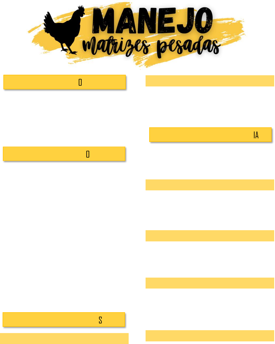 Stephanie Lima @tell_lima | Zootecnia - UFAPE A realização de um manejo adequado é de extrema importância, pois faz com que os animais cresçam de acordo com as recomendações, o lote seja uniforme e os ovos sejam produzidos com qualidade e tragam um retorno econômico. Cria (0 a 4 semanas): - Crescimento normal, com formação óssea e massa muscular; - Nessa fase ocorre o maior desenvolvimento do animal. Recria (5 a 18 semanas): - Não existe estimulo hormonal até a 10ª semana; - A partir da 13ª semana tem o início da produção. Pré-postura (18 a 23 semanas): - Preparação para postura (reserva energética); Produção (24 a 65 semanas): - Início da produção até o pico de postura; - Bico de produção ao abate. LAVAGEM E DESINFECÇÃO Limpeza a seco; Lavagem; Desinfecção. CAMA Bom material; Livre de microrganismos; Manejo para manter a qualidade. Esse manejo tem por objetivo favorecer a obtenção de frangas de qualidade a baixo do curto e de alta produtividade. PREPARO PARA O RECEBIMENTO DOS PINTOS Instalações limpas; Temperatura ambiente adequada; Abastecer comedouros e bebedouros. RECEPÇÃO DOS PINTOS MATRIZES Descarregamento cuidadoso; Pesar, contar e avaliar qualidade; Observar comportamento das aves. DENSIDADE DE CRIAÇÃO Produção = densidade de fêmeas Galpões abertos: 4,5 aves/m2 Galpões fechados: 5,5 aves/m2 Machos: 3,5 aves/m2 DEBICAGEM Tem por objetivo evitar o canibalismo e melhorar a conversão alimentar das aves. Esse processo pode ser realizado com um debicador ou com lâmpadas infravermelhas. A intensidade deve INTRODUÇÃO FASES DE CRIAÇÃO PREPARO DAS INSTALAÇÕES MANEJO NA FASE DE CRIA E RECRIA Stephanie Lima @tell_lima | Zootecnia - UFAPE ser leve e o recomendado é realizar o procedimento entre o 5º e o 7º dia de vida e fazer o repassa na 18ª semana de idade. Aspectos importantes: A debicagem deve ser feita por pessoas treinadas e em dias frescos, é necessário realizar a contenção adequada da ave e utilizar o equipamento de forma correta. É importante manter água fresca para as aves. CONTROLE DO PESO E UNIFORMIDADE O controle tem por objetivo acompanhar o desenvolvimento corporal das aves, utilizando técnicas de manejo adequadas. O controle do ganho de peso é realizado a partir de pesagens semanais dos animais. As aves são pesadas ao chegar no galpão e semanalmente até a transferência (20ª semana), a pesagem é individual e as aves são escolhidas aleatoriamente em vários pontos do galpão (amostra homogênea), todos os dados devem ser anotados para posterior avaliação. CÁLCULO DE UNIFORMIDADE: EXEMPLIFICANDO: Número de aves pesadas: 150 Peso médio das aves: 1230g Limite de intervalo de avaliação Número de aves dentro do limite: 122 UNIFORMIDADE: 122/150 x 100 = 81,33% METAS E CLASSIFICAÇÃO DE UNIFORMIDADE: METAS DE UNIFORMIDADE Idade (semanas) Metas de uniformidade (%) 1 a 8 90 8 a 12 85 A partir de 12 80-85 CLASSIFICAÇÃO DE UNIFORMIDADE Uniformidade % de aves Excelente 80 Bom 75 Ruim Inferior a 70 RESTRIÇÃO ALIMENTAR Tem o objetivo de controlar o peso das aves, permitindo um desenvolvimento corporal e uma maturação fisiológica adequada no início da postura, e consequentemente, obter: - Uniformidade de peso; - Maturidade sexual no período recomendado; - Maior peso dos primeiros ovos; - Maior produção de ovos durante a vida produtiva; - Ovos incubáveis (OBI); - Maior qualidade de pintos produzidos; - Menor custo do pinto produzido; - Melhores índices (fertilidade, incubalidade, etc.); - Menor taxa de mortalidade; TIPOS DE RESTRIÇÃO ALIMENTAR: TIPO REQUERIMENTO DE ALIMENTO AO DIA seg Ter qua qui sex sáb dom Todo dia 6 e1 5 e 2 4 e 3 skip a day MANEJO NA FASE DE CRIA E RECRIA Stephanie Lima @tell_lima | Zootecnia - UFAPE A restrição alimentar é feita com o objetivando melhorar a absorção de nutrientes e a qualidade da cama. Ao optar por esse tipo de manejo é necessário levar em consideração: - Localização da granja; - Época do ano; - Temperatura média diária; - Idade do lote; - Equipamentos. FLESHING – CONFORMAÇÃO DE PEITO: A partir da 16ª semana de idade das fêmeas, além da obtenção do peso médio deve-se observar a conformação do score de peito através da técnica de Fleshing, considerando como ideal o socre entre 3 e 4. É importante que as aves apresentem peso acima do padrão em torno de 40%, como reserva energética na fase de produção dos ovos. Na fase de produção dessas aves haverá o retorno econômico do investimento feito. NUTRIÇÃO E EXIGÊNCIAS NUTRICIONAIS As matrizes possuem exigências de mantença, crescimento e produção. E essas exigências por sua vez sofrem a interferência de fatores como: linhagem, idade, peso, clima, fase de produção, etc. As matrizes que são alimentadas à vontade, consomem mais energia para mantença e produção, e esse excesso de energia consumido é armazenado, transformando-se em gordura, o que acarretará em: aumento de peso corporal; redução da fertilidade, produção de ovos e eclodibilidade. Por esses motivos as matrizes devem receber uma alimentação controlada, a fim de manter a sua eficiência produtiva. ENERGIA: É considerado um elemento crítico para matrizes, pois está ligada a mantença, crescimento, produção e reprodução. Durante a formulação das rações deve-se atentar aos valores energéticos dos alimentos. Uma forma de aumentar a concentração energética da dieta é a partir da inclusão de gorduras e óleos. A necessidade das aves em energia varia de acordo com a linhagem, idade, peso e temperatura ambiente (maior temp. = menor consumo de alimento). PROTEINA BRUTA (PB): Ao adicionar fontes de proteína em uma dieta deve-se considerar as exigências de aminoácidos essenciais, as quais variam de acordo com a fase de produção. Com o uso de níveis adequados de proteína pode-se observar um melhor desempenho das aves. MINERAIS (M): O fornecimento de níveis adequados e o equilíbrio dos m