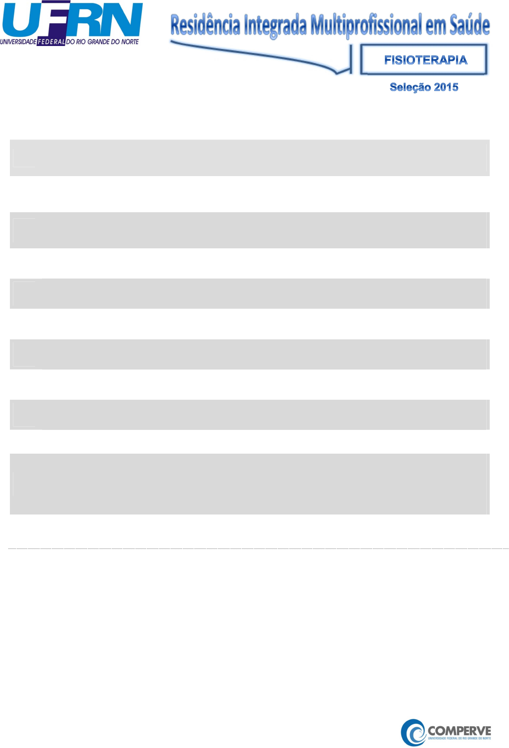 UFRN � Residência Integrada Multiprofissional em Saúde � 2015 Leia estas instruções: 1 Confira se os dados contidos na parte inferior desta capa estão corretos e, em seguida, assine no espaço reservado para isso. 2 Este Caderno contém cinquenta questões de múltipla escolha assim distribuídas: 01 a 10 > Saúde Pública; 11 a 50 > Conhecimentos Específicos. 3 Se o Caderno estiver incompleto ou contiver imperfeição gráfica que impeça a leitura, solicite imediatamente ao Fiscal que o substitua. 4 Cada questão apresenta quatro opções de resposta, das quais apenas uma é correta. 5 Interpretar as questões faz parte da avaliação; portanto, não adianta pedir esclarecimentos aos Fiscais. 6 Utilize qualquer espaço em branco deste Caderno para rascunhos e não destaque nenhuma folha. 7 Os rascunhos e as marcações feitas neste Caderno não serão considerados para efeito de avaliação. 8 Use exclusivamente caneta esferográfica, confeccionada em material transparente, de tinta preta ou azul. 9 Você dispõe de, no máximo, quatro horas para responder às questões de múltipla escolha e preencher a Folha de Respostas. 10 O preenchimento da Folha de Respostas é de sua inteira responsabilidade. 11 Ao retirar-se definitivamente da sala de provas, o candidato deverá entregar ao Fiscal a Folha de Resposta independentemente do tempo transcorrido do início da prova. Retirando-se antes de decorrerem três horas do início da prova, devolva também este Caderno. Você só poderá levar este Caderno após decorridas três horas do início da prova. Assinatura do Candidato: ______________________________________________________ UFRN � Residência Integrada Multiprofissional em Saúde � 2015 � Fisioterapia 1 Saúde Pública 01 a 10 01. De acordo com o Ministério da Saúde, as doenças crônicas não transmissíveis constituem, atualmente, um enorme desafio para a Saúde Pública no Brasil e no mundo. Em termos de mortes atribuíveis a essas doenças, a opção que apresenta os grandes fatores de risco globalmente conhecidos é: A) pressão arterial elevada, tabagismo, gravidez na adolescência, inatividade física e alimentação inadequada. B) pressão arterial elevada, tabagismo, altos níveis de glicose sanguínea, inatividade física e sobrepeso e obesidade. C) alterações genéticas, altos níveis de glicose sanguínea, inatividade física, uso de álcool e drogas. D) alterações genéticas, gravidez na adolescência, inatividade física, uso de álcool e drogas e sobrepeso e obesidade. 02. A relevância das condições crônicas como “necessidades em saúde” levou à publicação da Portaria nº 483, de 01 de abril de 2014, que institui a Rede de atenção às pessoas com doenças crônicas no âmbito do SUS, cujos objetivos são: A) Reestruturar os Serviços de Atenção de média e alta complexidade em Saúde, e ampliar o acesso aos serviços de urgência e emergência, como porta de entrada do sistema pelos usuários com doenças crônicas e suas complicações. B) Propiciar a melhoria no acolhimento aos usuários com doenças crônicas e ampliar o acesso exclusivamente nos Serviços de Atenção Primária em Saúde considerado o primeiro nível hierárquico das Redes de Atenção a Saúde. C) Realizar a atenção integral à saúde das pessoas com doenças crônicas, em todos os níveis de atenção e fomentar a mudança no modelo de atenção à saúde, por meio da qualificação da atenção às pessoas com doenças crônicas e da ampliação das estratégias para promoção da saúde da população e para prevenção do desenvolvimento das doenças crônicas e suas complicações. D) Garantir a implantação de um modelo de atenção exclusivamente centrado nos usuários com doenças crônicas por se constituírem, atualmente, a principal causa de morbimortalidade no Brasil e organizar os níveis de atenção de alta e média complexidade como porta de entrada ao sistema pelos usuários com doenças crônicas e suas complicações. 03. A Rede Cegonha é uma estratégia do Ministério da Saúde que visa implementar uma rede de cuidados para assegurar às A) crianças o direito ao nascimento seguro e ao crescimento e desenvolvimento saudáveis, implementando exclusivamente ações e melhorias do acompanhamento do recém-nascido e das crianças e de procedimentos de exames para detecção precoce de doenças e agravos na infância. B) mulheres a atenção humanizada à gravidez normal, ao parto e ao puerpério, bem como assegurar às crianças o direito ao nascimento seguro através da implementação de ações exclusivas nas Maternidades e casas de parto. C) mulheres o direito ao planejamento reprodutivo e a atenção humanizada à gravidez, ao parto e ao puerpério, bem como assegurar às crianças o direito ao nascimento seguro e ao crescimento e desenvolvimento saudáveis. D) crianças o direito ao nascimento seguro e ao acompanhamento do crescimento e desenvolvimento saudáveis, exclusivamente nos serviços de atenção à criança, em unidades básicas de saúde e no atendimento de urgência e emergência infantil. 2 UFRN � Residência Integrada Multiprofissional em Saúde � 2015 � Fisioterapia 04. Mendes (2012) afirma que os sistemas de atenção à saúde são respostas sociais deliberadas às necessidades de saúde das populações que se expressam, fundamentalmente, nas suas situações de saúde. Portanto, partindo da atual situação epidemiológica do Brasil, devemos superar as concepções e práticas atuais dos sistemas de atenção à saúde. Analise a proposta do autor sumarizada na figura abaixo. FONTE: Mendes (2012) Sobre esse modelo é correto afirmar: A) A crise contemporânea dos sistemas de atenção à saúde reflete o desencontro entre uma situação epidemiológica dominada por condições agudas e um sistema de atenção à saúde voltado para responder às condições e aos eventos crônicos decorrentes de condições cr