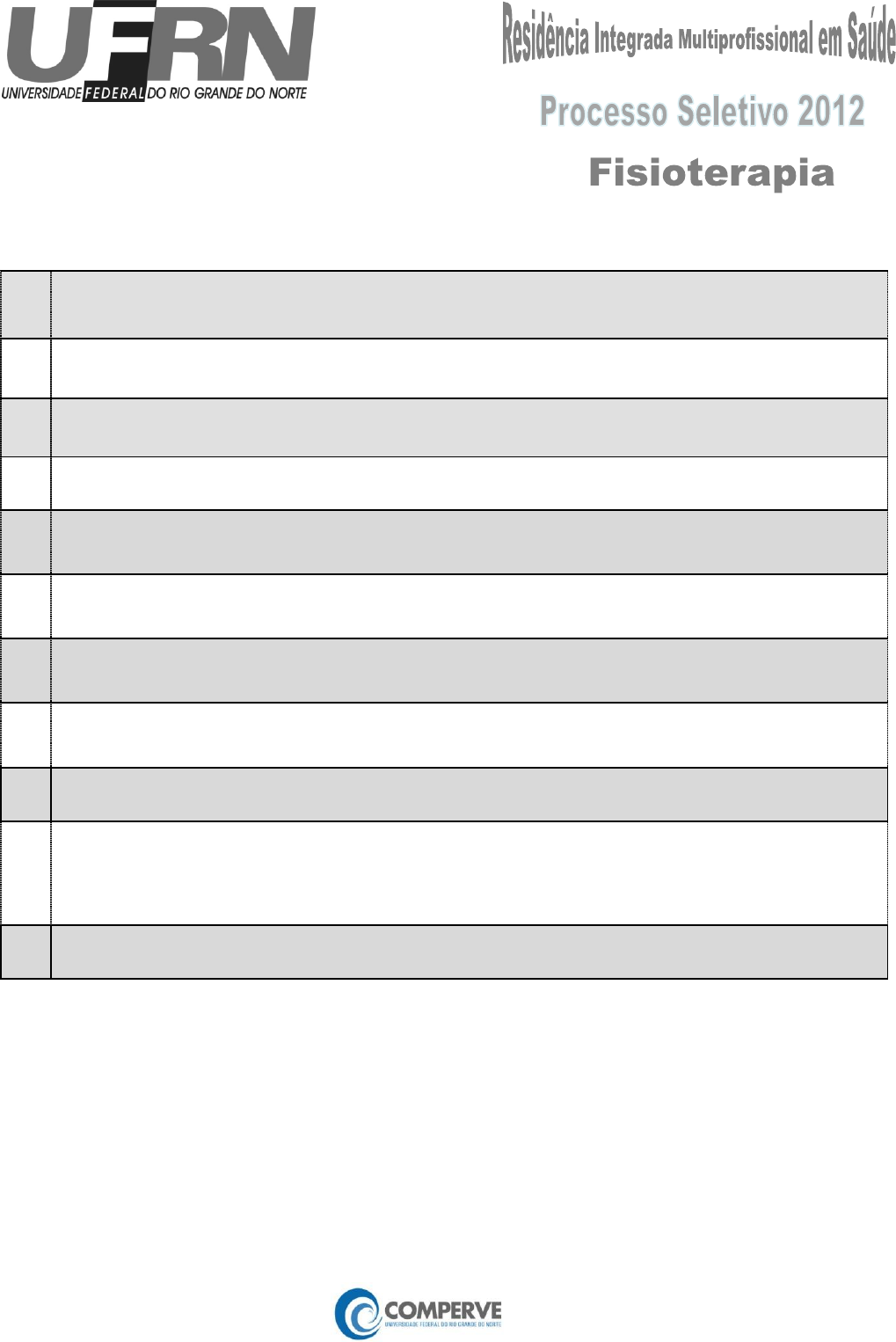 Leia estas instruções: 01 Confira se os dados contidos na parte inferior desta capa estão corretos e, em seguida, assine no espaço reservado para isso. 02 Este Caderno contém cinquenta questões de múltipla escolha assim distribuídas: 01 a 10 > Saúde Pública; 11 a 50 > Conhecimentos Específicos. 03 Se o Caderno contiver alguma imperfeição gráfica que impeça a leitura, comunique isso imediatamente ao Fiscal. 04 Cada questão de múltipla escolha apresenta apenas uma resposta correta. 05 Os rascunhos e as marcações feitas neste Caderno não serão considerados para efeito de avaliação. 06 Interpretar as questões faz parte da avaliação, portanto não adianta pedir esclarecimentos aos Fiscais. 07 Utilize qualquer espaço em branco deste Caderno para rascunhos e não destaque nenhuma folha. 08 Você dispõe de, no máximo, quatro horas para responder às questões e preencher a Folha de Respostas. 09 O preenchimento da Folha de Respostas é de sua inteira responsabilidade. 10 Ao retirar-se definitivamente da sala de provas, o candidato deverá entregar ao Fiscal a Folha de Resposta independentemente do tempo transcorrido do início da prova. Retirando-se antes de decorrerem três horas do início da prova , devolva também este Caderno. 11 Você só poderá levar este Caderno após decorridas três horas do início da prova. ________________________________________________________________________ Assinatura do Candidato: ______________________________________________________________ Residência Integrada Multiprofissional 2012 Fisioterapia 1 Saúde Pública 01 a 10 01. As afirmações a seguir dizem respeito às ações de Vigilância Epidemiológica, que vêm se constituindo, cada vez mais, em atividades fundamentais para os serviços de saúde. I A notificação imediata, segundo as normas de vigilância de doenças, agravos e eventos, será realizada por telefone, como meio de comunicação, ao serviço de vigilância epidemiológica da Secretaria Municipal de Saúde, cabendo a essa inst ituição disponibilizar e divulgar amplamente o número do telefone nas redes pública e privada de serviços de saúde. II A notificação imediata, quando realizada, desobriga o profissional ou o serviço de saúde de registrar essa notificação nos instrumentos estabelecidos. III É vedada aos gestores estaduais e municipais do SUS a exclusão de doenças, agravos e eventos de notificação compulsória, listados pelo Ministério da Saúde. IV O termo “agravo” significa uma enfermidade ou estado clínico, independentem ente de origem ou fonte, que represente ou possa representar um dano significativo para os seres humanos, segundo a terminologia adotada pelo Ministério da Saúde. Estão corretas as afirmações A) II e III. B) II e IV. C) I e III. D) I e IV. 02. Em relação ao Sistema de Informação sobre Nascidos Vivos (SINASC) , é correto afirmar: A) Os formulários de Declaração de Nascido Vivo (DN) são confeccionados e distribuídos pelas Secretarias Estaduais de Saúde de cada Unidade Federativa. B) Em relação ao fluxo da Declaração de Nascido Vivo (DN), as três vias que compõem o documento devem ser enviadas para a Secretaria Municipal de Saúde, após o seu preenchimento. C) Todas as Secretarias Municipais de Saúde do país já operam de modo informatizado a entrada de dados e o processamento desse sistema. D) O sistema capta informações sobre gravidez, parto e nascimento por meio de um instrumento padronizado de coleta de dados, chamado Declaração de Nascido Vivo (DN). 03. A ocorrência coletiva de uma determinada doença que acomete sistematicamente uma população, restrita a espaços delimitados, com incidência constante no decorrer de um extenso período de tempo, é denominada A) Epidemia. C) Pandemia. B) Endemia. D) Variação Sazonal. 04. Nas últimas décadas, o perfil de morbimortalidade do Brasil vem passando por mudanças em relação ao fenômeno denominado Transição Epidemiológica. Leia abaixo a lgumas afirmativas em relação a esse tema. I Há uma tendência de aumento da mortalidade por doenças infecciosas e parasitárias. II A mortalidade por doenças crônico-degenerativas diminuiu sua importância epidemiológica devido ao decréscimo em seus índices. III O aumento proporcional da mortalidade por causas externas merece destaque, dada sua elevada frequência, com o aumento do risco para a população jovem e , principalmente, a masculina. IV Desde o início da década de 1960, as doenças do aparelho circulatório são as principais causas de óbito no país. Estão corretas as afirmativas: A) III e IV. C) I e II. B) II e III. D) I e IV. 2 Residência Integrada Multiprofissional 2012 Fisioterapia 05. As afirmativas abaixo dizem respeito à mortalidade infantil e à fetal: I Os níveis atuais são considerados elevados e incompatíveis com o desenvolvimento do país, havendo sérios problemas a superar, tais como as persistentes e notórias desigualdades regionais e intraurbanas. II A mortalidade fetal e a neonatal precoce apresentam circunstâncias e etiologia semelhantes, as quais influenciam tanto o feto no final da gestação quanto a criança nas primeiras horas e dias de vida. III Apesar de apresentar a maior queda, a mortalidade pós-neonatal persiste como um problema, mesmo nas regiões mais desenvolvidas do país. IV Com a melhoria da captação dos óbitos, principalmente dos infantis, a subnotificação não é mais um problema nas regiões Norte e Nordeste do país. Estão corretas as afirmações presentes em A) II, III e IV. B) I, II, III. C) I e III. D) II e IV. 06. Leia os itens abaixo: I Orientação pelos Atributos da Atenção Primária à Saúde, adaptado de Starfield , 1992: acesso, orientação comunitária e competência cultural. II Ideia da integralidade na atenção à saúde, o que significa unificar ações promocionais, preventivas, curativas e de reabilitação. III Expressão dos fluxos assistencia