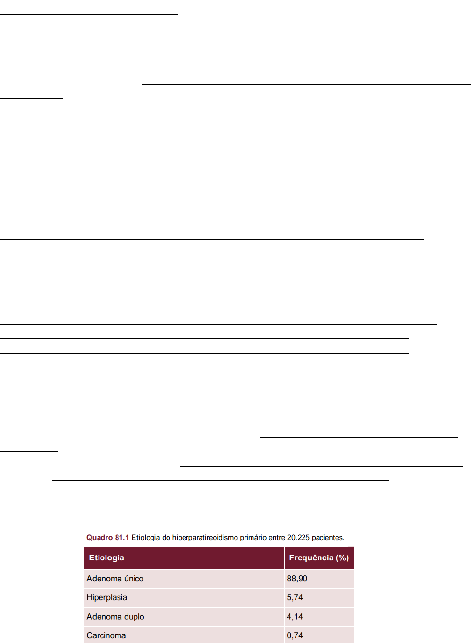 HIPERPARATIREOIDISMO PRIMÁRIO DEFINIÇÃO • O hiperparatireoidismo primário é um distúrbio que resulta da hipersecreção do PTH, sendo a causa mais comum de hipercalcemia diagnosticada. EPIDEMIOLOGIA • Pode ocorre em qualquer idade, porém acomete mais a faixa etária entre os 40-65 anos, predominando no sexo feminino(3F:1M) • O hiperparatireoidismo primário é uma doença relativamente comum, acometendo cerca de 1-7:1000 adultos FISIOLOGIA • As paratireoides são normalmente 4 glândulas do tamanho de uma ervilha ou feijão, localizadas posteriormente a tireoide, entretanto, ela pode estar localizada de forma ectópica e/ou também em maior número, dependo da pessoa. • As paratireóides tem como função principal produzir o PTH e manter a homeostase do cálcio no organismo, através das suas células principais. O PTH tem sua secreção e produção estimulada pelos níveis de cálcio sérico, no qual uma queda do cálcio sérico promove um aumento da secreção de PTH, sendo isso algo fisiológico, entretanto, em determinadas situações a secreção de PTH esta elevada de forma patológica, configurando o hiperparatireoidismo. • O PTH para exercer sua função de aumentar o cálcio sérico usa três principais mecanismos, que são o aumento da reabsorção de cálcio no túbulo distal dos néfrons, estímulo da reabsorção óssea pelos osteoclastos e ativação da enzima 1-alfa-hidroxilase nos rins(que colecalcifero em calcitriol). • As paratireóides detectam os níveis de cálcio sérico através de receptores sensores de cálcio(CaSR) localizados na superfície das células principais da glândula. ETIOLOGIA • O hiperparatireoidismo primário(HPTP) tem como etiologia em 85-90% dos casos adenomas solitários da paratireóide. • Quanto a pequena porcentagem restante, hiperplasia e adenomas múltiplos correspondem aos restantes, enquanto o carcinoma de paratireóide correspondem a menos de 1% dos casos de HPTP • Cerca de 10% dos casos de HTPT são hiperparatireoidismos familiares, ou seja, podem vir de forma hereditária como na neoplasia endócrina múltipla(MEN), ou surgirem de forma isolada, com em mutações inativadoras dos receptores sensores de cálcio. QUADRO CLÍNICO A HPTP pode ter uma forma assintomática, correspondendo a maioria dos casos, ou uma forma sintomática, como será visto abaixo: • Assintomática: O HPTP assintomático existe em cerca de 80-90% dos pacientes com HPTP, sendo uma doença detectada em dosagens de rotina do cálcio sérico. O HPTP assintomático caracteriza-se por ausência de envolvimento ósseo e renal, entretanto, muitos pacientes relatam sintomas vagos e inespecíficos como astenia, cansaço, depressão, problemas de memória, dentre outros. • Sintomáticos: São vistos em cerca de 15-20% dos pacientes com HPTP, caracterizado por cálculos renais(15- 20% dos pacientes sintomáticos) e doença óssea(5% dos pacientes sintomáticos) Abaixo serão vistas as manifestações do HPTP nos sistemas de nosso corpo: SISTEMA RENAL • A nefrolitíase recorrente é a manifestação renal mais característica do HPTP neste sistema, na qual 15-20% dos pacientes relatam isto. • Podem ocorrer, mais raramente, perda da função renal e nefrocalcinose DOENÇA ÓSSEA Na doença óssea do HPTP ocorre maior perda do osso cortical(camada externa) do que do trabecular(camada interna) Além disso, o PTH possui ação de reabsorção no esqueleto apendicular(principalmente nos terços distais do rádio), enquanto que no esqueleto axial ele possui ação anabólica O quadro clínico relacionado a doença óssea promovida pro HPTP tem a sintomatologia abaixo: • Dores ósseas: Com intensidade e localização variáveis • Fraturas patológicas • Fraqueza muscular: Principalmente proximal • Deformidades e comprometimento progressivo da deambulação: Mais raro, porém pode ser visto • Assintomáticos: Alguns pacientes possuem envolvimento ósseo diagnosticado no RX ou densitometria óssea, sem queixas específicas. RADIOGRAFIA • Na radiografia da doença óssea pode-se ver achados principalmente de reabsorção óssea subperiostealm, vista nas falangeas e porções distais das clavículas • Em casos mais graves podem ser vistos osteopenia generalizada e desmineralização óssea em “sal e pimenta” do crânio, além de tumores marrons ou osteoclastomas(processo reativos não-neoplásicos nos ossos, que simulam neoplasia primária óssea ou metástase, imagem ao lado) MANIFESTAÇÕES CARDIOVASCULARES • O HPTP está ligado a aumento na ocorrência de doença cardiovascular fatal e não-fatal • Além disso, estudos já ligaram a HPTP a diversas doenças CV como: HAS, Hipertrofia ventricular esquerda, doença arterial coronariana, calcificações das válvulas, anormalidades na função cardiovascular, dislipidemias e hipertrigliceridemia. MANIFESTAÇÕES PSIQUIÁTRICAS • Sintomas psiquiátricos ocorrem em até 23% dos pacientes com HTPT, no qual a maioria desta parcela relata depressão e ansiedade. • Outras manifestações psiquiátricas são fadiga, perda de memória, dificuldade de concentração, irritabilidade, transtornos do sono e humor OUTRAS MANIFETAÇÕES Algumas manifestações são relacionadas ao HPTP, algumas ainda não confirmadas e outras sim, como as abaixo: • Pancreatite aguda e crônica • Calcificações ectópicas nos rins, pulmões, pele e artérias • Neuropatia periférica • Manifestações articulares como condrocalcinose e fraturas subcondrais, gota • Baqueteamento digital: Visto em casos mais graves CRISE HIPERCALCÊMICA • A crise hipercalcêmica é uma rara manifestação do HTPT, sendo a crise hipercalcêmica considerada uma emergência médica, na qual os níveis de cálcio sérico encontram-se acima de 14mg/dl • A crise hipercalcêmica é mais comum em pacientes com carcinoma paratireóideo, do que nos pacientes com adenoma(mas pode ocorrer em ambas) • Quadro clínico: Desi