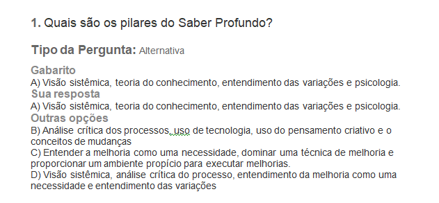 Quais são os pilares do Saber Profundo? A) Visão teoria do conhecimento, entendimento das variações e psicologia. B) Análise crítica dos de tecnologia, uso do pensamento criativo e 0 conceitos de mudanças. C) Entender a melhoria como uma dominar uma técnica de melhoria e um ambiente propício para executar melhorias. D) Visão análise crítica do processo, entendimento da melhoria como uma necessidade e entendimento das variações.