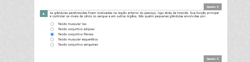 O tecido adiposo é um tipo de tecido: Questão 3 Escolha uma opção: a. muscular b. conjuntivo c. epitelial d. nervoso e. ósseo