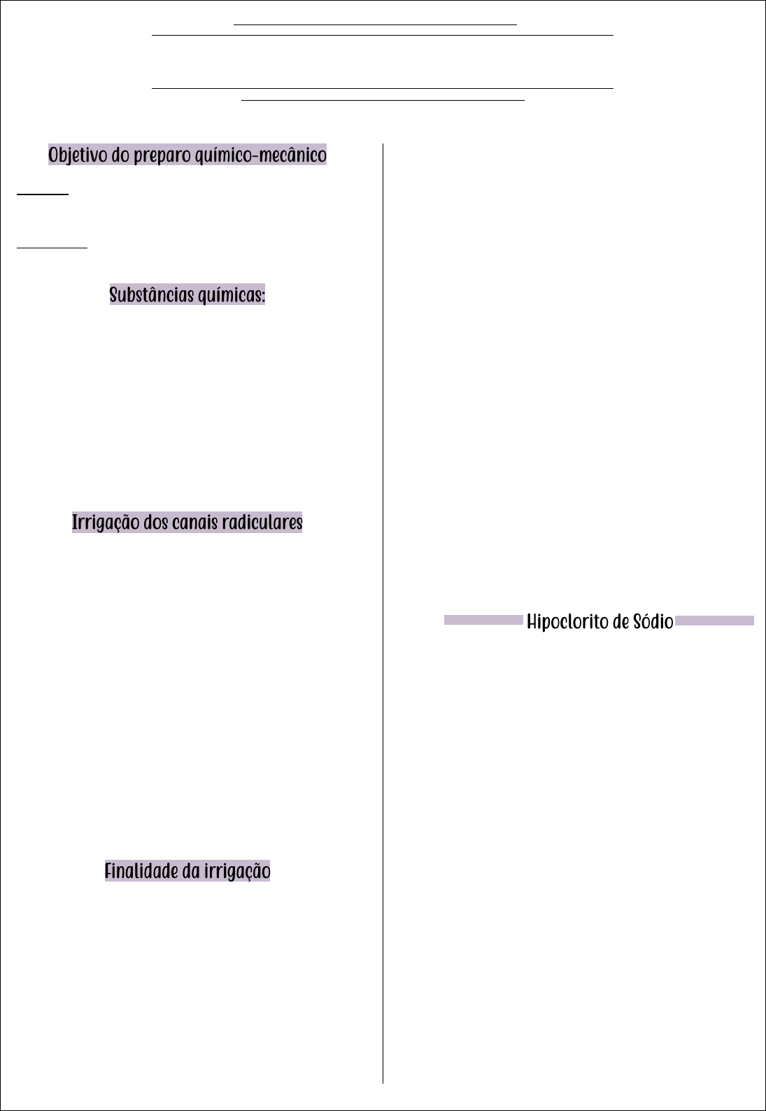 Ana Luiza Paschoal 1 Soluções Químicas Irrigadoras Endodontia i Limpeza - ação de instrumentos; uso de substâncias químicas Modelagem - ação dos instrumentos nas paredes do canal; obtenção do canal cirúrgico São soluções químicas usadas na irrigação-aspiração dos canais radiculares. ⎯ São usadas durante a instrumentação do Preparo de Canais Radiculares ⎯ Após a instrumentação para a remoção de Smear Layer ⎯ Formas liquidas, creme ou gel (normalmente liquida) O ato de irrigar durante a instrumentação tem como objetivos manter o canal repleto de soluções irrigadora, favorecendo a lubrificação dos instrumentos durante o corte e a dispersão das partículas dentinárias e detritos teciduais, impedindo que sejam compactados para a região apical do canal radicular e ocorra extrusão para o periapice. ⎯ Hipoclorito serve para lubrificação ⎯ Istmo é a passagem de um canal para outro; área crítica em relação a quantidade de dentina. Áreas não tocadas pela ação dos instrumentos Cerca de 40% do canal é área não tocada pelo instrumento ⎯ Eliminação/redução de microorganismo ⎯ Dissolução de tecidos orgânicos vivos ou necrosados ⎯ Suspensão de detritos oriundos da instrumentação ⎯ Lubrificação (faz com que a lima deslize com mais facilidade pro interior do canal) Requisitos da substância química ideal: ⎯ Tensão superficial (precisa ter pouca tensão superficial) ⎯ Viscosidade (precisa ser pouco viscosa para entrar no canal com mais facilidade) ⎯ Solvente de matéria orgânica ⎯ Atividade antimicrobiana ⎯ Atividade lubrificante ⎯ Atividade quelante ⎯ Fazer suspensão de detritos ⎯ Biocompatibilidade Substâncias químicas auxiliares: • Compostos halogenados • Ácidos • Detergentes • Quelantes • Outras soluções 5,25%, 2,5%, 1% e 0,5% ⎯ É a solução química auxiliar da instrumentação de canais radiculares mais usada no mundo ⎯ Propriedades tais como: ⎯ Atividade solvente de matéria orgânica ⎯ Antimicrobiano ⎯ Atividade desodorizante ⎯ Ação clareadora ⎯ Lubrificante ⎯ Baixa tensão superficial ⎯ Ação detergente ⎯ Relativamente não tóxico Vantagens: ▪ Barato ▪ Rápida atuação ▪ Desodorizante e lubrificante ▪ Atividade antimicrobiana pronunciado ▪ Ação solvente de matéria orgânica ▪ Concentração facilmente determinada Ana Luiza Paschoal 2 ▪ Clareador Desvantagens: ▪ Instável ao armazenamento ▪ Inativado por matéria orgânica ▪ Corrosivo ▪ Irritante para a pele e mucosa ▪ Forte odor ▪ Descora tecido ▪ Remove carbono de borracha Acidentes com hipoclorito de sódio ▪ NÃO fAZER pressão forte no embolo; deixar a agulha folgada no canal, movimentando enquanto irriga. ▪ Não usar em pacientes alérgicos a cloro ou que tenham ápice aberto ▪ Citotóxico e irritante aos tecidos ▪ Não fazer pressão forte no embolo ▪ Deixar a agulha folgada no canal, movimentando enquanto irriga ▪ Fazer bom isolamento absoluto ▪ Acidentes comuns: ▪ Extravasar pelo lençol na boca ▪ Extravasar no periápice ▪ Atividade antimicrobiana ▪ Substantificada (ação prolongada) ▪ Biocompatibilidade ▪ Estabilidade ▪ Relativa ausência de toxicidade ▪ Baixa atividade solvente de matéria orgânica ▪ Adsorção Substâncias que tem a propriedade de fixar íons metálicos de um determinado complexo molecular. Faz quelação de íons cálcio. ▪ Capaz de promover quelação (solubilização) do íon fosfato de cálcio da dentina -≥ ação desmineralizadora sobre a dentina -≥ pequeno poder de descalcificação Indicações: ⎯ Como auxiliar no preparo biomecânico de canais atresiados ⎯ Para o toilete final, na remoção da camada residual (smear layer) ⎯ Não é solução irrigadora ⎯ restos dentinários e substancia amorfa que adere as paredes do canal ⎯ Deposita-se principalmente na região apical ⎯ Formado por qualquer residuo produzido pela ação de corte dos instrumentos sobre a dentina, esmalte ou cemento ✓ ácido cítrico 10% - não usa ✓ Peróxido de hidrogênio (água oxigenada) - não usa ✓ Água de cal (utilizada em casos de hemorragia pulpar; substancia hemostática) ✓ Glicerina - não usa ✓ Detergente - não usa ✓ Soro fisiológico • Irrigação e aspiração simultaneamente • Movimento de vai e vem com a cânula de irrigação • Materiais: • Seringa de irrigação comum descartável • Cânula de aspiração (maior a ponta, melhor) • Cânula de irrigação esterilizável, seleção de acordo com a anatomia e com saída para lateral.