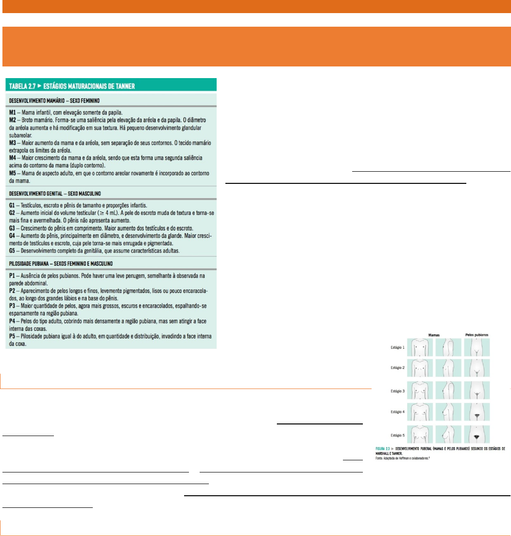 “Santo Senhor Benedito” – Módulo 2 Daniella Machado Tutoria– 3º período UniEVANGÉLICA Turma XXVI Nascimento, Crescimento e Desenvolvimento – “Santo Doutor Benedito” Tutoria: Módulo 2 – Problema 7 Descrever as mudanças corporais da puberdade (Tanner) Desenvolvimento puberal Puberdade é o estágio de desenvolvimento caracterizado por uma sequência de mudanças hormonais que levam a inúmeras transformações biológicas, como a secreção de hormônios gonadais e desenvolvimento dos caracteres sexuais secundários e das funções reprodutivas. Fazendo parte da adolescência, período com numerosas transformações nos aspectos físicos, psíquicos e sociais do indivíduo. A puberdade engloba além da maturação sexual e do estirão de crescimento, outros eventos físicos e de ordem psicossocial que devem ser abordados pelo pediatra. Inicia-se com reativação do eixo-hipotálamo-hipófise-gonadal (HHG), quando ocorre um aumento na produção do hormônio liberador de gonadotrofinas (GnRH) que é secretado de forma pulsátil pela glândula hipófise, do LH e FSH, que são liberados na circulação periférica e atingem as gônadas, que promoverão síntese de esteroides sexuais (androgênios e estrogênios). A sequência do desenvolvimento de características secundárias foi sistematizada por Tanner, em 1962. Foram descritos estágios de maturação que variam do estágio 1 (infantil) ao 6 (adulto), considerando-se o desenvolvimento mamário (M) e pilosidade pubiana (P) para o sexo feminino e masculino, e desenvolvimento da genitália externa (G) do sexo masculino. Puberdade feminina: 8-13 (média de 10 anos) Inicia com telarca, com desenvolvimento do broto mamário, por influência dos estrogênios produzidos pelos ovários em decorrência do estímulo dos hormônios hipotalâmicos (LH e FSH). Ocorre de forma assimétrica e costuma preceder a pubarca, que é o início da pilificação pubiana, com efeito dos androgênios. A pubarca pode ocorrer antes da telarca ou simultaneamente com ela. A menarca é a primeira menstruação, ocorre cerca de 2,5 anos após a telarca (estágio M4). O início do estirão de crescimento nas meninas coincide com o início da puberdade. O pico de estirão puberal, atingindo o máximo da velocidade de crescimento, ocorre antes da menarca, atingindo o máximo da velocidade de crescimento (em torno de 8,5 cm/ano), no estágio M3. O crescimento estatural encerra entre 15-16 anos. Puberdade masculina: 9-14 anos (média de 11,5 anos) A primeira manifestação física externa do início clínica da puberdade é o aumento do volume testicular (atinge 4 mL) pelo estímulo dos hormônios hipotalâmicos (LH e FSH). Denominado gonadarca e ocorre de forma concomitante ou precedente a pubarca. Os pelos pubianos podem surgir antes do aumento do volume dos testículos pelos efeitos da adrenarca, que é o início a produção de androgênios pelas suprarrenais. O aumento de produção pela suprarrenal ocorre em média um ano e meio antes da reativação do eixo HCG. Nos meninos, o início da puberdade ocorre em um momento de velocidade de crescimento estável ou pré-puberal. A aceleração do crescimento ocorre apenas no estágio G3, o pico de velocidade de crescimento (9,5 cm/ano), em G4. No G3, ocorre a Espermarca, primeira eliminação de líquido seminal contendo espermatozoides. A combinação entre um longo período de crescimento pré-puberal e um pico de velocidade de crescimento maior explica a discrepância de altura entre homens e mulheres. São estabelecidas as distintas formas corporais masculinas e femininas como resultado do desenvolvimento esquelético, muscular e do tecido adiposos. Ao longo do processo puberal, a menina cresce aproximadamente 24 cm e o menino 28 cm. Ao final do crescimento estatural a menina terá uma porcentagem de gordura corporal em torno de 25%, equivale ao dobro da gordura adquirida pelos meninos. O ganho de peso das meninas é decorrente do ganho de tecido adiposo, localizado nos quadris e nas coxas, delineando a típica configuração do corpo feminino. Há o aumento da capacidade física, sendo mais marcante no sexo masculino, como resultado do desenvolvimento do sistema cardiocirculatório e aumento o volume sanguíneo circulante (eritropoiese) e da massa muscular. Ao contrário do ganho de gordura, a velocidade máxima do crescimento muscular ocorre junto com o pico de velocidade de crescimento e seu incremento se faz à vista do aumento do número e do tamanho das células. No final do crescimento, o conteúdo feminino de massa muscular será apenas dois terços do observado nos homens. A força muscular por grama de tecido se torna menor no sexo feminino. Algumas alterações laboratoriais podem ser encontradas, como aumento transitório da fosfatase alcalina (FA), refletindo atividade osteoblástica e crescimento ósseo, e aumento dos valores de colesterol total e triglicerídeos, pela maior produção de esteroides sexuais. A pressão arterial sofre aumento gradual nesse período. Em decorrência de todas essas modificações corporais, é importante que a pediatra esteja atenta à qualidade de alimentação, com aporte necessário de cálcio, ferro e outros nutrientes indispensáveis. Aumento do GH. Caracterizar o exame clínico do adolescente Atenção integral à saúde do adolescente Adolescência: transformação física, motora, sexual e comportamental. Segundo a adolescência o período compreende entre 10-19 anos, dependem do órgão ou serviço de atendimento. Período de grandes mudanças, podendo se prevenir e detectar doenças do adulto, tais como: redução da vulnerabilidade e dos riscos à saúde física e emocional; doenças decorrentes à alimentação inadequada; atividade sexual desprotegida; dependência digital; problemas de escolaridade; violências; doenças crônicas não transmissíveis e transtorno musculoesqueléticas. Dever do Estado promover atenção integral à saúde do 
