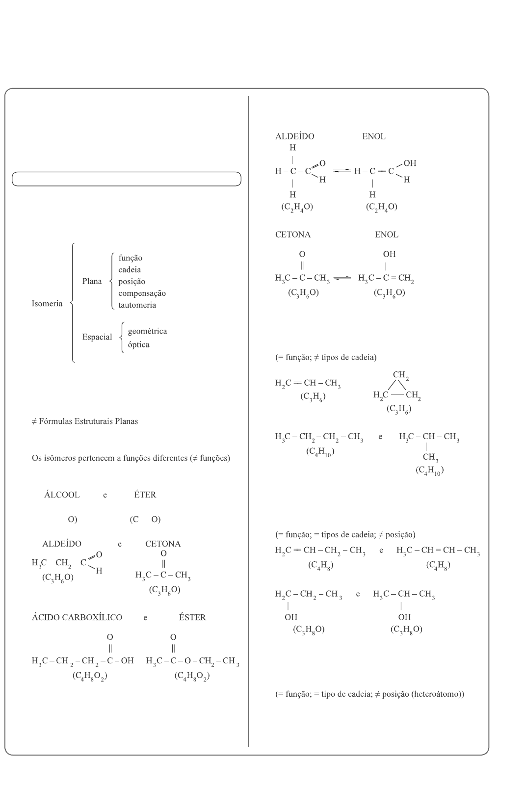 AA 370 Terceira Série do Ensino Médio e Extensivo Diurno / 2022 ISOMERIA PLANA • Isomeria de Função • Isomeria de Cadeia • Isomeria de Posição • Isomeria de Compensação (Metameria) • Isomeria Dinâmica (Tautomeria) RESUMO ISOMERIA É o fenômeno em que se tem a mesma fórmula molecular e diferentes fórmulas estruturais. ISOMERIA PLANA OU ISOMERIA CONSTITUCIONAL = Fórmula Molecular a) Isomeria de Função (funcional) Casos principais: H3C – CH2 – OH H3C – O – CH3 (C2H6 2H6 b) Isomeria Dinâmica (tautomeria) c) Isomeria de Cadeia Os isômeros pertencem à mesma função orgânica e apre- sentam diferentes tipos de cadeia. e d) Isomeria de Posição Os isômeros pertencem à mesma função orgânica, apresen- tam o mesmo tipo de cadeia e diferem na posição de insatu- ração, radical ou grupo funcional. e) Isomeria de Compensação ou Metameria Os isômeros que pertencem à mesma função, apresentam o mesmo tipo de cadeia e diferem na posição de heteroátomo. AA 371Terceira Série do Ensino Médio e Extensivo Diurno / 2022 APRENDENDO O BÁSICO Resolver o quê? Os exercícios a seguir: APRENDENDO EM SALA DE AULA 1. com o tipo de isomeria existente entre eles na coluna II. 2 – Isomeria de compensação; 3 – Isomeria de cadeia; 4 – Isomeria de posição. 2. - meria: O OH || | H 3 C — C — CH 3 H 2 C = C — CH 3 3. - nona e propanal; acetato de metila e metanoato de etila, es- colha aquele que representa isômeros de: OH | 3 C — C — CH 3 | CH 3 OH | 3 C — CH — CH 2 | CH 3 3 C — O — CH 2 — CH 2 — CH 3 3 C — CH 2 — O — CH 2 — CH 3 3 C — O — CH — CH 3 | CH 3 função, cadeia, posição e metameria, respectivamente, entre os compostos de cada par de isômeros abaixo: A e C: A e D: A e F: C e D: C e F: D e F: 1. Considere os compostos abaixo, todos com a fórmula C 4 H O: 3 C — CH 2 — CH 2 — CH 2 — OH 3 C — CH 2 — CH — CH 3 | OH 2. Considere os compostos abaixo, todos com a fórmula C 5 H O: 3 C — CH 2 — CH 2 — CH 2 — C O H 3 C — CH 2 — CH — C O H CH 3 3 C — CH — CH 2 — C O H | CH 3 O || 3 C — C — CH 2 — CH 2 — CH 3 3 C — CH 2 — C — CH 2 — CH 3 || O 3 C — C — CH — CH 3 || | O CH 3 AA 372 Terceira Série do Ensino Médio e Extensivo Diurno / 2022 função, cadeia, posição e metameria, respectivamente, entre os compostos de cada par de isômeros abaixo: A e C: C e F: A e D: D e F: A e F: C e D: 3. I. CH 3 — CH 2 — C O H II. CH 3 — CH 2 — O — CH 3 III. CH 2 == CH — CH 3 IV. CH 3 — CH 2 — CH 2 — OH CH 2 V. H 2 C — CH 2 OH | VI. CH 3 — CH == CH isomeria plana: 4. - vamente, os tipos de isomeria para os pares de compostos abaixo: II. Metil-n-propilamina e dietilamina RELEMBRANDO... 1. 22s22p63s23p3 são, respectiva- mente: 5. - 3H8O são AA 373Terceira Série do Ensino Médio e Extensivo Diurno / 2022 ISOMERIA ESPACIAL • Isomeria Geométrica (Cis-Trans) • Isomeria Óptica RESUMO ISOMERIA ESPACIAL (Estereoisomeria) Os isômeros espaciais apresentam a mesma fórmula mole- cular e a mesma fórmula estrutural plana, no entanto, apre- sentam diferentes fórmulas estruturais espaciais. A isomeria espacial (estereoisomeria) subdivide-se em iso- meria geométrica e isomeria óptica. Isomeria Espacial Geométria ou Cis-Trans Em compostos de cadeias abertas, a primeira condição para que haja isomeria geométrica é a presença da dupla ligação entre átomos de carbono, e a segunda condição é a existência de ligantes diferentes entre si, em cada carbono da dupla ligação. Com isso, na isomeria espacial geométrica, sempre existirão dois isômeros espaciais (duas fórmulas estruturais espaciais diferentes): o isômero cis e o isômero trans. No isômero cis, os ligantes de menor massa encontram- se de um mesmo lado do plano da dupla ligação, enquanto no isômero trans, os ligantes de menor massa encontram-se em lados opostos do plano da dupla ligação. Exemplos: but-2-eno Em compostos de cadeias cíclicas, a condição para que haja isomeria geométrica é a existência de ligantes diferen- tes entre si, em pelo menos dois carbonos do ciclo. Exemplo: Isomeria Espacial Óptica Ocorre em compostos com assimetria molecular, que quiral, que é o carbono com quatro ligantes diferentes entre si. Neste caso diz-se, então, que a substância orgânica é opticamente ativa, ou seja, desvia o plano de vibração da luz polarizada e origina isômeros dextrógiros e levógiros. Isômero dextrógiro: desvia o plano de vibração da luz polarizada para a direita. Isômero levógiro: desvia o plano de vibração da luz polari- zada para a esquerda. Mistura racêmica: é a mistura equimolar de enantiomorfos, ou seja, de isômeros dextrógiro e levógiro que desviam de mesmo ângulo a luz polarizada. A mistura racêmica é ina- tiva, ou seja, não desvia o plano de vibração da luz polari- zada. Equação de Van’t Hoff • Isômeros opticamente ativos: 2n em que n = número • Misturas racêmicas: 2n–1 Exemplos: Ácido lático: Isômeros opticamente ativos: IOA = 2n = 21 = 2 (d e ) Mistura racêmica: 2n–1 = 21–1 = 2º = 1 Isômeros opticamente ativos: IOA = 2n = 22 = 4 Misturas racêmicas: 2n–1 = 22–1 = 2 (r1r2) Existe uma situação especial, em que o número de isô- meros não é determinado através da equação de Van’t Hoff; isso ocorre quando existem dois carbonos assimétricos AA 374 Terceira Série do Ensino Médio e Extensivo Diurno / 2022 APRENDENDO O BÁSICO Resolver o quê? Os exercícios a seguir: APRENDENDO EM SALA DE AULA iguais na molécula do composto orgânico. Neste caso, sem- pre originarão três isômeros, sendo dois ativos (1 dextrógiro e 1 levógiro) e um inativo (isomero meso). A mistura racê- mica pode ser obtida pela mistura equimolar dos isômeros ativos: dextrógiro e levógiro. Exemplo: butano-2,3-diol 2 ativos (d e ) 3 isômeros 1 inativo (meso) 1 mistura racêmica (r) 1. (FUVEST) A fórmula molecular C 4 H 8 pode rep