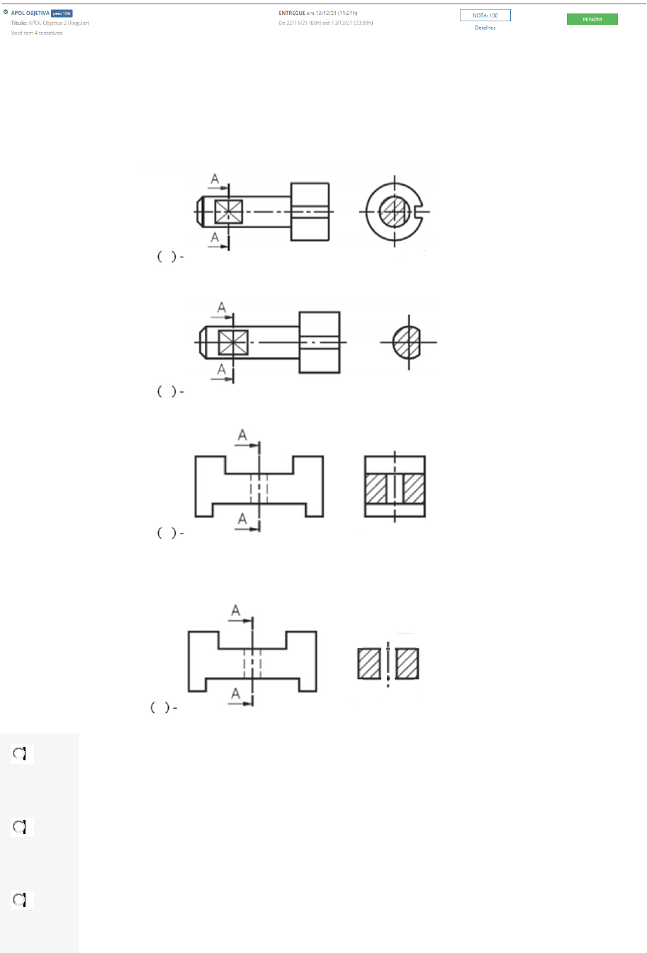 Questão 1/10 - Desenho Técnico Mecânico Em desenho técnico existe uma representação chamada de seção, onde nada mais é do que a representação do plano secante com a peça. Analise os desenhos a seguir e marque C quando a vista lateral for a representação de um CORTE, ou S quando essa vista for uma SEÇÃO, depois escolha a alternativa correta. A C – C – C – C B S – C – S – C C S – S – S – S D C – S – C – S Questão 2/10 - Desenho Técnico Mecânico Objetivo da aplicação de tolerância dimensional nos desenhos técnicos são aplicado em: I. Peças semelhantes, sejam intercambiáveis, que possam ser substituídas entre si, sem que haja necessidade de reparos e ajustes. II. As medidas das peças podem variar, dentro de certos limites, para mais ou para menos, sem que isto prejudique a qualidade qualidade. III. Garantir num conjunto, que as peças se ajustam, isto é, se encaixam umas nas outras. IV. Conforme o valor da tolerância, determina-se o processo de fabricação mais adequado e os instrumentos de medição. É correto apenas o que se afirma em : A Alternativa I, II e III. B Alternativa III e IV. C Alternativa I eIV. D Alternativa I, II, III e IV Questão 3/10 - Desenho Técnico Mecânico Os freios a disco são os mais utilizados em veículos. A característica deste sistema de disco é dissipar o calor devido grande parte da área do disco ficar em contato com o ar. O disco de freio gira solidário à roda, e a pinça de freio permanece fixa na manga de eixo. Ao pisar no pedal, são acionado as pastilhas que entram em contato com o disco fazendo o carro parar. Conforme o desenho técnico podemos afirmar que: l) A dimensão do diâmetro interno do cubo do Disco de freio "C" é 44mm; ll) A dimensão do diâmetro externo do cubo do Disco de freio "A" é 258 mm; lll) A dimensão da altura total do disco "B" é 44mm; lV) O disco de freio tem 4 furos de fixação "E"; É correto apenas o que se afirma em: A ll, lll e lV. B l,ll e lll. C l,ll e lV. D l, ll, lll e lV Questão 4/10 - Desenho Técnico Mecânico Assinale a alternativa que apresenta corretamente as três vistas ortogonais no 1° diedro da peça desenhada em perspectiva a seguir: A B C D Questão 5/10 - Desenho Técnico Mecânico Em uma estamparia é preciso fabricar um lote de 2000 peças por dia. O desenho da peça precisa representar peças com partes e elementos oblíquos. Recorremos a um tipo especial de projeção ortográfica que permite simplificar a representação e a interpretação de desenhos desse tipo de peça, chamada de projeção ortográfica com vistas auxiliares. Observe o desenho da peça abaixo e assinale a alternativa que apresenta corretamente as faces oblíquas. A Face "a" e face "d" B Face "c" C Face "a", face "b" e face "e" D Face "c" e face "d" Questão 6/10 - Desenho Técnico Mecânico As caixas d´água têm a capacidade de armazenamento de água padrão de: 100 l, até 5000 l. Para determinar o espaço para a sua instalação. Conforme o desenho técnico da caixa d´água podemos afirmar que as dimensões aproximadas são: l) A caixa com a capacidade de 1500 l, tem o diâmetro com a tampa de 1,05 m e altura total com a tampa de 1,77m. ll) A caixa com a capacidade de 1000 l, tem o diâmetro sem a tampa de 1,51 m e altura total sem a tampa de 0,76 m. lll) A caixa com a capacidade de 2000 l, tem o diâmetro com a tampa de 1,89 m e altura total com a tampa de 1;10 m. lV) A caixa com a capacidade de 500 l, tem o diâmetro da base de 0,95m e altura total sem a tampa de 0,58 m. É correto apenas o que se afirma em: A ll, lll e lV. B l, ll. lll e lV. C l, ll e lll. D l, ll e lV. Questão 7/10 - Desenho Técnico Mecânico Motor monofásico de carcaça de chapa, para uso geral, desenvolvido para atender as mais variadas aplicações com o máximo desempenho e economia. Conforme o desenho técnico em anexo, O diâmetro do eixo rotativo do motor é: A 13,13 mm; B 47,6mm ; C 4,76mm ; D 15,875 mm; Questão 8/10 - Desenho Técnico Mecânico Para facilitar o entendimento do desenho técnico do parafuso abaixo, foi aplicado um corte. Analise e assinale a alternativa que represente corretamente a vista que esta representado em corte. A B C D Questão 9/10 - Desenho Técnico Mecânico Conforme o desenho de conjunto do Calço de Regulagem são composto por 4 peças. Responda a alternativa correta: A A peça do item 1 do desenho de conjunto são composta por 2 peças denominada Corpo. B A peça do item 4 do desenho de conjunto é denominada Parafuso regulador. C A peça do item 2 do desenho de conjunto é denominada Prisma. D São utilizadas 02 peças denominada Anel de Regulagem. Questão 10/10 - Desenho Técnico Mecânico Existem peças com muitos detalhes que não são vistos normalmente, tais como: furos, roscas, ranhuras, rebaixos e detalhes internos e que precisam ser informados para que a peça seja visualizada corretamente. Para essa visualização é usado um tipo de linha, na mesma espessura das linhas principais da peça e que indicam esses detalhes internos e até detalhes do lado oposto da peça, oculto por uma determinada face. Para essa visualização, qual o tipo de linha deve ser usado? A Linhas tracejadas B Linhas traço e ponto C Linhas de centro D Linhas traço dois pontos