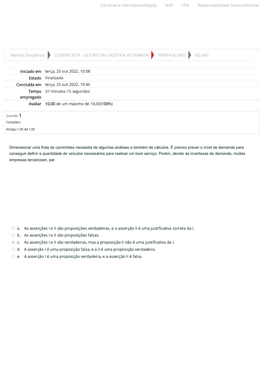 Minhas Disciplinas 222RGR1351A - GESTÃO DA LOGÍSTICA INTEGRADA PROVA N2 (A5) N2 (A5) Iniciado em terça, 25 out 2022, 10:08 Estado Finalizada Concluída em terça, 25 out 2022, 10:45 Tempo empregado 37 minutos 15 segundos Avaliar 10,00 de um máximo de 10,00(100%) Questão 1 Completo Atingiu 1,00 de 1,00 Dimensionar uma frota de caminhões necessita de algumas análises e também de cálculos. É preciso prever o nível de demanda para conseguir definir a quantidade de veículos necessários para realizar um bom serviço. Porém, devido às incertezas de demanda, muitas empresas terceirizam, parcial ou integralmente, o serviço de transporte. Nesse contexto, analise as asserções a seguir e a relação proposta entre elas. I. Para dimensionar uma frota, é preciso conhecer o mercado de atuação. Pois: II. Terceirizando a frota, a empresa consegue direcionar mais tempo e esforço para o foco do negócio. Assinale a alternativa correta. a. As asserções I e II são proposições verdadeiras, e a asserção II é uma justi�cativa correta da I. b. As asserções I e II são proposições falsas. c. As asserções I e II são verdadeiras, mas a proposição II não é uma justi�cativa da I. d. A asserção I é uma proposição falsa, e a II é uma proposição verdadeira. e. A asserção I é uma proposição verdadeira, e a asserção II é falsa. Carreiras e Internacionalização NAP CPA Responsabilidade Socioambiental https://ambienteacademico.com.br/my/ https://ambienteacademico.com.br/course/view.php?id=17686 https://ambienteacademico.com.br/course/view.php?id=17686§ion=7 https://ambienteacademico.com.br/mod/quiz/view.php?id=484059 https://informa.fmu.br/carreiras/ https://codely-fmu-content.s3.amazonaws.com/Moodle/NAP/inicial/nap/fmu/index.html https://codely-fmu-content.s3.amazonaws.com/Moodle/CPA/landing_CPA/index.html https://portal.fmu.br/sustentabilidade Questão 2 Completo Atingiu 1,00 de 1,00 Questão 3 Completo Atingiu 1,00 de 1,00 As embalagens se destacam por facilitarem a movimentação dos materiais e são fundamentais na gestão logística, principalmente quando usadas de maneira estratégica. O container é um tipo de embalagem usado para transportar grandes quantidades de material. Esse tipo de embalagem é fundamental no transporte _________. Assinale a alternativa que completa corretamente a lacuna: a. ferroviário. b. aeroviário. c. rodoviário. d. dutoviário. e. aquaviário. Ao terceirizar uma frota, a empresa consegue direcionar mais tempo e esforço para o foco do negócio. Mas, se essa decisão for definida sem estudo, pode haver prejuízo financeiro e/ou estratégico. Cabe aos gestores analisarem as possíveis vantagens e desvantagens dessa terceirização. Nesse contexto, associe as afirmações as suas respectivas características. I. Vantagem. II. Desvantagem. ( ) Nível de atendimento reduzido. ( ) Previsão dos custos totais. ( ) Veículos sempre novos. ( ) Custo fixo reduzido. ( ) Controle de operação reduzido. Assinale a alternativa que apresenta a associação correta: a. II, I, II, II, I. b. I, II, II, II, I. c. II, I, I, I, II. d. I, I, II, I, II. e. I, II, II, I, II. Carreiras e Internacionalização NAP CPA Responsabilidade Socioambiental https://informa.fmu.br/carreiras/ https://codely-fmu-content.s3.amazonaws.com/Moodle/NAP/inicial/nap/fmu/index.html https://codely-fmu-content.s3.amazonaws.com/Moodle/CPA/landing_CPA/index.html https://portal.fmu.br/sustentabilidade Questão 4 Completo Atingiu 1,00 de 1,00 Questão 5 Completo Atingiu 1,00 de 1,00 Os estoques são fundamentais na cadeia de suprimentos e precisam ser gerenciados de forma eficiente e estratégica. Através da TI, é possível utilizar um sistema de gerenciamento que tornará os processos do negócio e as atividades relacionadas, facilitadas. Considerando o excerto apresentado, analise as afirmativas a seguir: I. Através de um sistema de gerenciamento é possível gerenciar atividades como: recebimento, conferência, separação, embarque, inventário e comunicação. II. A TI é usada para gerenciar a roteirização de veículos, entregando roteirizações eficientes e adequadas as demandas, gerando informações separadas para cada atividade. III. Através da TI é possível classificar pedidos de clientes, rastrear produtos por importância e analisar diversos cenários envolvendo os estoques. IV. Através da TI é possível monitorar o desempenho do estoque e gerar relatórios gerenciais, determinar a localização dos estoques e determinar a política aplicada ao estoque. É correto o que se afirma em: a. I e IV, apenas. b. II e III, apenas. c. II, apenas. d. III e IV, apenas. e. I, apenas. Definir um indicador de desempenho é uma atividade muito ampla, e cada organização, representada pelos seus gestores, elabora seus indicadores, refletindo seus objetivos estratégicos. Algumas características são comuns a bons indicadores e devem ser adotadas por qualquer organização. CORRÊA, H. L. Gestão de redes de suprimentos: integrando cadeias de suprimento no mundo globalizado . São Paulo: Atlas, 2010. Nesse contexto, analise as afirmativas a seguir: I. Indicadores devem ser de fácil entendimento e utilização. II. Um indicador com valor acima da capacidade do negócio desafia seu usuário. III. Um indicador compara o negócio ao qual está envolvido, interna e externamente. IV. Um indicador deve apresentar a evolução de um processo. V. Indicadores devem pertencer a um ciclo constante de controle. Assinale a alternativa correta. a. I, II e V. b. II, III e IV. c. III, IV e V. d. I, IV e V. e. I, II e III. Carreiras e Internacionalização NAP CPA Responsabilidade Socioambiental https://informa.fmu.br/carreiras/ https://codely-fmu-content.s3.amazonaws.com/Moodle/NAP/inicial/nap/fmu/index.html https://codely-fmu-content.s3.amazonaws.com/Moodle/CPA/landing_CPA/index.html https://portal.fmu.br/sustentabilidade Questão 6 Completo Atingiu 1,00 de 1,00 Questão 7 Compl