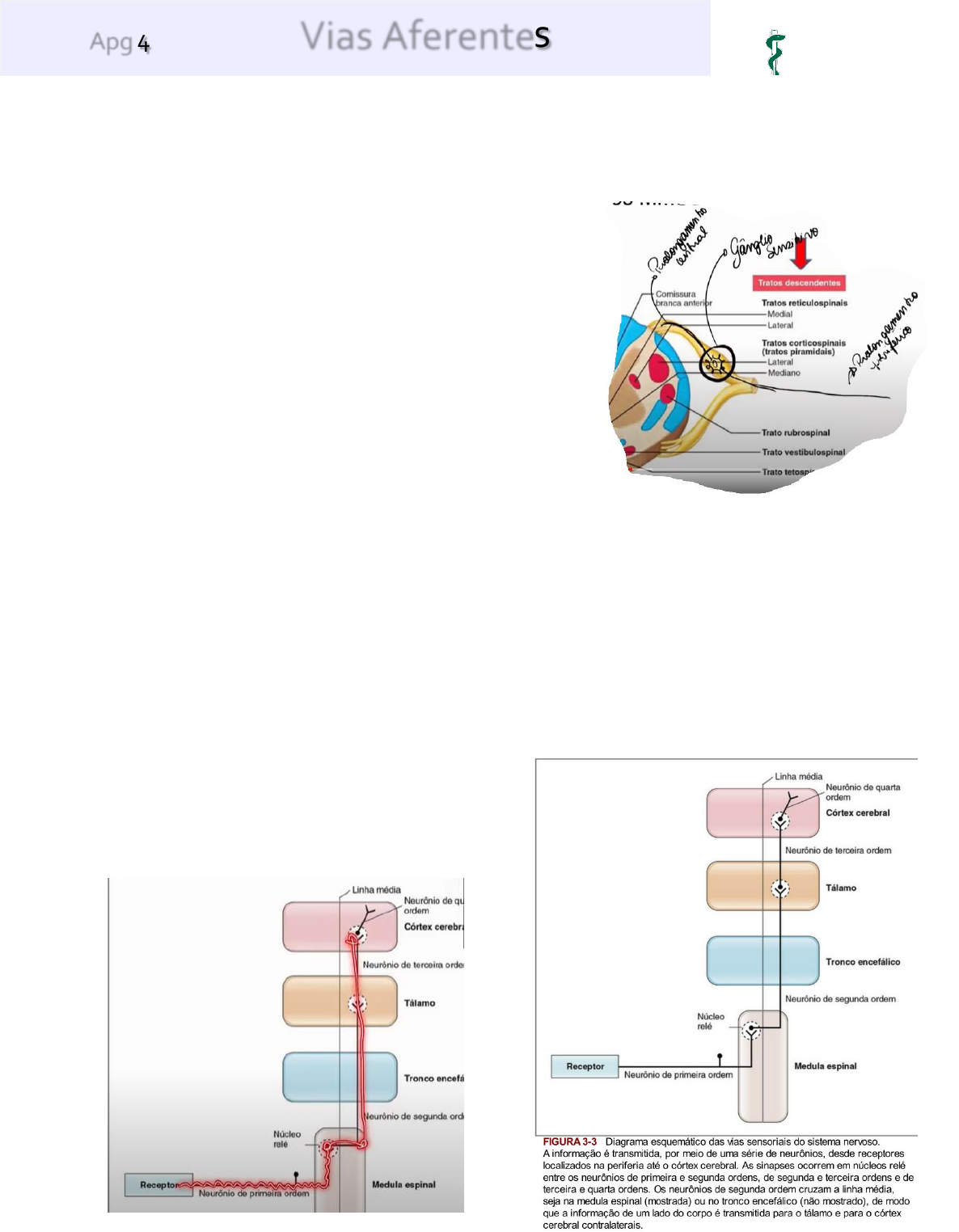 Apg 4- 1 Letícia Miernitski - 2°P - A via aferente leva impulso, dos receptores periféricos até os centros nervosos -“Espino” = aferente -Composta por: RECEPTOR – TRAJETO PERIFÉRICO – TRAJETO CENTRAL – ÁREA DE PROJEÇÃO CORTICAL -O nervo espinal, quando chega no forame intervertebral, lá da medula, vai se ramificar em duas raízes, uma dorsal/posterior (para trás), outra ventral/anterior (para a frente); -As informações/estímulos SENSITIVAS/SENSORIAIS entram na medula pela região posterior, de trás, ou seja, pelas RAÍZES DORSAIS dos nervos espinais; -Funículo Posterior= Corno Posterior = Raiz Dorsal -O estimulo lá da periferia vai vir pelo prolongamento periférico, chega no gânglio da raiz dorsal, continua pelo prolongamento central, até entrar na medula. - Quando o impulso chega, entra na substancia cinzenta, pois é a região de processamento, para daí ir PARA região branca, que é a de condução Do ponto de entrada na medula até o encéfalo, há dois caminhos, dois grupos de vias: Funículo posterior- lemnisco medial e sistema anterolateral; ou seja, o impulso que chega na medula, tem duas opções para subir para ao encéfalo. Nome “funículo posterior – lemnisco medial” = “coluna dorsal – lemnisco medial” -Sistema anterolateral: vai subir anterior ou lateralmente pela medula. E funículo posterior, vai subir posteriormente na medula. Logo, uma da diferença entre os dois sistemas é o local pelo qual eles circulam na medula. O estimulo que parte lá do órgão receptor vai percorrer o nervo espinal, vai passar pelo gânglio e vai entrar na medula; na medula ele cruza; tipo entra pelo lado direito e cruza para o esquerdo. Apg 4 Vias Aferentes Apg 4- 2 Letícia Miernitski - 2°P Outra diferença entre os dois sistemas é onde ocorre o cruzamento: -Enquanto o funículo posterior-lemnisco medial cruza para o lado oposto apenas no bulbo, o sistema anterolateral já cruza assim que entra na medula; Sistema da Coluna Dorsal–Lemnisco Medial-bulbo -é Mais complexa: nome lemnisco, cruza so no bulbo e as sensações. 1. Sensações táteis que requerem alto grau de localização do estímulo 2. Sensações táteis que requerem a transmissão de graduações finas da intensidade 3. Sensações físicas, como as sensibilidades vibratórias 4. Sensações que sinalizam movimento contra a pele 5. Sensações de posição das articulações 6. Sensações de pressão Sistema Anterolateral- medula 1. Dor 2. Sensações térmicas, incluindo tanto a sensação de calor quanto a de frio 3. Sensações de tato e pressão grosseiras 4. Sensações de cócegas e prurido 5. Sensações sexuais Apg 4- 3 Letícia Miernitski - 2°P Funículo Posterior – Lemnisco Medial - Há 3 estímulos que percorrem a medula por essa via: Propriocepção consciente, tato epicrítico e sensibilidade vibratória. - Primeiramente, o estimulo percorre pelo nervo espinal até chegar no gânglio, dali entra na medula pelo corno posterior e sobe; não há o cruzamento na medula; essa região de subida da fibra é chamada de funículo posterior, da onde deriva o nome da via; pois justamente por onde a fibra vai subir na medula é pelo funículo posterior/ corno posterior. - o funiculo posterior vai chegar la na cervical e ficar dividido em dois: fasciculo gracil e cuneiforme (mais externa) -o axonio que vem tanto do pé, quanto da mão, percorrem pelo funiculo posterior, porém o membro inferior vai ocupar uma região mais central(gracil) do funiculo, enquanto que da mao uma regiao mais lateral(cuneiforme). Assim caso haja um tumor no funiculo posterior, não vai parar com a sensibilidade de Propriocepção consciente, tato epicrítico e sensibilidade vibratória, na mao e pés, pois dependendo da regiao que o tumor inicie é que vai afetar a mao ou o pé. 1º neurônio: começa no receptor periférico, entra na coluna dorsal da medula, e sobre pelo funículo posterior da medula, até chegar no bulbo. Então, as fibras nervosas entram no corno posterior da medula; ascendem e seguem posteriormente até o bulbo; No bulbo, o primeiro neurônio vai fazer a sinapses com os núcleos da coluna dorsal Desses núcleos, sai o segundo neurônio, que cruza para o lado oposto (contralateral) do tronco cerebral e ascendem pelos lemniscos mediais até o tálamo; lemnisco é só até o tálamo Voltando: chegando o 1º neurônio no bulbo, faz sinapse com o 2º neurônio, esse 2º neurônio vai cruzar/decussação, e ascender do lado oposto, ou seja, pelo lado esquerdo, sobe até atingir o tálamo. - O conjunto de fibras que vão ascender contralateralmente por essa via, chama-se de LEMNISCO MEDIAL, é um feixe de fibras. -No tálamo, fazem sinapses com o 3º neurônio, que vai enviar o sinal para o córtex (se projeta para o giro pós- central do córtex cerebral (ÁREA SOMATOSSENSORIAL PRIMÁRIA)). -É o GIRO PÓS-CENTRAL o responsável pelos estimulos SENSORIAIS. O qual fica no CORTEX SENSORIAL somatico primario, no lobo parietal. -Lembrar que o tálamo é uma região muito importante quando se pensa em sensibilidade, a maioria dos Apg 4- 4 Letícia Miernitski - 2°P estímulos sensoriais passam pelo tálamo; algumas dores nem precisam chegar ao córtex, já são percebidos no nível do tálamo. ** bulbo ao córtex é sempre contralateral SOMATOTOPIA -Imagem do giro pós-central -Correspondência de cada parte do corpo com área especifica do córtex. -Lembrar que é no bulbo que ocorre o cruzamento das fibras e a formação do lemnisco medial - Se a lesão for abaixo do bulbo – manifestações clinicas = homolaterais/ipsilateral -Acima Do bulbo – perde sensibilidade contralateral Apg 4- 5 Letícia Miernitski - 2°P Via Anterolateral Transmitem informações de calor, dor, frio, tato grosseiro, cócegas, prurido e sensações sexuais; Anterolateral= uma parte sobe pela parte lateral outra anterior da medula Tratos espinotalâmico anterior (pressão e tato protopático – meissner, ruffini) T