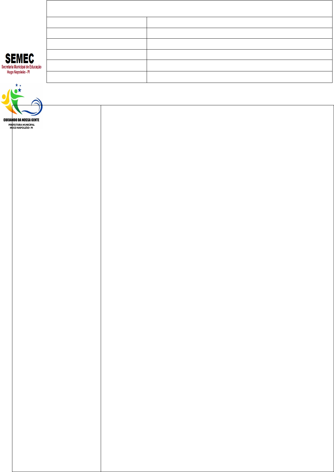 PREFEITURA MUNICIPAL DE HUGO NAPOLEÃO-PI SECRETARIA MUNICIPAL DE EDUCAÇÃO E CULTURA ESCOLA MUNICIPAL CICERO LINO DO NASCIMENTO PROFESSOR (A) SIMONE SOARES DE SOUSA ANO ESCOLAR 5º ANO / 2022 ÁREA DO CONHECIMENTO LINGUAGEM COMPONENTE CURRICULAR LÍNGUA PORTUGUESA MÊS E ANO OUTUBRO PLANEJAMENTO MENSAL HABILIDADES (EF15AR01) Identificar e apreciar formas distintas das artes visuais tradicionais e contemporâneas, cultivando a percepção, o imaginário, a capacidade de simbolizar e o repertório imagético. (EF15AR02) Explorar e reconhecer elementos constitutivos das artes visuais (ponto, linha, forma, cor, espaço, movimento etc.). (EF15AR03) Reconhecer e analisar a influência de distintas matrizes estéticas e culturais das artes visuais nas manifestações artísticas das culturas locais, regionais e nacionais. (EF15AR04) Experimentar diferentes formas de expressão artística (desenho, pintura, colagem, quadrinhos, dobradura, escultura, modelagem, instalação, vídeo, fotografia etc.), fazendo uso sustentável de materiais, instrumentos, recursos e técnicas convencionais e não convencionais. (EF15AR05) Experimentar a criação em artes visuais de modo individual, coletivo e colaborativo, explorando diferentes espaços da escola e da comunidade. (EF15AR06) Dialogar sobre a sua criação e as dos colegas, para alcançar sentidos plurais. (EF15AR07) Reconhecer algumas categorias do sistema das artes visuais (museus, galerias, instituições, artistas, artesãos, curadores etc.). (EF15AR08) Experimentar e apreciar formas distintas de manifestações da dança presentes em diferentes contextos, cultivando a percepção, o imaginário, a capacidade de simbolizar e o repertório corporal. (EF15AR09) Estabelecer relações entre as partes do corpo e destas com o todo corporal na construção do movimento dançado. (EF15AR10) Experimentar diferentes formas de orientação no espaço (deslocamentos, planos, direções, caminhos etc.) e ritmos de movimento (lento, moderado e rápido) na construção do movimento dançado. (EF15AR11) Criar e improvisar movimentos dançados de modo individual, coletivo e colaborativo, considerando os aspectos estruturais, dinâmicos e expressivos dos elementos constitutivos do movimento, com base nos códigos de dança. (EF15AR12) Discutir, com respeito e sem preconceito, as experiências pessoais e coletivas em dança vivenciadas na escola, como fonte para a construção de vocabulários e repertórios próprios. (EF15AR13) Identificar e apreciar criticamente diversas formas e gêneros de expressão musical, reconhecendo e analisando os usos e as funções da música em diversos contextos de circulação, em especial, aqueles da vida cotidiana. (EF15AR14) Perceber e explorar os elementos constitutivos da música (altura, intensidade, timbre, melodia, ritmo etc.), por meio de jogos, brincadeiras, canções e práticas diversas de composição/criação, execução e apreciação musical. (EF15AR15) Explorar fontes sonoras diversas, como as existentes no próprio corpo (palmas, voz, percussão corporal), na natureza e em objetos cotidianos, reconhecendo os elementos constitutivos da música e as características de instrumentos musicais variados. (EF15AR16) Explorar diferentes formas de registro musical não convencional (representação gráfica de sons, partituras criativas etc.), bem como procedimentos e técnicas de registro em áudio e audiovisual, e reconhecer a notação musical convencional. OBJETIVOS Compreender a obra de artistas que aderiram ao estilo arte pop no Brasil; compreender a arte exposta nos cartazes; identificar o ritmo das artes nas imagens. COMPETÊNCIAS ESPECÍFICAS DO COMPONENTE Explorar, conhecer, fruir e analisar criticamente práticas e produções artísticas e culturais do seu entorno social, dos povos indígenas, das comunidades tradicionais brasileiras e de diversas sociedades, em distintos tempos e espaços, para reconhecer a arte como um fenômeno cultural, histórico, social e sensível a diferentes contextos e dialogar com as diversidades. 2. Compreender as relações entre as linguagens da Arte e suas práticas integradas, inclusive aquelas possibilitadas pelo uso das novas tecnologias de informação e comunicação, pelo cinema e pelo audiovisual, nas condições particulares de produção, na prática de cada linguagem e nas suas articulações. 3. Pesquisar e conhecer distintas matrizes estéticas e culturais – especialmente aquelas manifestas na arte e nas culturas que constituem a identidade brasileira –, sua tradição e manifestações contemporâneas, reelaborando-as nas criações em Arte. 4. Experienciar a ludicidade, a percepção, a expressividade e a imaginação, ressignificando espaços da escola e de fora dela no âmbito da Arte. 5. Mobilizar recursos tecnológicos como formas de registro, pesquisa e criação artística. 6. Estabelecer relações entre arte, mídia, mercado e consumo, compreendendo, de forma crítica e problematizadora, modos de produção e de circulação da arte na sociedade. 7. Problematizar questões políticas, sociais, econômicas, científicas, tecnológicas e culturais, por meio de exercícios, produções, intervenções e apresentações artísticas. 8. Desenvolver a autonomia, a crítica, a autoria e o trabalho coletivo e colaborativo nas artes. 9. Analisar e valorizar o patrimônio artístico nacional e internacional, material e imaterial, com suas histórias e diferentes visões de mundo. OBJETO DO CONHECIMENTO (Conteúdo) Uma arte pop brasileira A arte dos cartazes O ritmo das imagens UNIDADE TEMÁTICA/ PRÁTICAS DE LINGUAGEM Teatro, Dança, Artes Visuais, Música e Artes Integradas. EXPERIÊNCIA DE APRENDIZAGEM (ESTRATÉGIAS / METODOLOGIAS) Leitura, lista de exercícios escritos e orais, pesquisas, atividades impressas e no livro, atividades práticas. Resgate de brincadeiras infantis. RECURSOS (MATERIAIS NESCESSÁRIOS) Livro didático, cadernos, quadro, pincel, pape