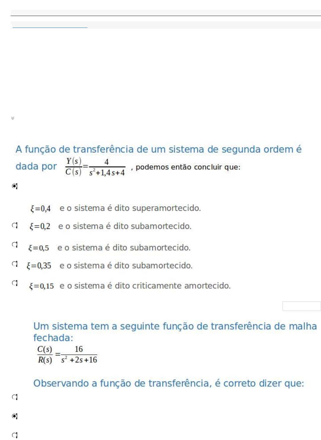 Fazer teste: AS – Unidade IV Parte superior do formulário Informações do teste Descrição Instruções Várias tentativas Este teste permite 2 tentativas. Esta é a tentativa número 2. Forçar conclusão Este teste pode ser salvo e retomado posteriormente. Suas respostas foram salvas automaticamente. Estado de Conclusão da Pergunta: PERGUNTA 1 1. a. b. c. d. e. 0,2 pontos PERGUNTA 2 1. a. Este é um sistema LIT. b. Este é um sistema de segunda ordem. c. Este é um sistema hidráulico. d. Este é um sistema de pressão. e. Este é um sistema não linear, variante no tempo. 0,2 pontos PERGUNTA 3 1. a. Um sistema hidráulico típico que pode ser modelado por uma equação para sistema de primeira ordem. b. Um sistema hidráulico típico que pode ser modelado por uma equação para sistema de segunda ordem. c. Um sistema pneumático típico que pode ser modelado por uma equação para sistema de segunda ordem. d. Um sistema típico de pressão que pode ser modelado por uma equação para sistema de primeira ordem. e. Um sistema típico de pressão que pode ser modelado por uma equação para sistema de ordem superior. 0,2 pontos PERGUNTA 4 1. a. Um sistema para máquinas de café de segunda ordem. b. Um sistema de misturador típico de primeira ordem. c. Um sistema de misturador típico de segunda ordem. d. Um sistema de aquecimento típico de primeira ordem. e. Um sistema de aquecimento típico de segunda ordem. Parte inferior do formulário