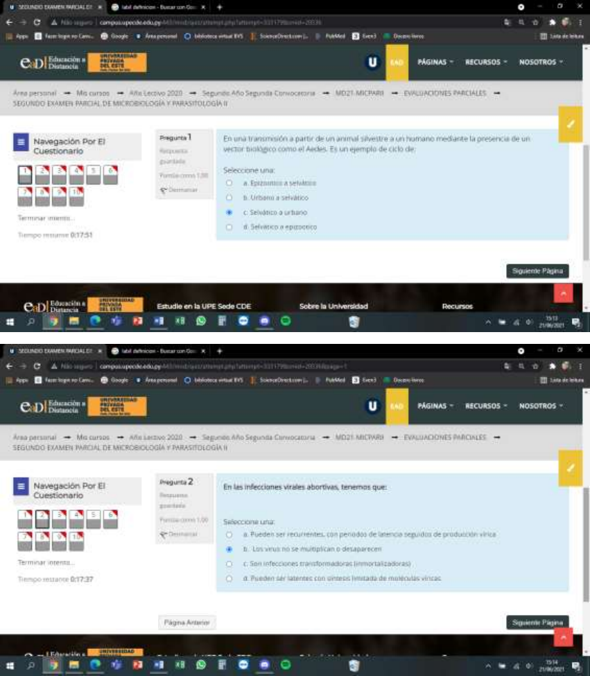 Pregunta 1 Respuesta guardada Puntúa como 1,00 Marcar pregunta Enunciado de la pregunta Las larvas de la triquinosis se enquistan en: Seleccione una: cerebro ojo corazón pulmón músculo Pregunta 2 Respuesta guardada Puntúa como 1,00 Marcar pregunta Enunciado de la pregunta La transmisión de oncocercosis se da por picaduras de moscas negras hembra del género Simulium, cuyo hábitat preferido son los arroyos y ríos, especialmente los rápidos, donde deposita sus huevos. Seleccione una: Verdadero Falso Pregunta 3 Respuesta guardada Puntúa como 1,00 Marcar pregunta Enunciado de la pregunta Las siguientes son características frecuentes de los coronavirus, excepto una. ¿Cuál no es correcta? Seleccione una: Poseen antígenos de reactividad cruzada con los virus de la influenza Tienen una distribución mundial Pueden causar gastroenteritis Contienen los genomas más grandes entre los virus de RNA Pregunta 4 Respuesta guardada Puntúa como 1,00 Marcar pregunta Enunciado de la pregunta El virus de la rabia es destruido rápidamente por Seleccione una o más de una: Tratamiento con tripsina Radiación ultravioleta Calentamiento a 56°C durante 1 h Tratamiento con éter Pregunta 5 Respuesta guardada Puntúa como 1,00 Marcar pregunta Enunciado de la pregunta Según la OMS, Wuchereria bancrofti, que provoca sólo alrededor del 10% de los casos de filariasis linfática Seleccione una: Verdadero Falso Pregunta 6 Respuesta guardada Puntúa como 1,00 Marcar pregunta Enunciado de la pregunta Los lentivirus no son oncógenos y pueden ser destructores de células Seleccione una: Verdadero Falso Pregunta 7 Respuesta guardada Puntúa como 1,00 Marcar pregunta Enunciado de la pregunta Los nematodos de la familia de las filarias Wuchereria bancrofti , Brugia malayi y Onchocerca volvulus , son gusanos lar gos finos cuyas formas adultas se localizan en los tejidos. Seleccione una: Verdadero Falso Pregunta 8 Respuesta guardada Puntúa como 1,00 Marcar pregunta Enunciado de la pregunta Con base en las secuencias del gen env , VIH-1 abarca tres grupos virales diferentes (M, N y O) Seleccione una: Verdadero Falso Pregunta 9 Respuesta guardada Puntúa como 1,00 Marcar pregunta Enunciado de la pregunta En casos graves de infestación por Tricocéfalos ocurren las siguientes manifestaciones, excepto: Seleccione una: prolapso rectal sangrado abundante de la mucosa del intestino delgado colitis desnutrición rectitis Pregunta 10 Respuesta guardada Puntúa como 1,00 Marcar pregunta Enunciado de la pregunta Con respecto al mecanismo de trasmisión de la triquinelosis es correcto decir: Seleccione una: Los vectores mecánicos pueden favorecer el transporte de huevos del parásito, contaminando así alimentos y agua. La larva penetra a través de la piel, especialmente a través de la exposición de los miembros inferiores a suelos húmedos El ser humano se infesta de Trichinella spiralis al consumir carne de cerdo cruda o mal cocida infectada con larvas. El humano se infecta al ingerir agua contaminada con huevos embrionados infectantes Pregunta 11 Respuesta guardada Puntúa como 1,00 Marcar pregunta Enunciado de la pregunta Los coronavirus son partículas de 120 a 160 nm, con envoltura, que contienen un genoma no segmentado de RNA monocatenario de polaridad positiva Seleccione una: Verdadero Falso Pregunta 12 Respuesta guardada Puntúa como 1,00 Marcar pregunta Enunciado de la pregunta ¿De cuál de las siguientes infecciones del sistema nervioso central es característica la presencia de cuerpos de inclusión citoplásmicos eosinófilos, en las neuronas, denominados cuerpos de Negri, en las neuronas? Seleccione una: Panencefalitis esclerosante subaguda Encefalitis posvacunal Enfermedad de Borna Rabia Nueva variante de enfermedad de Creutzfeldt-Jakob Pregunta 13 Respuesta guardada Puntúa como 1,00 Marcar pregunta Enunciado de la pregunta Todos los lentivirus de primates utilizan como receptor la molécula CD8, que se expresa en macrófagos y en linfocitos T Seleccione una: Verdadero Falso Pregunta 14 Respuesta guardada Puntúa como 1,00 Marcar pregunta Enunciado de la pregunta La Oncocercosis o “ceguera de los ríos” está causada por la especie de filaria Onchocerca volvulus. Es una de las causas de ceguera más importante en el mundo y además produce una dermatitis severa. Seleccione una: Verdadero Falso Pregunta 15 Respuesta guardada Puntúa como 1,00 Marcar pregunta Enunciado de la pregunta La filariasis linfática, conocida generalmente como elefantiasis, es una infección humana que se produce por la transmisión de unos parásitos denominados filarias a través de los mosquitos del género: Seleccione una: Anopheles Aedes Triatoma Culex Pregunta 16 Respuesta guardada Puntúa como 1,00 Marcar pregunta Enunciado de la pregunta El VIH es inactivado en los extremos de pH (pH de 1.0; pH de 13.0) Seleccione una: Verdadero Falso Pregunta 17 Respuesta guardada Puntúa como 1,00 Marcar pregunta Enunciado de la pregunta Una mujer de 63 años de edad presenta fiebre, cefalea, malestar, mialgias y tos. Es la época inicial de la temporada de invierno de los virus respiratorios y el médico de la paciente no sabe cuáles virus están presentes en la población. ¿Cuál de los siguientes virus no es una causa de enfermedad respiratoria aguda? Seleccione una: Coronavirus Rotavirus Virus de la influenza Adenovirus Virus sincitial respiratorio Pregunta 18 Respuesta guardada Puntúa como 1,00 Marcar pregunta Enunciado de la pregunta ¿Cuál de las siguientes aseveraciones en torno a las vacunas contra la rabia en el ser humano es correcto afirmar? Seleccione una: Puede causar encefalitis alérgica cuando se prepara a partir de tejido nervioso La vacuna de embrión de pato es muy antigénica y sólo se necesita una sola dosis Contiene múltiples tipos antigénicos del virus de la rabia Se puede utilizar sólo para la profilaxis previa a la exposición Contiene virus de la rabia vivos atenuados Pregunta 19 Respuesta guar
