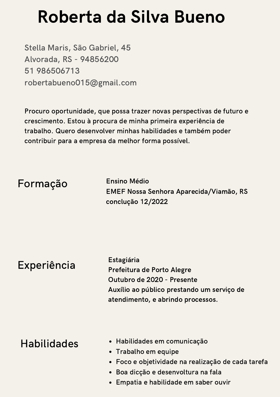 Stella Maris, São Gabriel, 45 Alvorada, RS - 94856200 51 986506713 robertabueno015@gmail.com Roberta da Silva Bueno Formação Ensino Médio EMEF Nossa Senhora Aparecida/Viamão, RS conclução 12/2022 Habilidades Experiência Habilidades em comunicação Trabalho em equipe Foco e objetividade na realização de cada tarefa Boa dicção e desenvoltura na fala Empatia e habilidade em saber ouvir Estagiária Prefeitura de Porto Alegre Outubro de 2020 - Presente Auxílio ao público prestando um serviço de atendimento, e abrindo processos. Procuro oportunidade, que possa trazer novas perspectivas de futuro e crescimento. Estou à procura de minha primeira experiência de trabalho. Quero desenvolver minhas habilidades e também poder contribuir para a empresa da melhor forma possível.