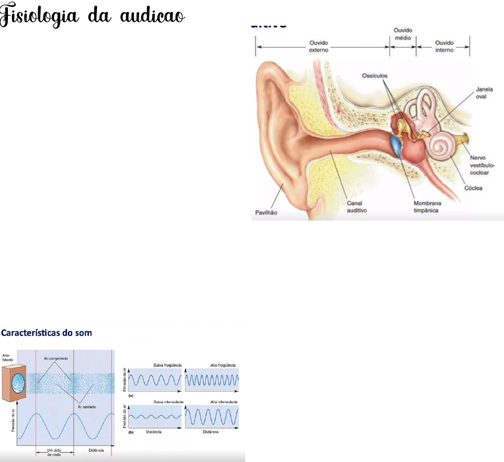 O som é a vibração do ar, imaginando que tem uma caixa, esse ar vai passar vibrando em algumas regiões mais comprimidas e outras com menos moléculas que seriam o ar rarefeito, e essa sequencia. Esse som ai ser captado pelo nosso ouvido A gente pode caracterizar esse som pela sua frequencia: Som de baixa frequencia e som de alta frequencia Frequencia é o comprimento de onda, quando mais baixa a frequencia sera um som mais grave, já sons mais agudos serão alta frequencia Sons de baixa frequencia = som grave Sons de alta frequencia = sons agudos Outra característica do som é a sua intensidade, que é o volume do som, sendo alta ou baixa. No gráfico de intensidade está em mesma frequencia O que caracteriza ser alta ou baixa intensidade, é o numero de moléculas que eu vou ter no ar comprimido e rareifeito Quando tem alta intensidade tem muitas moléculas de ar ou seja mais comprimido. Nosso ouvido, e sistema nervoso tem a capacidade de entender diversas intensidades e frequências Variação de frequencia audível : 20 a 20.000hz Do pavilhão auditivo até nossa membrana timpânica, a gente fala que é o ouvido externo No ouvido médio tem os ossículos: martelo, bigorna e estribo. É uma cavidade que possui esses ossinhos e alguns músculos e também preenchida por ar O ouvido interno faz a transmissão do sinal mecânico no sinal elétrico e a região que participa é a cóclea que tem formato de espiral e sai dai o nervo auditivo que vai levar informação para o SNC O som vai chegar ate a membrana timpânica, da membrana timpânica vai vibrar por esses ossículos A função desse ossículos é amplificar esse som que está chegando, o som que está sendo convertido na membrana timpânica vai ser amplificado no ouvido médio e a vibração desses ossículos vai transmitir para a região da cóclea O estribo esta ligado a região da cóclea através de uma janela oval A cóclea é revestida por uma estrutura óssea mas bem na região da janela oval não é osso, pois se fosse não conseguiria transmitir esse efeito mecânico. Esse estribo vai funcionar como um pistão. Então ele vai movimentar essa janela oval, que vai produzir um movimento na cóclea e isso vai conseguir transmitir o som que foi captado pela membrana timpânica Dentro da cóclea é preenchido por liquido e para transmitir a informação para a cóclea recisa amplificar esse efeito mecânico Existem dois músculos importante: musculo tensor do tímpano e musculo estapédio. Esses dois músculos tem efeito de amenizar essa intensidade. Ou seja é um mecanismo protetor do nosso ouvido para sons de alta intensidade/volume. Esses músculos tem um retardo na contração! Imagina então que o som ta chegando e captado pela membrana timpânica, vai vibrar os ossículos, que através do estribo como um pistão vai transmitir essa força mecânica para dentro da cóclea. No ouvido interno temos a cóclea e os canais semicirculares que estão relacionados ao equilíbrio. A cóclea tem 3 cavidades. Essas cavidades são as escalas ou rampas. A escala vestibular é separada da escala media por membrana de reissner. So tem osso na região externa da cóclea. Ou seja se houver algum problema na escala vestibular, pode afetar a escala media Sobre a membrana basilar tem o órgão de Corti que é a região onde se encontra células responsáveis por transduzir o sinal mecânico em sinal elétrico. Existe liquido em toda a cóclea. Existe uma comunicação entre a rampa do vestíbulo e rampa do tímpano ocorre na porção final da cóclea. Existe um liquido que esta dento da escala media que é a endo linfa e outro que esta na rampa timpanica e vestibular que é o perilinfa Quando oos ossículos se movimentam, e o estribo vai movimentar essa janela oval como se fosse um pistao movimentando o liquido dentro da cóclea Para se tornar mais maleável existe a janela redonda que volta o movimento Na escala media tem a membrana basilar que tem o órgão de Corti. Uma vez que o estribo faz o movimento de pistão ele vai movimentar o liquido dentro da cóclea e a onda sonora vai movimentr o liquido e formando ondas que seram detectadas por células que são capazes de detectar essa alteração mecânica A membrana basilar que se movimenta. Tem uma estrutura mais fina na base e uma mais larga no ápice. A região da base mais fina é mais rígida, dura e na região do ápice é mais flexível. De acordo com a frequencia que o som ta sendo produzido, ele vai ativar células diferentes em regiões diferentes da região basilar, as freq. Mais altas: agudos serão detectados na base da memb basilar, já sons mais graves de freuqencias menores serão detectados no ápice. Na escala vestibular e timpânica tem a perilinfa Na escala media tem a endolinfa – liquido tem alta concentração de potássio. Importante para a trandução do sinal. Sons mais graves no ápice O que é composto o órgão de corti? Diversas células. As células que são responsáveis em transduzir esse sinal mecânico em elétrico que são as celulas ciliadas do órgão de corti que transmitem informação para o axônio que forma o gânglio espiral que esta dentro da cóclea que vai formar o nervo coclear e vai subir pro SNC. A membrana tecturial junto aos cílios vao ser importante para conseguir a transdução. Os cílios ficam apoiados na membrana tectorial e de acordo com o movimento desses cílios é que vai induzir uma despolarização dessa célula ciliada. Através do movimento do cilio, causa a abertura do canal de potássio e a entrada de potássio e acontece a movimentação As célula ciliada libera glutamato e transmite a informação para o neurônio. Então é um mecanismo diferente: sinal mecânico abrindo esses canais e entra potássio causando uma despolarização na célula fazendo com que abra canais de cálcio e aumento de cálcio intracelular, induz a translocação dessas vesículas que contem um neurotransmissor que vai induzir o potencial de 