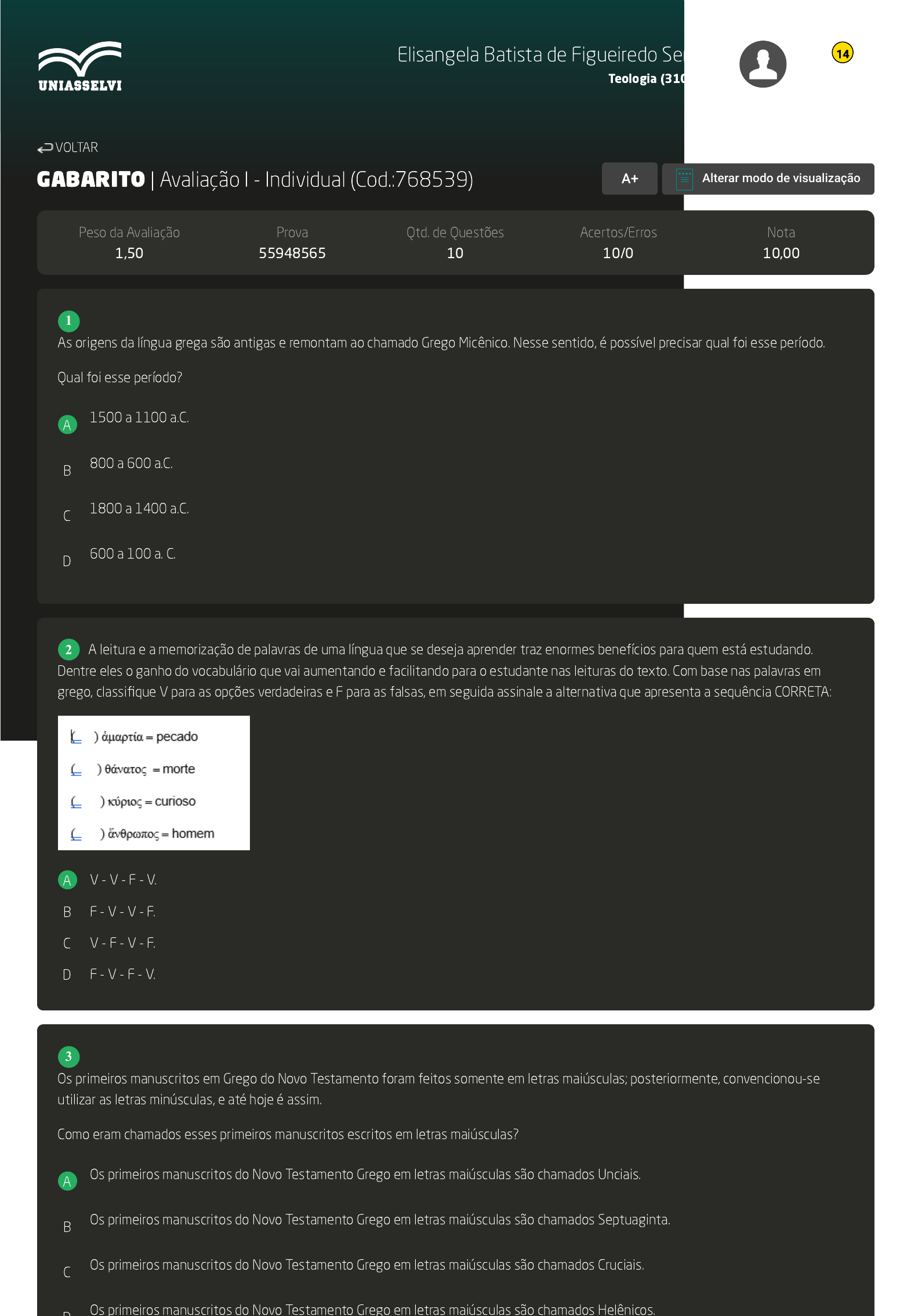 GABARITO | Avaliação I - Individual (Cod.:768539) Peso da Avaliação 1,50 Prova 55948565 Qtd. de Questões 10 Acertos/Erros 10/0 Nota 10,00 As origens da língua grega são antigas e remontam ao chamado Grego Micênico. Nesse sentido, é possível precisar qual foi esse período. Qual foi esse período? A 1500 a 1100 a.C. B 800 a 600 a.C. C 1800 a 1400 a.C. D 600 a 100 a. C. A leitura e a memorização de palavras de uma língua que se deseja aprender traz enormes benefícios para quem está estudando. Dentre eles o ganho do vocabulário que vai aumentando e facilitando para o estudante nas leituras do texto. Com base nas palavras em grego, classifique V para as opções verdadeiras e F para as falsas, em seguida assinale a alternativa que apresenta a sequência CORRETA: A V - V - F - V. B F - V - V - F. C V - F - V - F. D F - V - F - V. Os primeiros manuscritos em Grego do Novo Testamento foram feitos somente em letras maiúsculas; posteriormente, convencionou-se utilizar as letras minúsculas, e até hoje é assim. Como eram chamados esses primeiros manuscritos escritos em letras maiúsculas? A Os primeiros manuscritos do Novo Testamento Grego em letras maiúsculas são chamados Unciais. B Os primeiros manuscritos do Novo Testamento Grego em letras maiúsculas são chamados Septuaginta. C Os primeiros manuscritos do Novo Testamento Grego em letras maiúsculas são chamados Cruciais. D Os primeiros manuscritos do Novo Testamento Grego em letras maiúsculas são chamados Helênicos. VOLTAR A+ Alterar modo de visualização 1 2 3 Elisangela Batista de Figueiredo Serafim Teologia (3102835) 14 D p g O processo de aprendizado de uma língua requer alguns elementos importantes por parte do estudante para que haja uma boa aprendizagem. No caso língua grega, existem alguns elementos que são fundamentais para o processo desta aprendizagem. Com base no exposto, analise as sentenças a seguir: I- Algumas atitudes são imprescindíveis para o estudante de grego avançar no conhecimento dessa língua: dedicar tempo, ter disciplina, perseverança e propósito. II- Os materiais elementares para o estudo do grego Koiné são: o Novo Testamento Grego, o dicionário grego-português/português-grego, uma gramática do Novo Testamento Grego e uma boa gramática da Língua Portuguesa. III- Alguns elementos fundamentais para o aprendizado da língua grega são: ter um professor de origem grega, dispor de tempo para visitar a Grécia e falar inglês. IV- Existem muitos materiais, como concordâncias, léxicos, livros de análise, entre outros, que poderão somar e ser muito úteis no processo de aprendizagem da língua grega. Assinale a alternativa CORRETA: A As sentenças I, II e IV estão corretas. B As sentenças I, III e IV estão corretas. C As sentenças II e III estão corretas. D As sentenças III e IV estão corretas. Tanto o processo de traduzir uma palavra, sentença ou frase de uma língua desconhecida para a nossa, como fazer o processo inverso, isto é, traduzir uma palavra da sua própria língua para outro idioma exige memorização e domínio de ambos vocabulários. Por isso, é extremamente importante aprender as palavras em grego, e saber qual a sua tradução no português. Com base nas palavras em grego, pensando na tradução certa, assinale a alternativa CORRETA: A Alternativa B. B Alternativa D. C Alternativa C. D Alternativa A. Os alfabetos possuem uma determinada quantidade de letras, que normalmente são distribuídas em consoantes e vogais. No grego Koiné possuímos consoantes e vogais, como em outras línguas. Com base em quantas letras compõem o alfabeto, assinale a alternativa CORRETA: A 26 letras - 19 consoantes e 7 vogais. B 24 letras - 17 consoantes e 7 vogais. C 27 letras - 20 consoantes e 7 vogais. D 23 letras - 17 consoantes e 6 vogais. Ao estudar das letras do alfabeto grego encontramos determinadas peculiaridades, o que é muito comum no estudo de uma determinada língua. Essas particularidades muitas vezes confundem e trazem dificuldades para alguns estudantes, entretanto, elas são 4 5 6 7 Elisangela Batista de Figueiredo Serafim Teologia (3102835) 14 muito importantes dentro do funcionamento daquela língua. Com base nas letras do alfabeto grego, analise as sentenças a seguir e assinale a alternativa CORRETA: A As sentenças I e II estão corretas. B As sentenças I e III estão corretas. C As sentenças II e IV estão corretas. D As sentenças II e III estão corretas. Uma das classes gramaticais é o artigo. O artigo é uma palavra que antepomos aos substantivos para dar aos seres um sentido determinado ou indeterminado. No caso do português, os artigos podem ser definidos (o, a, os, as) ou indefinidos (um, uma, uns, umas). Com base no uso do artigo na língua grega, classifique V para as sentenças verdadeiras e F para as falsas: ( ) No grego, há apenas um tipo de artigo, o definido. A falta do artigo é suprida pelo emprego do número um. ( ) Ao fazer uso do artigo, o substantivo é definido e, quando não utilizado, pode ser definido ou indefinido. ( ) O fato de não haver regras fixas sobre o uso do artigo deve levar à conclusão de que a sua presença ou ausência não tem importância. ( ) A presença do artigo na língua grega identifica ou distingue uma coisa ou uma pessoa das demais, enquanto a ausência do artigo sobressai a qualidade do substantivo. Assinale a alternativa que apresenta a sequência CORRETA: A F - V - F - V. B F - V - V - F. C V - F - V - V. D V - V - F - V. Estudar a parte gramatical de uma determinada língua traz luz para o estudante em vários aspectos. O conhecimento dos diversos aspectos gramaticais, ortográficos, e funcionais de uma língua é primordial para a assimilação mais aprofundada do seu uso e funcionamento. Com base no exposto, classifique V para as sentenças verdadeiras e F para as falsas: ( ) Geralmente, os substantivos do sexo masculino são masculinos e os do feminino são femininos. Há também uma ter