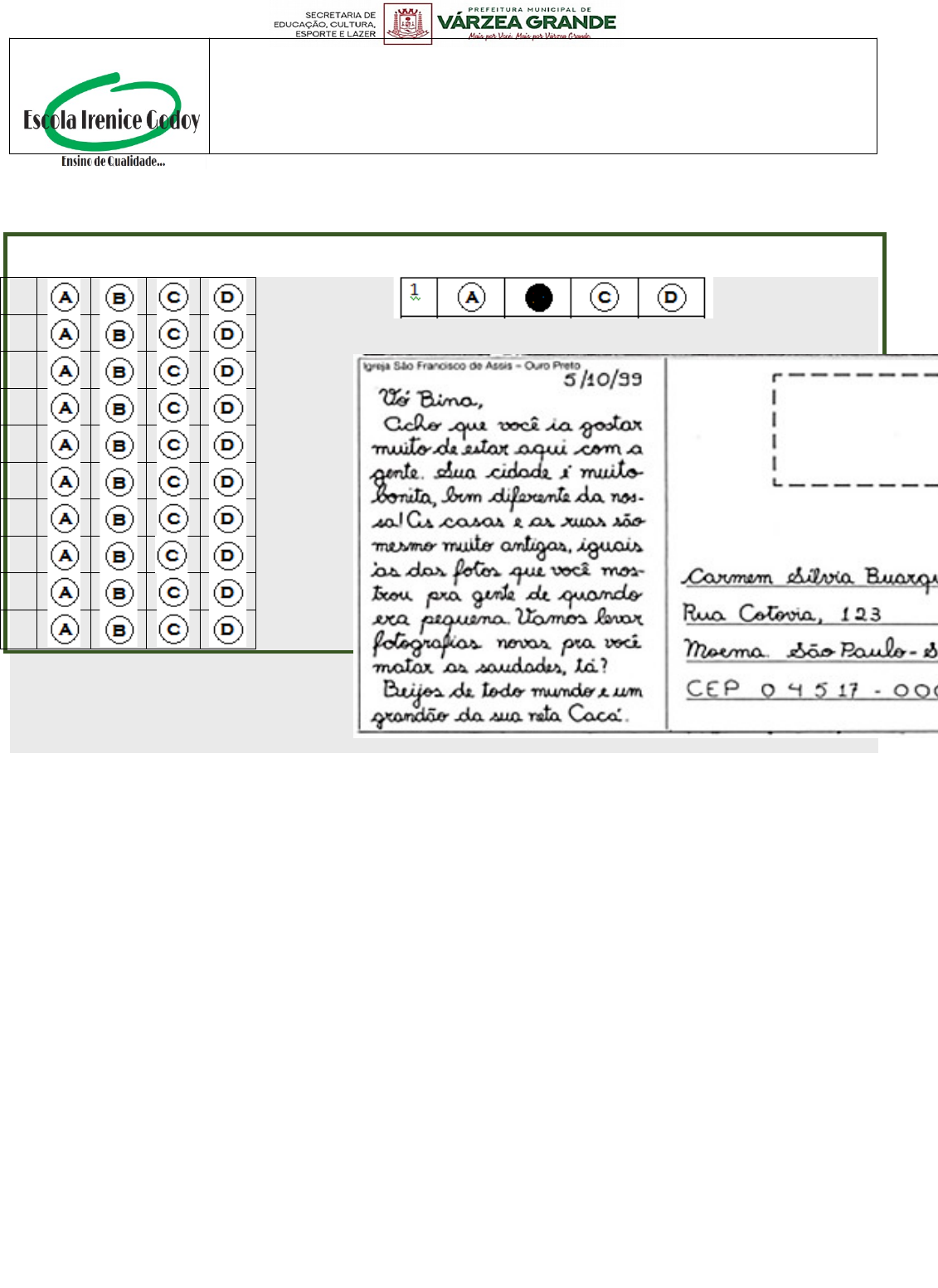 Emeb “Profª IRENICE GODOY DE CAMPOS E SILVA PROFESSORA: MIRIAM OBEM TURMA: 4ºB. 2º BIMESTRE ALUNO(A):________________________________ DATA:__/__/____ COMPONENTE CURRICULAR: LINGUAGEM – LÍNGUA PORTUGUESA Avaliação Gabarito Você deverá pintar apenas uma alternativa Ex: 1 2 3 4 5 6 7 8 9 10 1)Leia o texto abaixo. L.E.R. Leitura, Escrita e Reflexão. FTD: São Paulo. p. 112. Esse texto foi escrito para: A. Fazer propaganda de uma cidade diferente. B. Estabelecer comunicação com alguém distante. C. Vender fotografias de cidades muito antigas. D. Contar histórias de velhas ruas da cidade. 2) Leia o texto abaixo. A bruxa Mariana comentou: — Aí aparece a bruxa. — Sim... — Mas uma bruxa tão bonita, tão bonita, que só você vendo. Foi aí que Rogerinho soltou: — Bruxa bonita assim só podia ser fada, né? O travessão foi usado nesse texto para indicar: (A) a descrição do ambiente. (B) a fala das personagens. (C) a emoção das personagens. (D) a beleza da bruxa. 3) Marque a ÚNICA alternativa que contenha substantivos, respectivamente, ABSTRATO, CONCRETO e CONCRETO. A) FADA – FÉ – MENINO B) FÉ – FOFOCA – CRUZ C) ALEGRIA – FACA – MENINO D) AMOR – CALOR – MENINO 4) Indique a alternativa em que todos os substantivos são derivados: A) FLOR-DE-LIS – PRATINHO – SAPATO B) FERRO – PEDRA – PÃO C) FERREIRO – SAPATEIRO – PEDREIRO D) LIVRARIA – LIVREIRO – LIVRO 5) Relacione as duas colunas, de acordo com a classificação dos substantivos. (1) Comum ( ) Manada (2) Próprio ( ) Diário (3) Composto ( ) Paris (4) Coletivo ( ) Passatempo (5) Derivado ( ) Bola Qual a sequência correta: A) 4-5-2-3-1 B) 5-4-3-2-1 C) 2-3-4-5-1 D) 1-2-3-4-5 6) Leia a tira e resolva à questão: Sendo o adjetivo uma palavra que se refere a um substantivo indicando-lhe um característica, o adjetivo da tirinha é: A) CUIDADO. B) PÉS. C) TRABALHO. D) SUJOS. 7) Assinale a alternativa em que todas as palavras são paroxítonas: A) LEVANTAR – REMOTO – REPULSIVO – BONITO B) FÁCIL - BELO – ERRADO – REPÚDIO C) CERTO – MÁGICA – TRISTEZA – SOFÁ D) REPELENTE – DIFÍCIL – TÊM – FALAR 8) Qual palavra abaixo as sílabas foram separadas INCORRETAMENTE? A) EN-XER-GAR. B) LA-GO-A. C) PA-PA-GAIO. D) DI-Á-RIO. 9) A alternativa em que a classificação da palavra quanto ao número de sílabas está CORRETO é: A) POEIRA (POLISSÍLABA) B) BAINHA (DISSÍLABA) C) CONSTAR (TRISSÍLABA) D) PNEU (MONOSSÍLABA) 10) Leia o texto abaixo: No trecho: “A vacinação já começou, mas a pandemia não acabou.”, as palavras destacadas são verbos que estão no tempo: a) passado. b) presente. c) futuro. COMPONENTE CURRICULAR: LINGUAGEM – ARTES E EDUCAÇÃO FÍSICA 1) Enumere a dança com sua características. Observe que algumas danças apresentam mais de uma característica: 2) Podemos definir, de forma resumida, ginastica geral como sendo: A) Somente as atividades realizadas em academia B) Esportes coletivos C) Atividades que desenvolvem as capacidades físicas. D) Apenas atividade de equilíbrio. 3) Marque a alternativa que não apresenta uma atividade de ginástica: