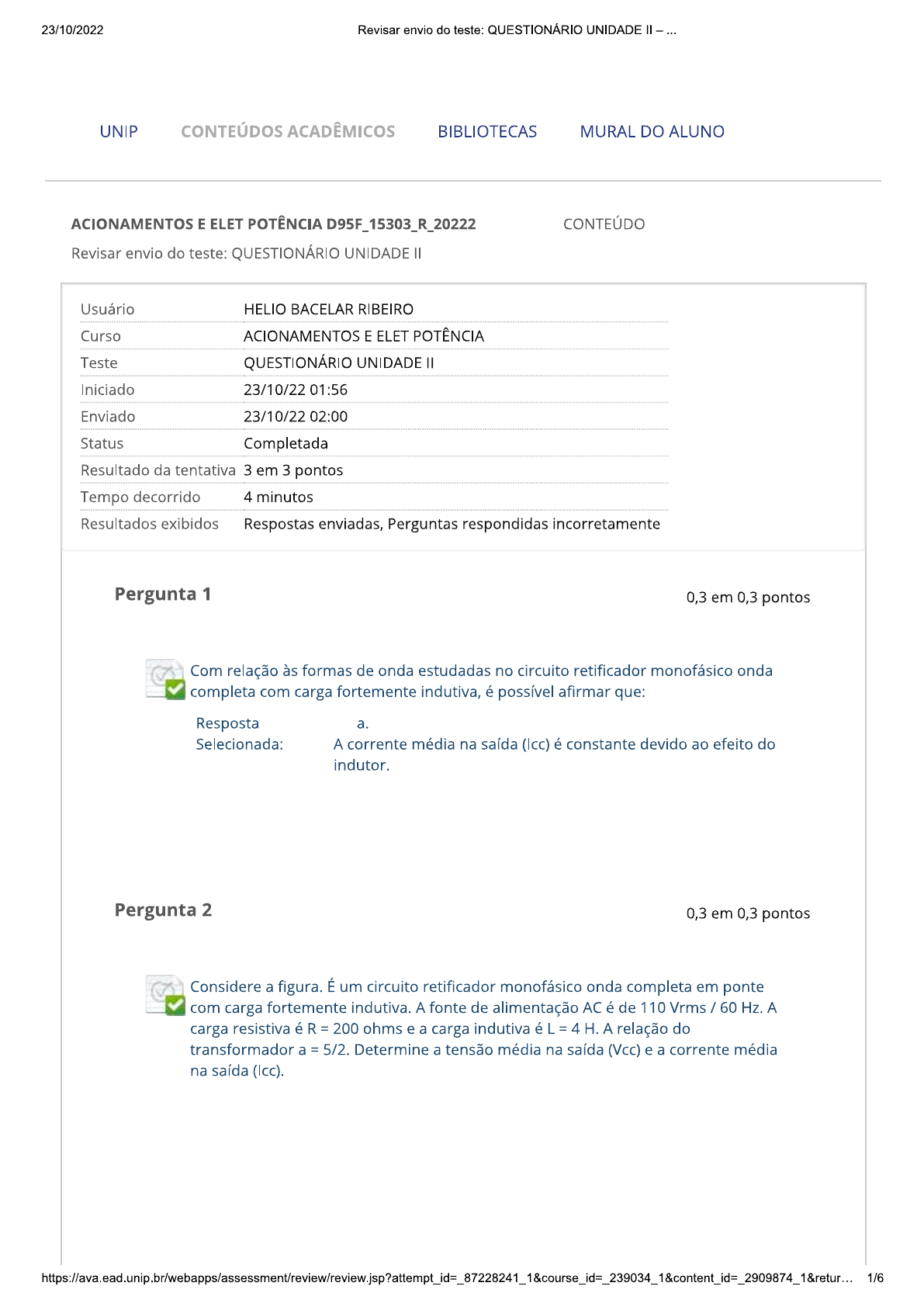 23/10/2022 Revisar envio do teste: QUESTIONÁRIO UNIDADE Il — ... UNIP BIBLIOTECAS MURAL DO ALUNO ACIONAMENTOS E ELET POTÊNCIA D95F 15303 R 20222 CONTEÚDO Revisar envio do teste: QUESTIONÁRIO UNIDADE II Usuário HELIO BACELAR RIBEIRO Curso ACIONAMENTOS E ELET POTÊNCIA Teste QUESTIONÁRIO UNIDADE II Iniciado 23/10/22 01:56 Enviado 23/10/22 02:00 Status Completada Resultado da tentativa 3 em 3 pontos Tempo decorrido 4 minutos Resultados exibidos | Respostas enviadas, Perguntas respondidas incorretamente Pergunta 1 0,3 em 0,3 pontos Com relação às formas de onda estudadas no circuito retificador monofásico onda 4 completa com carga fortemente indutiva, é possível afirmar que: Resposta a. Selecionada: A corrente média na saída (lcc) é constante devido ao efeito do indutor. Pergunta 2 0,3 em 0,3 pontos Considere a figura. É um circuito retificador monofásico onda completa em ponte | com carga fortemente indutiva. A fonte de alimentação AC é de 110 Vrms / 60 Hz. A carga resistiva é R = 200 ohms e a carga indutiva é L= 4 H. A relação do transformador a = 5/2. Determine a tensão média na saída (Vcc) e a corrente média na saída (lcc). https://ava.ead.unip.br/webapps/assessment/review/review.jsp?attempt id= 87228241 1&course id= 239034 1&content id= 2909874 1&retur... 1/6 23/10/2022 Revisar envio do teste: QUESTIONÁRIO UNIDADE Il — ... Saida n D1 D3 R1 Tr Secundário Se vi Boa o - + (5) 110Vrms : E += 60Hz 0º Relação 5 : 2 4 L1 |: A 04 Á D2 4H pr Fonte: Multisim (2022). Resposta Selecionada: a VCc=38,72V/Icc=193 ma. Pergunta 3 0,3 em 0,3 pontos Os sinais elétricos são definidos de acordo com suas respectivas formas de onda. 4 Analisando a forma de onda da figura é possível afirmar que corresponde a um: https://ava.ead.unip.br/webapps/assessment/review/review.jsp?attempt id= 87228241 1&course id= 239034 1&content id= 2909874 1&retur... 2/6 23/10/2022 Revisar envio do teste: QUESTIONÁRIO UNIDADE Il — ... Interactive 1 Trigsered mo em Fonte: Multisim (2022). Resposta Selecionada: e. Sistema de alimentação trifásica. Pergunta 4 0,3 em 0,3 pontos Analise as afirmações: 1) Para uma alimentação trifásica, as fases estão defasadas em 180º entre elas. II) Na análise de circuitos trifásicos é verificada a existência da tensão de fase e tensão de linha. HI) Os sistemas trifásicos são capazes de entregar mais potência à carga em relação ao sistema monofásico. É correto o que se afirma em: Resposta Selecionada: d Ile III. Pergunta 5 0,3 em 0,3 pontos https://ava.ead.unip.br/webapps/assessment/review/review.jsp?attempt id= 87228241 1&course id= 239034 1&content id= 2909874 1&retur... 3/6 23/10/2022 Revisar envio do teste: QUESTIONÁRIO UNIDADE Il — ... Analise as afirmações: |) Da mesma forma que uma alimentação trifásica, as cargas trifásicas podem ser associadas em estrela ou triângulo. II) Existem várias formas de fazer a ligação/fechamento das bobinas com o transformador trifásico. Exemplo: ligação triângulo-estrela. HI) Os transformadores trifásicos podem ser empregados em subestações elevadoras e/ou rebaixadoras de tensão. É correto o que se afirma em: Resposta Selecionada: elle ll. Pergunta 6 0,3 em 0,3 pontos Analise a afirmação: É um dispositivo capaz de transformar um nível de tensão CA em outro nível de tensão CA pela ação de um campo magnético. Essencialmente, esse dispositivo é constituído de duas ou mais bobinas (enrolamentos) enroladas em um núcleo ferromagnético. A afirmação se refere a um: Resposta Selecionada: c. Transformador. Pergunta 7 0,3 em 0,3 pontos Analise as afirmações: 1) Os transformadores trifásicos podem ser empregados para fornecer tensão e corrente contínua diretamente a uma determinada carga CC. 11) Existem várias formas de fazer a ligação/fechamento das bobinas com o transformador trifásico. Exemplo: ligação triângulo-estrela. HI) Da mesma forma que são observadas em uma alimentação trifásica, as cargas trifásicas podem ser associadas em estrela ou triângulo. É correto o que se afirma em: Resposta Selecionada: alle lil. Pergunta 8 0,3 em 0,3 pontos https://ava.ead.unip.br/webapps/assessment/review/review.jsp?attempt id= 87228241 1&course id= 239034 1&content id= 2909874 1&retur... 4/6 23/10/2022 Revisar envio do teste: QUESTIONÁRIO UNIDADE Il — ... Analise a figura e assinale a alternativa incorreta: 11 lp E —+ -— o > O o & No N Fonte: Multisim (2022). e Vs & Resposta Selecionada: e NP/Ns=IP/Is. Pergunta 9 0,3 em 0,3 pontos Analise as afirmações: | |) A sequência de fases é a ordem no tempo na qual as tensões passam por seus respectivos valores máximos. Il) A sequência de fases é importante, por exemplo, para controlar a velocidade de um motor de indução conectado à fonte de tensão trifásica. HI) A potência instantânea em um sistema trifásico pode ser constante, acarretando menos vibrações em máquinas trifásicas. É correto o que se afirma em: Resposta Selecionada: alelil. Pergunta 10 0,3 em 0,3 pontos Analise as afirmações: 4 1) As fontes trifásicas senoidais podem ter alimentação estrela ou triângulo. Il) As fases de uma alimentação trifásica podem ser representadas como R,SeT. Il) Independentemente do tipo de alimentação trifásica (estrela ou triângulo), as relações de tensão e corrente são iguais nos dois casos. É correto o que se afirma em: Resposta Selecionada: b lell. https://ava.ead.unip.br/webapps/assessment/review/review.jsp?attempt id= 87228241 1&course id= 239034 1&content id= 2909874 1&retur... 5/6 23/10/2022 Revisar envio do teste: QUESTIONÁRIO UNIDADE Il... Domingo, 23 de Outubro de 2022 02h00min41s GMT-03:00 <— OK https://ava.ead.unip.br/webapps/assessment/review/review.jsp?attempt id= 87228241 1&course id= 239034 1&content id= 2909874 1&retur... 6/6