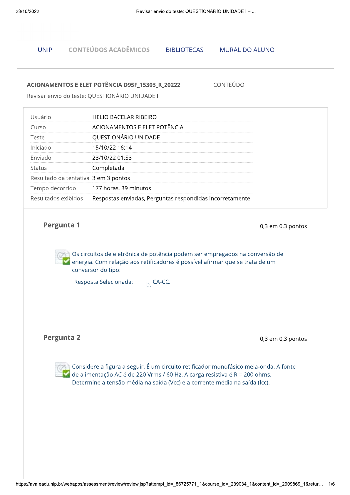 23/10/2022 Revisar envio do teste: QUESTIONÁRIO UNIDADE |- ... UNIP BIBLIOTECAS MURAL DO ALUNO ACIONAMENTOS E ELET POTÊNCIA D95F 15303 R 20222 CONTEÚDO Revisar envio do teste: QUESTIONÁRIO UNIDADE | Usuário HELIO BACELAR RIBEIRO Curso ACIONAMENTOS E ELET POTÊNCIA Teste QUESTIONÁRIO UNIDADE | Iniciado 15/10/22 16:14 Enviado 23/10/22 01:53 Status Completada Resultado da tentativa 3 em 3 pontos Tempo decorrido 177 horas, 39 minutos Resultados exibidos | Respostas enviadas, Perguntas respondidas incorretamente Pergunta 1 0,3 em 0,3 pontos Os circuitos de eletrônica de potência podem ser empregados na conversão de 4 energia. Com relação aos retificadores é possível afirmar que se trata de um conversor do tipo: Resposta Selecionada: p, CA-CC. Pergunta 2 0,3 em 0,3 pontos Considere a figura a seguir. É um circuito retificador monofásico meia-onda. A fonte | de alimentação AC é de 220 Vrms / 60 Hz. A carga resistiva é R = 200 ohms. Determine a tensão média na saída (Vcc) e a corrente média na saída (lcc). https://ava.ead.unip.br/webapps/assessment/review/review.jsp?attempt id= 86725771 1&course id= 239034 1&content id= 2909869 1&retur... 1/6 23/10/2022 Revisar envio do teste: QUESTIONÁRIO UNIDADE |- ... In D1 Out Os » —+0 VCA "“ |) 220Vrms R1 T es 2009 Fonte: Multisim (2022). Resposta Selecionada: a VCc=98,81V/Icc=494 ma. Pergunta 3 0,3 em 0,3 pontos Considerando o circuito da figura é correto afirmar que se trata de um circuito: https://ava.ead.unip.br/webapps/assessment/review/review.jsp?attempt id= 86725771 1&course id= 239034 1&content id= 2909869 1&retur... 216 23/10/2022 Revisar envio do teste: QUESTIONÁRIO UNIDADE |- ... D1 Out In .v) 3 b! 1 o VCA 220Vrms R1 ed 20092 Fonte: Multisim (2022). Resposta Cc. Selecionada: Retificador monofásico de meia-onda com carga resistiva. Pergunta 4 0,3 em 0,3 pontos Considerando o circuito da figura é correto afirmar que se trata de um circuito: Entrada Fonte: Multisim (2022). Resposta a. Selecionada: Retificador monofásico de onda completa em ponte e carga resistiva. https://ava.ead.unip.br/webapps/assessment/review/review.jsp?attempt id= 86725771 1&course id= 239034 1&content id= 2909869 1&retur... 3/6 23/10/2022 Revisar envio do teste: QUESTIONÁRIO UNIDADE |- ... Pergunta 5 0,3 em 0,3 pontos Considere um retificador onda completa em ponte com diodos de silício. Sendo o | valor eficaz da tensão de entrada VCA = 48 Ve a carga RL = 620 ohms, determine: VCC, correntes no diodo e na carga (IDR) e a corrente de pico (IP). Resposta Selecionada: c. VCC = 42,32 V; IDR = 68,26 mA, IP = 109,48 ma. Pergunta 6 0,3 em 0,3 pontos Analise as afirmações sobre os diodos: 4 1) O diodo é um dispositivo semicondutor com uma junção PN que funciona basicamente como uma chave aberta ou fechada, dependendo da maneira que esse dispositivo é polarizado. Il) A polarização direta é presente quando o diodo está em bloqueio e a polarização reversa quando o diodo está conduzindo. III) O diodo é um dispositivo que pode ser empregado na retificação de sinais elétricos. É correto o que se afirma em: Resposta Selecionada: clelll. Pergunta 7 0,3 em 0,3 pontos Analise a figura e as afirmações: https://ava.ead.unip.br/webapps/assessment/review/review.jsp?attempt id= 86725771 1&course id= 239034 1&content id= 2909869 1&retur... 416 23/10/2022 Revisar envio do teste: QUESTIONÁRIO UNIDADE |- ... Fen Escala:15V/div — 10 us/div Fonte: autoria própria. |) A tensão de pico desse sinal senoidal equivale a 75V. Il) A frequência desse sinal equivale a 10 kHz. III) Esse é um sinal senoidal, mas não é possível afirmar que é um sinal AC. É correto o que se afirma em: Resposta Selecionada: clell. Pergunta 8 0,3 em 0,3 pontos Considere um retificador onda completa com derivação central e diodos de silício. 4 Sendo o valor eficaz da tensão de saída VCC = 20 V e a carga RL = 440 ohms, determine: o valor eficaz da tensão de entrada VCA, correntes no diodo e na carga (IDR) e a corrente de pico (IP). Resposta Selecionada: a, VCA = 22,71 V, IDR = 45,45 mA, IP = 72,97 ma. Pergunta 9 0,3 em 0,3 pontos Sobre os circuitos retificadores com diodos: | 1) O retificador meia-onda possui a melhor eficiência entre os circuitos retificadores, pois utiliza apenas um diodo. II) O retificador onda completa emprega um diodo e gera na saída um sinal DC pulsado. III) O retificador em ponte é um circuito retificador de onda completa que é muito utilizado em fontes de tensão para gerar tensões contínuas. https://ava.ead.unip.br/webapps/assessment/review/review.jsp?attempt id= 86725771 1&course id= 239034 1&content id= 2909869 1&retur... 5/6 23/10/2022 Revisar envio do teste: QUESTIONÁRIO UNIDADE |- ... É correto o que se afirma em: Resposta Selecionada: cl. Pergunta 10 0,3 em 0,3 pontos De acordo com o tipo do circuito retificador é utilizada uma equação para | determinar a tensão média na carga. Analise a equação: VFp—Fd Fere =2 (E) T Assinale a alternativa que corresponde ao tipo de circuito retificador que emprega essa equação: Resposta d. Selecionada: Retificador monofásico de onda completa com derivação central. Domingo, 23 de Outubro de 2022 01h54min23s GMT-03:00 <— OK https://ava.ead.unip.br/webapps/assessment/review/review.jsp?attempt id= 86725771 1&course id= 239034 1&content id= 2909869 1&retur... 6/6