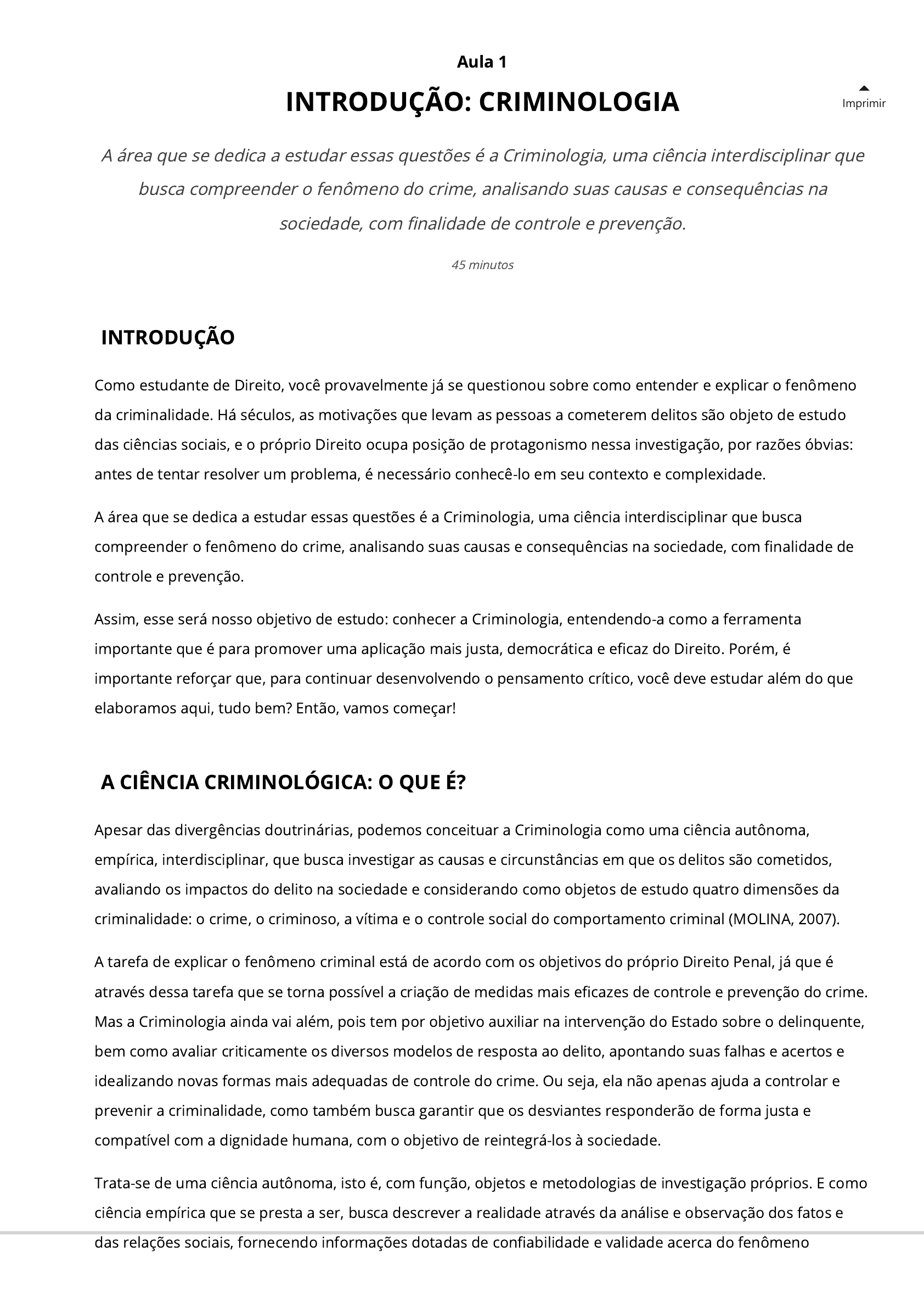 27/09/2022 19:29 ldd_wl_221_u1_fun_crim https://colaboraread.com.br/integracaoAlgetec/index?usuarioEmail=geilmaarmil2019%40gmail.com&usuarioNome=GEILMA+AZEVEDO+DA+SILVA&disciplinaDescricao=FUNDAMENTOS+DA+CRIMINOLOGIA&ati… 1/38 Imprimir INTRODUÇÃO Como estudante de Direito, você provavelmente já se questionou sobre como entender e explicar o fenômeno da criminalidade. Há séculos, as motivações que levam as pessoas a cometerem delitos são objeto de estudo das ciências sociais, e o próprio Direito ocupa posição de protagonismo nessa investigação, por razões óbvias: antes de tentar resolver um problema, é necessário conhecê-lo em seu contexto e complexidade. A área que se dedica a estudar essas questões é a Criminologia, uma ciência interdisciplinar que busca compreender o fenômeno do crime, analisando suas causas e consequências na sociedade, com �nalidade de controle e prevenção. Assim, esse será nosso objetivo de estudo: conhecer a Criminologia, entendendo-a como a ferramenta importante que é para promover uma aplicação mais justa, democrática e e�caz do Direito. Porém, é importante reforçar que, para continuar desenvolvendo o pensamento crítico, você deve estudar além do que elaboramos aqui, tudo bem? Então, vamos começar! A CIÊNCIA CRIMINOLÓGICA: O QUE É? Apesar das divergências doutrinárias, podemos conceituar a Criminologia como uma ciência autônoma, empírica, interdisciplinar, que busca investigar as causas e circunstâncias em que os delitos são cometidos, avaliando os impactos do delito na sociedade e considerando como objetos de estudo quatro dimensões da criminalidade: o crime, o criminoso, a vítima e o controle social do comportamento criminal (MOLINA, 2007). A tarefa de explicar o fenômeno criminal está de acordo com os objetivos do próprio Direito Penal, já que é através dessa tarefa que se torna possível a criação de medidas mais e�cazes de controle e prevenção do crime. Mas a Criminologia ainda vai além, pois tem por objetivo auxiliar na intervenção do Estado sobre o delinquente, bem como avaliar criticamente os diversos modelos de resposta ao delito, apontando suas falhas e acertos e idealizando novas formas mais adequadas de controle do crime. Ou seja, ela não apenas ajuda a controlar e prevenir a criminalidade, como também busca garantir que os desviantes responderão de forma justa e compatível com a dignidade humana, com o objetivo de reintegrá-los à sociedade. Trata-se de uma ciência autônoma, isto é, com função, objetos e metodologias de investigação próprios. E como ciência empírica que se presta a ser, busca descrever a realidade através da análise e observação dos fatos e das relações sociais, fornecendo informações dotadas de con�abilidade e validade acerca do fenômeno Aula 1 INTRODUÇÃO: CRIMINOLOGIA A área que se dedica a estudar essas questões é a Criminologia, uma ciência interdisciplinar que busca compreender o fenômeno do crime, analisando suas causas e consequências na sociedade, com �nalidade de controle e prevenção. 45 minutos 27/09/2022 19:29 ldd_wl_221_u1_fun_crim https://colaboraread.com.br/integracaoAlgetec/index?usuarioEmail=geilmaarmil2019%40gmail.com&usuarioNome=GEILMA+AZEVEDO+DA+SILVA&disciplinaDescricao=FUNDAMENTOS+DA+CRIMINOLOGIA&ati… 2/38 criminal. No entanto, é importante levar em consideração que a Criminologia não é uma ciência exata, mas sim social, e emprega metodologias próprias de seu campo de estudo. Apesar das divergências doutrinárias, podemos conceituar a Criminologia como uma ciência autônoma, empírica, interdisciplinar, que busca investigar as causas e circunstâncias em que os delitos são cometidos, avaliando os impactos do delito na sociedade e considerando como objetos de estudo quatro dimensões da criminalidade: o crime, o criminoso, a vítima e o controle social do comportamento criminal (MOLINA, 2007). A tarefa de explicar o fenômeno criminal está de acordo com os objetivos do próprio Direito Penal, já que é através dessa tarefa que se torna possível a criação de medidas mais e�cazes de controle e prevenção do crime. Mas a Criminologia ainda vai além, pois tem por objetivo auxiliar na intervenção do Estado sobre o delinquente, bem como avaliar criticamente os diversos modelos de resposta ao delito, apontando suas falhas e acertos e idealizando novas formas mais adequadas de controle do crime. Ou seja, ela não apenas ajuda a controlar e prevenir a criminalidade, como também busca garantir que os desviantes responderão de forma justa e compatível com a dignidade humana, com o objetivo de reintegrá-los à sociedade. Trata-se de uma ciência autônoma, isto é, com função, objetos e metodologias de investigação próprios. E como ciência empírica que se presta a ser, busca descrever a realidade através da análise e observação dos fatos e das relações sociais, fornecendo informações dotadas de con�abilidade e validade acerca do fenômeno criminal. No entanto, é importante levar em consideração que a Criminologia não é uma ciência exata, mas sim social, e emprega metodologias próprias de seu campo de estudo. Nesse sentido, a investigação criminológica pode se utilizar de diversos métodos de investigação cientí�ca. A principal metodologia que emprega, no entanto, é a indutiva: parte da observação de casos particulares reais para induzir compreensão sobre fenômeno criminal em um contexto macrossociológico (PENTEADO FILHO, 2002). A Criminologia, ainda, é interdisciplinar porque não se restringe ao Direito, mas possibilita, de forma coordenada e integrada, a formação de um diálogo entre diversas outras ciências, tais como a Medicina, a Psicologia, a Sociologia e a História, de forma a reunir os conhecimentos necessários para compreender as complexidades que se apresentam em todas as dimensões do fenômeno criminal. Essas disciplinas se combinam