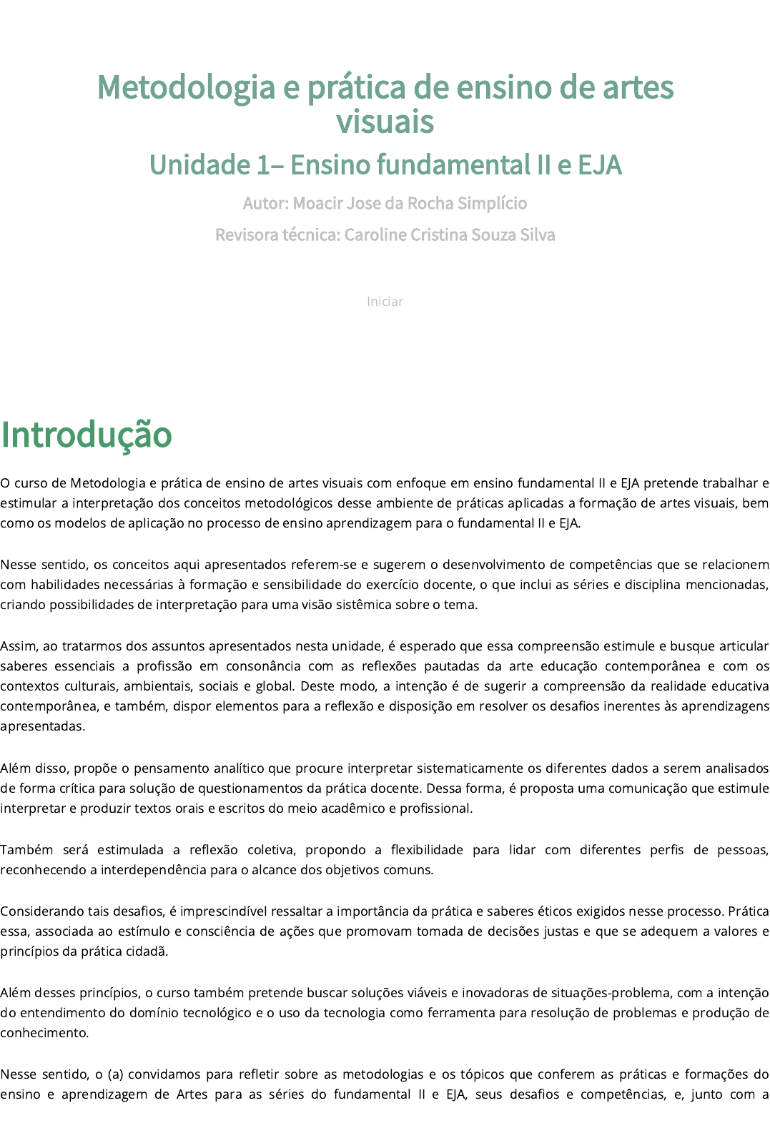 Metodologia e prática de ensino de artes visuais Unidade 1– Ensino fundamental II e EJA Autor: Moacir Jose da Rocha Simplício Revisora técnica: Caroline Cristina Souza Silva Iniciar Introdução O curso de Metodologia e prática de ensino de artes visuais com enfoque em ensino fundamental II e EJA pretende trabalhar e estimular a interpretação dos conceitos metodológicos desse ambiente de práticas aplicadas a formação de artes visuais, bem como os modelos de aplicação no processo de ensino aprendizagem para o fundamental II e EJA. Nesse sentido, os conceitos aqui apresentados referem-se e sugerem o desenvolvimento de competências que se relacionem com habilidades necessárias à formação e sensibilidade do exercício docente, o que inclui as séries e disciplina mencionadas, criando possibilidades de interpretação para uma visão sistêmica sobre o tema. Assim, ao tratarmos dos assuntos apresentados nesta unidade, é esperado que essa compreensão estimule e busque articular saberes essenciais a pro�ssão em consonância com as re�exões pautadas da arte educação contemporânea e com os contextos culturais, ambientais, sociais e global. Deste modo, a intenção é de sugerir a compreensão da realidade educativa contemporânea, e também, dispor elementos para a re�exão e disposição em resolver os desa�os inerentes às aprendizagens apresentadas. Além disso, propõe o pensamento analítico que procure interpretar sistematicamente os diferentes dados a serem analisados de forma crítica para solução de questionamentos da prática docente. Dessa forma, é proposta uma comunicação que estimule interpretar e produzir textos orais e escritos do meio acadêmico e pro�ssional. Também será estimulada a re�exão coletiva, propondo a �exibilidade para lidar com diferentes per�s de pessoas, reconhecendo a interdependência para o alcance dos objetivos comuns. Considerando tais desa�os, é imprescindível ressaltar a importância da prática e saberes éticos exigidos nesse processo. Prática essa, associada ao estímulo e consciência de ações que promovam tomada de decisões justas e que se adequem a valores e princípios da prática cidadã. Além desses princípios, o curso também pretende buscar soluções viáveis e inovadoras de situações-problema, com a intenção do entendimento do domínio tecnológico e o uso da tecnologia como ferramenta para resolução de problemas e produção de conhecimento. Nesse sentido, o (a) convidamos para re�etir sobre as metodologias e os tópicos que conferem as práticas e formações do ensino e aprendizagem de Artes para as séries do fundamental II e EJA, seus desa�os e competências, e, junto com a 1. Materiais de ações educativas de equipamentos culturais A experiência com imagens do universo da arte na vida contemporânea é um fenômeno cada vez mais presente e surpreendente. Se estabelece e se impõe de diferentes formas, situações e contextos (na moda, no design, no cinema, em outdoors, na propaganda, em produções artísticas, etc), desde objetos criados com enfoque utilitário à produções mais contemplativas. Figura 1 - Arte educação Fonte: ARTEREF, 2020. Provavelmente, você já se deparou com a reprodução de alguma pintura famosa estampada em uma camiseta, esculturas expostas em ambientes internos ou no espaço urbano, ou outras produções de imagens com linguagem tridimensional. Talvez as perguntas mais urgentes desse contato com as imagens sejam: Nos damos conta das muitas imagens as quais temos contato? Será que nos permitimos ser ou até que ponto somos afetados pelas imagens que se apresentam de diversas maneiras em nosso cotidiano? Quando e como podemos re�etir e conversar sobre experiências com imagens? Com quais elementos? Com quem? O que a produção em arte nos faz re�etir sobre a pro�ssão e o contato com a arte e as culturas visuais? Podemos observar em materiais educativos, por exemplo, algumas respostas a estas perguntas, pois normalmente essa produção trata de diferentes argumentos em contato com a arte, a �m de proporcionar uma determinada experiência, seja lúdica, questionadora, que estimule a criação etc. Embora não seja uma exclusividade dos espaços culturais e de ações educativas, lugares como museus e instituições culturais possuem uma boa produção de materiais com essa característica. São materiais elaborados por pro�ssionais com formação em arte e educação, na maioria das vezes, que buscam propor re�exões e aproximações com a arte e a educação pela imagem por meio dessa ferramenta de mediação. Você quer ver compreensão teórica, perceber o próprio fazer artístico e docente, por meio dos conhecimentos adquiridos acerca da práxis e dos processos de criação. Para isso, é importante o estímulo da produção de documentação pedagógica referente aos objetivos do ensino aprendizagem, a elaboração de materiais mediadores do diálogo e aprendizagem do ensino de artes e, especialmente, a percepção e compreensão da importância do professor pesquisador no âmbito do ensino aprendizagem e pessoal, assim como o diálogo do Artista-etc. (artista professor) para os diferentes olhares e prática do ensino da arte. Bons estudos! Aqui há uma compilação de DVds que organiza informações sobre materiais educativos compostos de documentários. Disponível em: http://www.artenaescola.org.br/dvdteca/ . Acesso 17/02/2020. Os materiais educativos podem ser muito versáteis e serem produzidos com conteúdo em formato digital ou impresso, com características mais formais ou como já apontamos, mais lúdicas, e são, geralmente, realizados pelos núcleos educativos dessas instituições ou empresas que trabalham com essa especialidade, com enfoque em uma exposição vigente. Seja em torno de seus objetos e coleções, ou ainda sobre assuntos que evoquem conhecimentos da cultura material e imaterial, bem como outros co