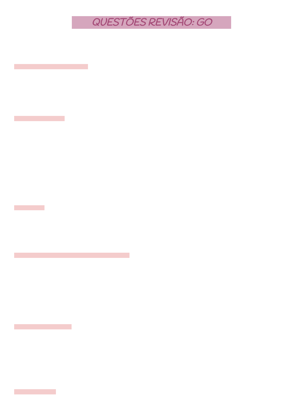 Anah Zanetti ------QUESTÕES REVISÃO: GO------ 1. Mulher de 35 anos foi submetida a uma colposcopia cujos achados foram: JEC completamente visível, epitélio acetobranco denso e mosaico grosseiro das 3h às 9h, com vasos atípicos e pequena área de necrose nesta região. Os achados colposcópicos são sugestivos de: A- Atrofia genital. B- Lesão intraepitelial escamosa de baixo grau. C- Lesão intraepitelial escamosa de alto grau. D- Carcinoma invasor do colo uterino. E- Ectopia. Responder 2. Mulher de 30 anos, nuligesta, tentando engravidar há 6 meses. Assintomática, nega o uso de medicações ou doenças crônicas. Traz os seguintes exames: TSH: 2,55 µUI/mL e anticorpos antitireoperoxidase aumentados. Considerando essa situação hipotética, qual a melhor conduta, além de prescrever ácido fólico? A- Manter conduta expectante. B- Prescrever levotiroxina. C- Iniciar investigação de infertilidade. D- Monitorar TSH. E- Solicitar ultrassonografia de tireoide. 3. Em relação ao DIU hormonal, quando comparado ao DIU de cobre, considere as assertivas abaixo: I. Diminui a incidência de anemia. II. Diminui a dismenorreia. III. Diminui a libido pela inibição gonadal. Quais estão corretas? A- Apenas I. B- Apenas II. C- Apenas III. D- Apenas I e II. E- I, II e III. 4. Paciente com 26 anos de idade, G2, P1, chegou maternidade em trabalho de parto que evoluiu para parto normal. Deseja usar DIU T de cobre como anticoncepção. Refere ter tido doença inflamatória pélvica aos 24 anos. Nesse caso, o DIU de cobre A- está contraindicado. B- deverá ser inserido nas primeiras 48 horas após o parto. C- pode ser inserido três meses após o parto. D- a inserção poderá ser feita até a primeira semana do pós-parto. E- deverá aguardar o término da amamentação para inserção. 5. Mulher, 32 anos de idade, gesta 2 para 2, com laudo histopatológico de biópsia revelando adenocarcinoma in situ. O exame colposcópico identificou zona de transformação tipo 2 e ausência de lesões visíveis. A conduta é A- ultrassonografia transvaginal. B- histeroscopia com biópsia. C- biópsia cervical nos quatro quadrantes. D- Conização laminado a frio. E- histerectomia total. 6. Mulher, 23 anos, queixa-se de corrimento vaginal branco com leve ardência vulvar e aumento da quantidade no pré-menstrual. Ao exame ginecológico observou-se conteúdo vaginal branco, fluido, não aderente. Bacterioscopia evidenciou lactobacilos ++++/4, núcleos isolados e ausência de leucócitos. O teste das aminas foi negativo e o pH vaginal é 4,0.O diagnóstico provável é A- candidíase não albicans. B- vaginose bacteriana. C- tricomoníase. D- vaginose citolítica. E- vaginite descamativa. Anah Zanetti Responder 7. Jovem de 22 anos, sexualmente ativa, contracepção com coito interrompido. Não usa condom. É atleta. Refere “corrimento vaginal” e disúria discreta. O exame ao espéculo revelou conteúdo esverdeado no canal vaginal. A bacterioscopia pelo gram identificou polimorfonucleares ++++/4, células maduras, flora tipo 1 e diplococos gram-negativos. O agente etiológico e a conduta, de acordo com CDC 2021, são A- Herpes genital / aciclovir 400 mg de 8/8 h por 7-10 dias. B- Trichomonas vaginalis / metronidazol 2 g dose única. C- Chlamydia trachomatis / azitromicina 1 g dose única. D- Neisseria gonorrhoeae / ceftriaxone 500 mg IM dose única. E- Vaginite descamativa; clindamicina 300 mg 2x/dia por 7 dias. 8. Adolescente de 12 anos, transplantada de medula óssea por leucemia. Tomou a 1ª dose da vacina contra o HPV há 1 mês. Vai fazer intercâmbio internacional em 5 meses e retorna em 1 ano. De acordo com o calendário nacional de vacinação do Ministério da Saúde, essa jovem deve ser orientada a A- tomar a 2ª dose em 1 mês e a 3ª quando retornar. B- tomar a 2ª dose em 5 meses e a 3ª quando retornar. C- tomar a 2ª dose em 5 meses e não há necessidade da 3ª. D- tomar a 2ª dose de imediato e adiantar a 3ª dose em 4 meses. E- deixar para tomar as doses restantes quando retornar. Responder 9. Gestante com 10 semanas de gestação pela data de última menstruação, sem sintomas gravídicos, quis realizar ultrassonografia porque estava preocupada com sua gravidez. O exame físico identificou útero menor do que o esperado para a idade gestacional e o colo estava fechado. O exame de imagem revelou: embrião com comprimento crânio-nádegas 8 mm e sem atividade cardíaca. O diagnóstico e conduta são A- gravidez está normal e solicitar nova ultrassonografia em 1 semana. B- aborto retido e sugerir aguardar evolução espontânea. C- aborto incompleto e indicar uso de misoprostol imediato. D- ameaça de abortamento e iniciar progesterona. E- abortamento completo e realizar aspiração manual intrauterina. 10. O quarto período clínico do trabalho de parto se caracteriza por A- miotamponagem. B- dequitação. C- expulsão. D- descida. E- descolamento. 11. A Hipertensão Crônica é observada antes da gravidez, ou antes de 20 semanas de gestação, ou diagnosticada pela primeira vez durante a gravidez e não se resolve até: A- 3 semanas após o parto. B- 5 semanas após o parto. C- 8 semanas após o parto. D- 10 semanas após o parto. E- 12 semanas após o parto. 12. São indicações maternas para o parto na pré-eclâmpsia, exceto: A- Cefaleia grave e distúrbios visuais persistentes. B- Dor epigástrica grave persistente, náuseas ou vômitos. C- Oligo-hidrâmnio (Índice de líquido amniótico <p 10 para a idade gestacional). D- Trabalho de parto ou sangramento. E- Aumento persistente da pressão arterial até níveis de gravidade. Anah Zanetti 13. Em relação ao ciclo menstrual normal, dentre as afirmações abaixo, assinale a alternativa incorreta. A- A regularidade consiste na diferença inferior a 9 dias entre o ciclo mais longo e o ciclo mais curto B- O volume de sangramento é de caráter subjetivo podendo ser classificado em volumoso, normal ou discreto C- O intervalo é o per