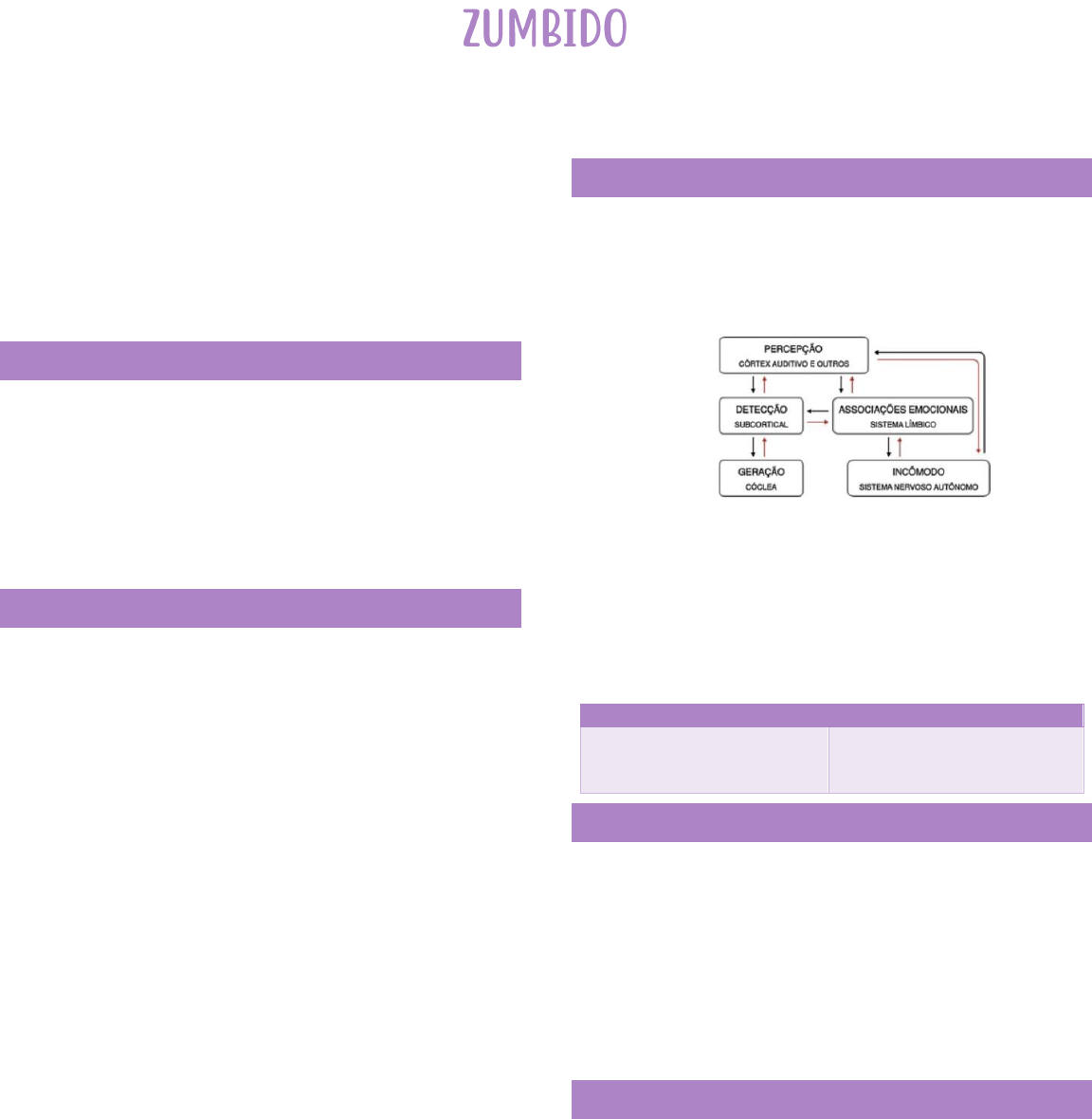 Otorrino -> 06/09/2022 • Sintoma • Percepção do som sem fonte externa • Itard 1821: primeira referência • Mais de 300 causas: sempre investigar • Pode afetar na qualidade de vida o Distúrbios do sono o Deficit de concentração o Desequilíbrio emocional • Maioria é intermitente e não apresenta incômodo • 93% têm disacusia EPIDEMIOLOGIA • EUA 6-17% o 15% desses sofrem pelo Z • São Paulo: prevalência de 17% • 1-2% dos suecos: prejuízo em qualidade de vida • Incidência o Mulheres jovens o Homens idosos ETIOPATOGENIA • Sistema auditivo o Presbiacusia o Pair o Ototóxicos • Metabólicas o DM o Colesterol o Tireoide o Cafeína • Cardiovascular o Circulação o Coluna cervical o HAS o Anemia o Insuficiência coronária • Neurológicas o TCE o Whiplash (carro) o Esclerose múltipla • Farmacológicas o Antinflamatórios o Antibióticos o Antineoplásicos • Odontológicas o Disfunção de ATM o Distúrbios de mastigação • Psicológicas o Ansiedade o Depressão o Fobias • Disfunção de CCI (células ciliadas internas) o Endorfinas liberadas por estresse potencializam ação do Glucamato na cóclea o Estresse, suprimento vascular deficitário e/ou trauma acústico -> CCI -> glutamato -> citotoxicidade e hiperexcitabilidade MECANISMO DE GERAÇÃO DO ZUMBIDO • Recrutamento trigeminal • Recrutamento límbico o Graves preservados, com zumbido intenso, inclusive de dia é muito sugestivo de recrutamento límbico o Modelo neurofisiológico de Jastreboff o Zumbido não incomoda mais -> plasticidade • Desproporção CCI/CCE -> perda auditiva audiometricamente detectável se lesão >30% o Células ciliadas internas/externas o CCE são mais sensíveis ▪ Células da base (CCE) são mais sensíveis que as do ápice (CCI) da cóclea o CCE tem mais ação inibitória sobre as CCI Lesão proporcional Lesão não proporcional Disacusia sem zumbido Perda da inibição das CCE sobre as CCI - > liberação de glutamato -> hiperexcitabilidade das CCI -> zumbido TIPOS DE ZUMBIDO • Abelha • Cigarra • Mosquito • Panela de pressão • Grilo • Cachoeira • Borboleta • Pulsação TRATAMENTO • Sintoma, não doença! • Sempre que possível envolver a etiologia -> reverter a doença de base • Considerar o paciente individualmente • Geral o Medidas gerias devem ser enfatizadas ▪ Exposição a ruídos ▪ Abuso de carboidratos ▪ Dieta equilibrada ▪ Evitar cafeína o Evitar receitas prontas -> várias causas, várias receitas o Boa relação médico-paciente -> confiança mútua • Tripé o Tratamento medicamentoso -> muitos agem, mas nenhum específico ▪ Complexos vitamínicos ▪ Antiagregante e moduladores de fluxo ▪ Vasodilatadores diretos ▪ Bloqueadores de canais de cálcio ▪ Estabilizadores de membrana ▪ Anticonvulsivantes ▪ Ansiolíticos ▪ Antidepressivos o AASI (aparelho de amplificação sonora individual) -> audição cai, percepção do zumbido aumenta e vice-versa o TRT (tinnitus retraining therapy) -> usa a plasticidade do sistema a seu favor ▪ Taxa de melhora: 82%