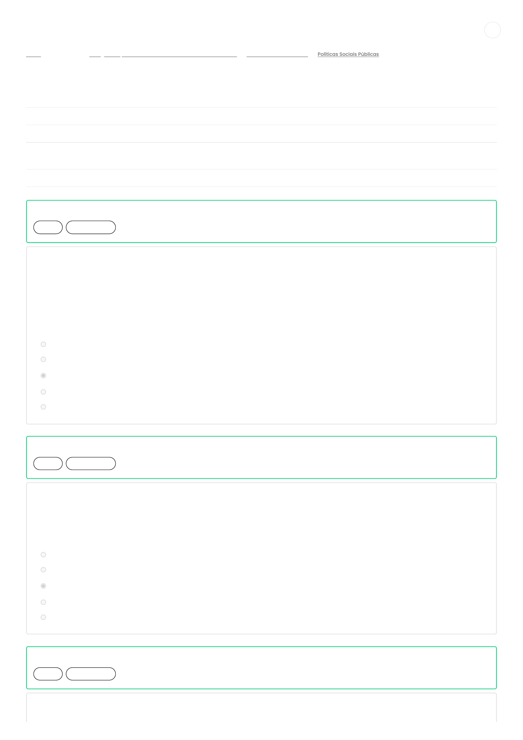 31/10/22, 10:45 Políticas Sociais Públicas: Revisão da tentativa https://ava.faculdadefocus.edu.br/mod/quiz/review.php?attempt=114944&cmid=4926 1/4 - Meus cursos - - - Painel Pós-graduação em Direitos Humanos e Movimentos Sociais Políticas Sociais Públicas Políticas Sociais Públicas Iniciado em segunda, 31 out 2022, 10:29 Estado Finalizada Concluída em segunda, 31 out 2022, 10:45 Tempo empregado 16 minutos 3 segundos Avaliar 10,0 de um máximo de 10,0(100%) Questão 1 Correto Atingiu 1,0 de 1,0 O Serviço Social é uma profissão da área das ciências sociais aplicadas que forma profissionais capacitados para intervir na sociedade brasileira, na perspectiva da efetivação de direitos e com vistas ao fortalecimento da organização popular. A primeira escola de Serviço Social foi fundada na cidade de São Paulo no ano de 1936. A atuação atual se difere muito da atuação desenvolvida no início da profissão, visto que nos primórdios de seu surgimento, a atuação profissional tinha bases e diretrizes ________________. Assinale a alternativa que preenche adequadamente a lacuna. a. inéditas b. emancipatórias c. conservadoras d. avançadas e. inovadoras Questão 2 Correto Atingiu 1,0 de 1,0 Os instrumentos avaliativos voltados ao entendimento da realidade social devem possibilitar a construção de parâmetros que possam demonstrar o nível de eficácia e efetividade dos objetivos, da intenção, do desempenho e em relação ao alcance dos objetivos traçados pela política avaliada. Assinale a afirmativa que apresenta o objetivo central dos instrumentos avaliativos. a. Apreender os níveis de complexidade e analisar as estruturas. b. Examinar os efeitos e analisar a estrutura. c. Identificar os efeitos e as implicações das políticas sociais na realidade. d. Analisar o social em sua complexidade total. e. Examinar e analisar todas as partes, em relação a sua conformação e estrutura. Questão 3 Correto Atingiu 1,0 de 1,0 A ____________________ é um processo educacional que tem sido construído por assistentes sociais no cotidiano de atuação nos mecanismos institucionais e fora deles Também se aplica nos diálogos realizados https://ava.faculdadefocus.edu.br/my/ https://ava.faculdadefocus.edu.br/course/view.php?id=78 https://ava.faculdadefocus.edu.br/course/view.php?id=78§ion=13 https://ava.faculdadefocus.edu.br/mod/quiz/view.php?id=4926 31/10/22, 10:45 Políticas Sociais Públicas: Revisão da tentativa https://ava.faculdadefocus.edu.br/mod/quiz/review.php?attempt=114944&cmid=4926 2/4 cotidiano de atuação, nos mecanismos institucionais e fora deles. Também se aplica nos diálogos realizados em atendimentos individuais e nas intervenções realizadas junto a coletivos. Desse modo, a dimensão educativa tem se demonstrado efetiva frente ao desenvolvimento de sujeitos e de coletivos em relação ao exercício da cidadania, da política e da organização popular. a. Educação Formal b. Educação Internacional c. Política Nacional de Serviço Social d. Educação Popular e. Assistência social Questão 4 Correto Atingiu 1,0 de 1,0 O SUAS é um sistema complexo e muito moderno quanto à sua gestão e operacionalização. O planejamento e a institucionalização preveem a articulação de saberes e experiências diversos, do planejamento à avaliação; além disso, contempla a cooperação entre distintos setores e a participação de diferentes atores sociais. Quais são os níveis em que se materializa a gestão do SUAS? a. Básico, bifásico e instrumental. b. Concorrencial, avançado e pleno. c. Instrumental, avançado e concorrencial. d. Inicial, básico e pleno. e. Básico, pleno e avançado. Questão 5 Correto Atingiu 1,0 de 1,0 Assim como ocorre em várias partes do globo, o Brasil constituiu um Estado voltado a garantir que os objetivos neoliberais sejam efetivados, independente dos conflitos de classe. Para tal, as elites políticas e econômicas têm feito uso deste espaço para determinar o tipo de estrutura Estatal e os encaminhamentos gerados para a nação. Uma das bases que alicerçam essas estratégias de perpetuação de poder é a manutenção da desigualdade social, pois o nível de fortalecimento da economia está diretamente relacionado aos níveis de exploração dos trabalhadores e do meio ambiente, e esse processo cria diferentes tipos de injustiça social. Assinale a afirmativa que apresenta as fases do desenvolvimento capitalista vivenciados dos primórdios a atualidade. a. Comercial, primitivo e imperial. b. Monopolista, industrial e concorrencial. c. Concorrencial, monopolista e imperial. d. Primitivo, avançado e concorrencial. e. Primitivo, concorrencial e comercial. Questão 6 Correto Atingiu 1,0 de 1,0 Diferentemente do que ocorreu em outros países, no Brasil não houve uma real implantação de um Estado de bem-estar social, o que se confirma pelo fato de que a cidadania implantada na realidade brasileira não é 31/10/22, 10:45 Políticas Sociais Públicas: Revisão da tentativa https://ava.faculdadefocus.edu.br/mod/quiz/review.php?attempt=114944&cmid=4926 3/4 completa. Identifique a afirmativa que apresenta corretamente os tipos de cidadania existentes no Brasil. a. Cidadania expandida, cidadania residual, cidadania plena e cidadania regulada. b. Cidadania plena, cidadania avançada, cidadania total e cidadania parcial. c. Cidadania regulada, cidadania cooptada, cidadania residual e cidadania fragmentada. d. Cidadania tecnológica, cidadania avançada, cidadania plena e cidadania totalitária. e. Cidadania mista, cidadania plena, cidadania corretiva e cidadania parcial. Questão 7 Correto Atingiu 1,0 de 1,0 As políticas afirmativas surgiram nos Estados Unidos e em pouco tempo também foram implantadas em países da Europa. Na Europa, as primeiras ações nessa direção foram elaboradas em 1976 com o nome de ação positiva. Em 1982, a discriminação positiva foi inserida no primeiro Programa de Ação para a Igualdade de