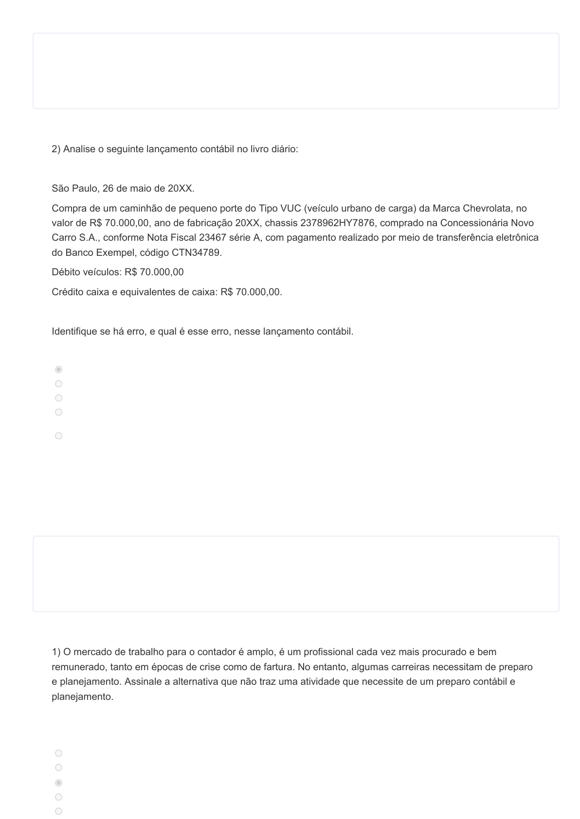 31/10/2022 14:03 Avaliação: Revisão da tentativa https://cpetead.com.br/mod/quiz/review.php?attempt=3112937&cmid=45415 1/5 QUESTÃO Correto Atingiu 1,0 de 1,0 QUESTÃO Correto Atingiu 1,0 de 1,0 1 2) Analise o seguinte lançamento contábil no livro diário: São Paulo, 26 de maio de 20XX. Compra de um caminhão de pequeno porte do Tipo VUC (veículo urbano de carga) da Marca Chevrolata, no valor de R$ 70.000,00, ano de fabricação 20XX, chassis 2378962HY7876, comprado na Concessionária Novo Carro S.A., conforme Nota Fiscal 23467 série A, com pagamento realizado por meio de transferência eletrônica do Banco Exempel, código CTN34789. Débito veículos: R$ 70.000,00 Crédito caixa e equivalentes de caixa: R$ 70.000,00. Identifique se há erro, e qual é esse erro, nesse lançamento contábil. Escolha uma opção: a. Não há erro de nenhum tipo nesse lançamento contábil, respeitando as exigências do Método das Partidas Dobradas. b. Não há histórico, portanto, o lançamento não respeita as definições do Método das Partidas Dobradas. c. Há excesso de informações no histórico, que deve ser o mais sucinto possível. d. A soma dos débitos não é superior aos valores do crédito, portanto, o lançamento não respeita as definições do Método das Partidas Dobradas. e. A soma dos débitos não é o dobro da soma dos créditos, portanto, o lançamento não respeita as definições do Método das Partidas Dobradas. Sua resposta está correta. A resposta correta é: Não há erro de nenhum tipo nesse lançamento contábil, respeitando as exigências do Método das Partidas Dobradas. 2 1) O mercado de trabalho para o contador é amplo, é um profissional cada vez mais procurado e bem remunerado, tanto em épocas de crise como de fartura. No entanto, algumas carreiras necessitam de preparo e planejamento. Assinale a alternativa que não traz uma atividade que necessite de um preparo contábil e planejamento. Escolha uma opção: a. Auditor externo e independente. b. Contador público. c. Analista de mercados de capitais. d. Perito contábil. e. Contador de custos, atuando em empresas privadas. 31/10/2022 14:03 Avaliação: Revisão da tentativa https://cpetead.com.br/mod/quiz/review.php?attempt=3112937&cmid=45415 2/5 QUESTÃO Correto Atingiu 1,0 de 1,0 QUESTÃO Correto Atingiu 1,0 de 1,0 QUESTÃO Incorreto Atingiu 0,0 de 1,0 3 2) O que é necessário para que um gasto seja classificado como "despesa" em uma entidade, de acordo com as normas e os princípios contábeis? Escolha uma opção: a. É necessário que o gasto tenha o objetivo de gerar receitas para a entidade. b. É necessário que o gasto tenha aprovação da autoridade tributária da jurisdição da entidade. c. É necessário que o gasto tenha aprovação dos responsáveis pela empresa. d. É necessário que o gasto, em seu montante total, seja menor do que R$ 50.000,00. e. É necessário que a documentação inerente a esse gasto seja emitida com os dados corretos da entidade. Sua resposta está correta. A resposta correta é: É necessário que o gasto tenha o objetivo de gerar receitas para a entidade. 4 3) Muitas empresas tiveram dúvidas de como relatar as informações qualitativas em suas demonstrações contábeis. Assim, o CPC emitiu, em 2014, uma orientação específica: OCPC n.º 7, em que orientou os contadores a não seguirem o chamado espírito de checklist. Nessa orientação, uma característica teve ênfase. Qual é essa característica? Escolha uma opção: a. Compreensibilidade. b. Representação fidedigna. c. Continuidade. d. Relevância. e. Prudência. Sua resposta está correta. A resposta correta é: Relevância. 5 3) Sabemos que, após um fechamento de período contábil, as contas contábeis patrimoniais continuam a ter seus saldos intactos, mas as contas de resultado são zeradas. O que acontece, então? As contas de resultado são eliminadas? 31/10/2022 14:03 Avaliação: Revisão da tentativa https://cpetead.com.br/mod/quiz/review.php?attempt=3112937&cmid=45415 3/5 QUESTÃO Correto Atingiu 1,0 de 1,0 QUESTÃO Correto Atingiu 1,0 de 1,0 6 5) Uma determinada indústria metalúrgica tem a sua “planta industrial” (as instalações da fábrica) em um extenso terreno próximo ao mar. A localização dessa empresa sempre causou polêmicas com organizações não governamentais (ONGs) que se preocupam com o meio ambiente e temem um desastre ambiental. Os executivos da empresa dizem que é improvável que venha a acontecer um desastre ambiental porque a empresa adota rigorosos controles ambientais. Sabe-se que essas ONGs acompanham frequentemente as ações dessa metalúrgica. É possível dizer que as ONGs que se dedicam ao meio ambiente são usuárias da contabilidade e grupos de interesse? Escolha uma opção: a. Não. ONGs, de acordo com a lei, não podem ser consideradas usuárias da contabilidade, porém, podem ser grupos de interesse. b. Não, são considerados “investidores” apenas compradores de ações. c. Não é possível considerar as ONGs como grupos de interesse porque, na maioria dos casos, elas não têm fins lucrativos. d. Sim. As ONGs podem ser usuárias da contabilidade e um importante grupo de interesse. e. Não. Para um investidor ser considerado usuário da contabilidade, é necessário ter uma carteira de ações de diversas empresas, o que raramente acontece. Sua resposta está correta. A resposta correta é: Sim. As ONGs podem ser usuárias da contabilidade e um importante grupo de interesse. 7 5) Uma determinada loja de roupas esportivas comprou um sofisticado sistema de exposição das mercadorias com eixos rolantes, que permite ao cliente observar rapidamente várias opções de modelo de roupas pela vitrine. Esse bem custou para a loja R$ 25.000,00, sendo que parte desse valor foi pago à vista via transferência bancária e parte será paga diretamente ao fornecedor dentro de 90 dias. Qual é o lançamento contábil (considerando apenas as contas contá