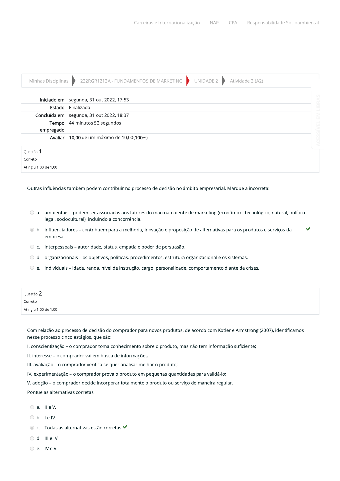 31/10/22, 18:38 Atividade 2 (A2): Revisão da tentativa https://ambienteacademico.com.br/mod/quiz/review.php?attempt=1273718&cmid=707125 1/5 Minhas Disciplinas 222RGR1212A - FUNDAMENTOS DE MARKETING UNIDADE 2 Atividade 2 (A2) Iniciado em segunda, 31 out 2022, 17:53 Estado Finalizada Concluída em segunda, 31 out 2022, 18:37 Tempo empregado 44 minutos 52 segundos Avaliar 10,00 de um máximo de 10,00(100%) Questão 1 Correto Atingiu 1,00 de 1,00 Questão 2 Correto Atingiu 1,00 de 1,00 Outras in�uências também podem contribuir no processo de decisão no âmbito empresarial. Marque a incorreta: a. ambientais – podem ser associadas aos fatores do macroambiente de marketing (econômico, tecnológico, natural, político- legal, sociocultural), incluindo a concorrência. b. in�uenciadores – contribuem para a melhoria, inovação e proposição de alternativas para os produtos e serviços da empresa. c. interpessoais – autoridade, status, empatia e poder de persuasão. d. organizacionais – os objetivos, políticas, procedimentos, estrutura organizacional e os sistemas. e. individuais – idade, renda, nível de instrução, cargo, personalidade, comportamento diante de crises. Com relação ao processo de decisão do comprador para novos produtos, de acordo com Kotler e Armstrong (2007), identi�camos nesse processo cinco estágios, que são: I. conscientização – o comprador toma conhecimento sobre o produto, mas não tem informação su�ciente; II. interesse – o comprador vai em busca de informações; III. avaliação – o comprador veri�ca se quer analisar melhor o produto; IV. experimentação – o comprador prova o produto em pequenas quantidades para validá-lo; V. adoção – o comprador decide incorporar totalmente o produto ou serviço de maneira regular. Pontue as alternativas corretas: a. II e V. b. I e IV. c. Todas as alternativas estão corretas. d. III e IV. e. IV e V. Carreiras e Internacionalização NAP CPA Responsabilidade Socioambiental https://ambienteacademico.com.br/my/ https://ambienteacademico.com.br/course/view.php?id=17684 https://ambienteacademico.com.br/course/view.php?id=17684§ion=4 https://ambienteacademico.com.br/mod/quiz/view.php?id=707125 https://informa.fmu.br/carreiras/ https://codely-fmu-content.s3.amazonaws.com/Moodle/NAP/inicial/nap/fmu/index.html https://codely-fmu-content.s3.amazonaws.com/Moodle/CPA/landing_CPA/index.html https://portal.fmu.br/sustentabilidade 31/10/22, 18:38 Atividade 2 (A2): Revisão da tentativa https://ambienteacademico.com.br/mod/quiz/review.php?attempt=1273718&cmid=707125 2/5 Questão 3 Correto Atingiu 1,00 de 1,00 Questão 4 Correto Atingiu 1,00 de 1,00 Sobre os fatores in�uenciadores do comportamento de consumo, qual das alternativas está incorreta: a. Antropológicos. b. Culturais. c. Pessoais. d. Sociais. e. Psicológicos. O processo de segmentação do mercado acontece em três etapas: segmentação, seleção do segmento e, por �m, posicionamento. Podemos dizer que a segmentação consiste na escolha do agrupamento de indivíduos que demandem produtos ou serviços entre si. Não basta reconhecer esses grupos e identi�cá-los, mas outros quesitos devem compor esse processo, como sugerem Ludovico e Santini (2013). Das possibilidades descritas neste questão, identi�que as que estão incorretas: I. mensurável – (com dados numéricos) o tamanho do mercado para possível atuação e todas a possibilidades que possam ser quanti�cadas; o mercado é rentável para a empresa; II. acessível – segmentos que sejam alcançados por meio de campanhas de comunicação que possam chegar até eles; precisão de acesso para que se torne rentável; III. substancial – devem ser signi�cativos em tamanho e lucratividade; IV. acionável – é a maneira pela qual a empresa atende ao que o segmento demanda; V. referenciável – respostas diferentes para segmentos diferentes, não é possível a utilização de ferramentas iguais para todos. a. II, III, IV. b. Todas são corretas. c. I, II, III. d. I, IV, V. e. III, IV, IV Carreiras e Internacionalização NAP CPA Responsabilidade Socioambiental https://informa.fmu.br/carreiras/ https://codely-fmu-content.s3.amazonaws.com/Moodle/NAP/inicial/nap/fmu/index.html https://codely-fmu-content.s3.amazonaws.com/Moodle/CPA/landing_CPA/index.html https://portal.fmu.br/sustentabilidade 31/10/22, 18:38 Atividade 2 (A2): Revisão da tentativa https://ambienteacademico.com.br/mod/quiz/review.php?attempt=1273718&cmid=707125 3/5 Questão 5 Correto Atingiu 1,00 de 1,00 Questão 6 Correto Atingiu 1,00 de 1,00 Para a realização da pesquisa de marketing necessita-se estar ciente de que se trata de um processo no qual as etapas devem estar de�nidas e claras para que o objetivo pretendido seja alcançado. De acordo com Malhotra (2012), são seis etapas, as quais não são isoladas, pois têm relação e in�uência entre si: de�nição do problema, desenvolvimento de uma abordagem, formulação da pesquisa, trabalho de campo ou coleta de dados, análise dos dados e relatório da pesquisa. Das de�nições descritas a seguir a que conceitua especialmente o “Desenvolvimento de uma abordagem” é: a. aqui reúnem-se todas as informações e dados coletados, tanto os secundários (a partir de fontes externas) quanto os apurados na pesquisa de campo, e apresentam-se esses resultados formalmente por meio de um documento escrito e exposto aos decisores da empresa. b. nesta etapa é feita a “garimpagem” dos dados orientados pelos objetivos traçados para a pesquisa, evidenciando aquilo que se busca em nível de resultados. c. nesta etapa de�ne-se a estrutura teórica e objetiva, bem como as metodologias de pesquisa que serão utilizadas, ou seja, determinação dos dados secundários a serem investigados, as pesquisas quantitativas ou qualitativas. d. a. pode-se chamar também de pesquisa de campo, aqui é o momento que se vai em busca dos dados e das informações, p