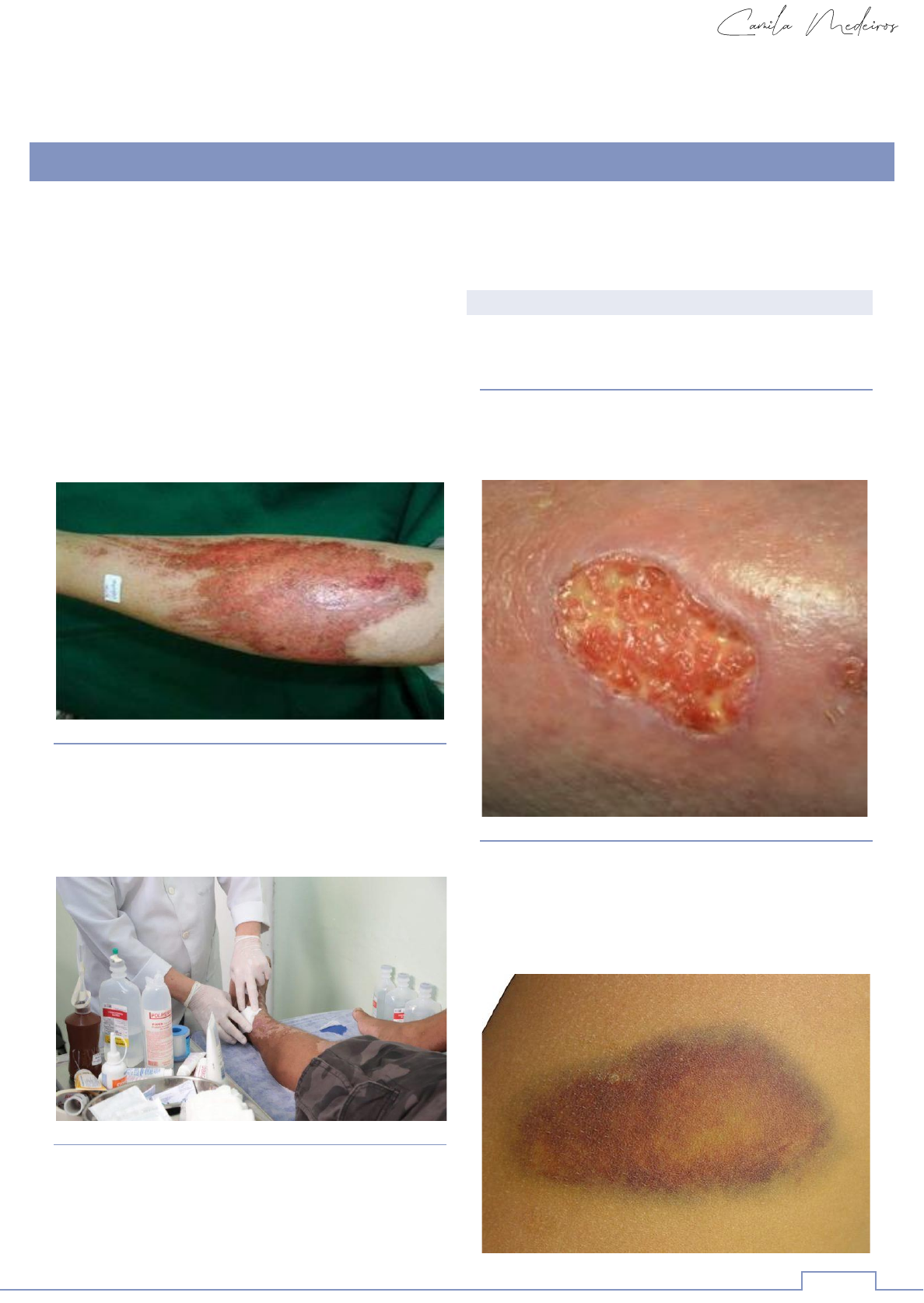 11 As lesões podem variar entre pequenas escoriações sem maiores gravidades e lesões que podem ameaçar a vida do traumatizado. A ameaça mais imediata para a vida da vítima com lesões resulta, geralmente, de perdas sanguíneas; Assim, durante o atendimento, a identificação das lesões que causam hemorragias importantes e o controle destas são prioritários; Portanto o tratamento é direcionado para controlar sangramentos e prevenir, contaminações/infecções LIMPEZA A limpeza faz-se mediante a utilização de soro fisiológico com o qual se lava abundantemente a ferida de modo a remover o máximo de sujidade possível. DESINFECÇÃO A desinfecção é conseguida pela aplicação de um desinfetante dos quais o mais comum é a iodopovidona. A Iodopovidona combate grande parte dos microrganismos, desempenhando ação germicida e esporicida sobre bactérias, fungos e protozoários. TIPOS DE FERIMENTOS Um trauma pode apresentar dois tipos de ferida. LESÕES ABERTAS Onde a superfície da pele ou mucosa é rompida. LESÕES FECHADAS Não ocorre abertura da pele ou mucosas, resulta de pancada, força ou esforço causado pelo trauma (queda ou agressão) podendo ocorrer até hemorragias externas. avaliação das lesões e condições das vitimas AULA 3 – PRIMEIROS SOCORROS lesões 12 AÇÃO E LIMITES DO SOCORRISTA Equimoses: lesão de pequenos vasos da pele que não causam grande acumulação de sangue nos tecidos, habitualmente designadas por nódoas negras. Hematomas: quando há lesão de vasos sanguíneos de maior calibre com acumulação de quantidades de sangue que podem ser significativas. Conduta: na presença de hematomas ou equimoses deve-se fazer aplicações frias sobre o local, para diminuir o edema, a hemorragia e a dor. Os hematomas encontram-se muitas vezes associados a fraturas. ESCORIAÇÕES As escoriações são lesões simples, que ocorrem na camada mais superficial da pele, por exemplo uma perna ralada em uma criança, sem perda ou destruição do tecido. No geral, o sangramento é pequeno, porém podem ser muito dolorosas porque as terminações nervosas ficam expostas. Cuidados: lavar a região afetada com água corrente e sabão neutro. Nessa etapa, é importante retirar qualquer resquício de grama, terra, asfalto ou outro corpo estranho que possa ter ficado no ferimento. Sinais que podem indicar infecção: aumento da temperatura da pele ao redor da lesão e vermelhidão. QUEIMADURAS Lesão provocada pelo contato direto da pele com uma fonte quente ou fria. Ela também pode acontecer por produtos químicos, radiação, animais ou plantas e corrente elétrica. QUEIMADURAS DE 1º GRAU – ÁREA SUPERFICIAL Coloque a área debaixo da água fria por, no mínimo, 15 minutos; Mantenha um pano limpo, frio e úmido durante 24h; Jamais aplique óleo ou manteiga; Se possível, passe pomada específica para essa lesão. 13 QUEIMADURAS DE 2º GRAU – CAMADA INTERMEDIÁRIA Coloque a área debaixo da água fria por, no mínimo, 15 minutos; Com muito cuidado, lave-a com água fria e sabão neutro, sem esfregar; Cubra-a com uma gaze molhada ou com bastante vaselina; Jamais fure as bolhas, isso aumenta o risco de infecção; Em caso de bolhas grandes, procure ajuda imediata. QUEIMADURAS DE 3º GRAU – GRAVE, QUE GERA RISCO DE VIDA E DEIXA CICATRIZES Chame o socorro imediatamente; Submeta a região ao soro fisiológico ou água por 10 minutos; Coloque, muito cuidadosamente, uma gaze esterilizada umedecida em soro fisiológico ou um pano limpo; Caso a região seja muito grande, enrole um lençol limpo umedecido em soro fisiológico e que não solte pelos até a ajuda chegar; Em hipótese nenhuma passe algum outro produto. FERIMENTOS CORTANTES A primeira coisa que deve ser feita é uma análise concreta da situação. Para isso, é preciso se atentar para o tipo de ferimento cortante. Corte superficial: onde há menos sangramento e a tendência é que o sangue estanque rapidamente. Aqui, apenas as partes mais superficiais da pele é que sofrem algum dano. Corte profundo: Já o corte profundo pode causar até hemorragia. Nesse caso, é necessário conter o sangramento com um pano limpo e macio, a fim de evitar que a perda de sangue cause ainda mais malefícios ao organismo do sujeito. Nesse tipo de situação o corte é muito mais intenso, atingindo camadas mais profundas da pele e o atendimento deve ocorrer o quanto antes. CUIDADOS COM FERIMENTOS DE CORTES SUPERFICIAIS Higienize a região afetada, usando sabão neutro e água corrente. Retirando qualquer resíduo de material (como vidro) que possa estar presente; Depois você deverá aplicar um antisséptico no local, secando em volta da ferida e aplicando um curativo limpo e macio, como uma gaze, sobre o ferimento; Por fim, procure trocar o curativo regularmente, mantendo o corte sempre limpo e seco, a fim de facilitar a cicatrização. CUIDADOS COM FERIMENTOS DE CORTES PROFUNDOS Use um pano limpo e seco para pressionar a ferida, a fim de diminuir a perda de sangue; Classificar o sangramento em arterial ou venoso; higienizar a ferida com água corrente e sabão neutro. Use também uma gaze para remover possíveis resíduos e partículas que se mantiveram dentro da ferida; Nunca remover o material do corte sozinho, pois poderá provocar uma nova hemorragia. CONTUSÃO São lesões provocadas por golpes ou pancadas, em que não há presença de ferimentos abertos, isto é, sem rompimento da pele. Porém, os vasos sanguíneos adjacentes ao local lesionado são rompidos, ocorrendo derramamento de sangue no tecido subcutâneo ou em camadas mais profundas. 14 Principais cuidados: Aplicação de bolsa térmica de gelo ou de água gelada nas primeiras 24 horas e repouso da parte lesada são suficientes. Caso persistirem os sintomas de dor, inchaço e vermelhidão, procure o ajuda especializada. ENTORSES São lesões dos ligamentos das articulações, onde estes esticam além de sua amplitude normal, rompendo-se. Quando a entorse aconte
