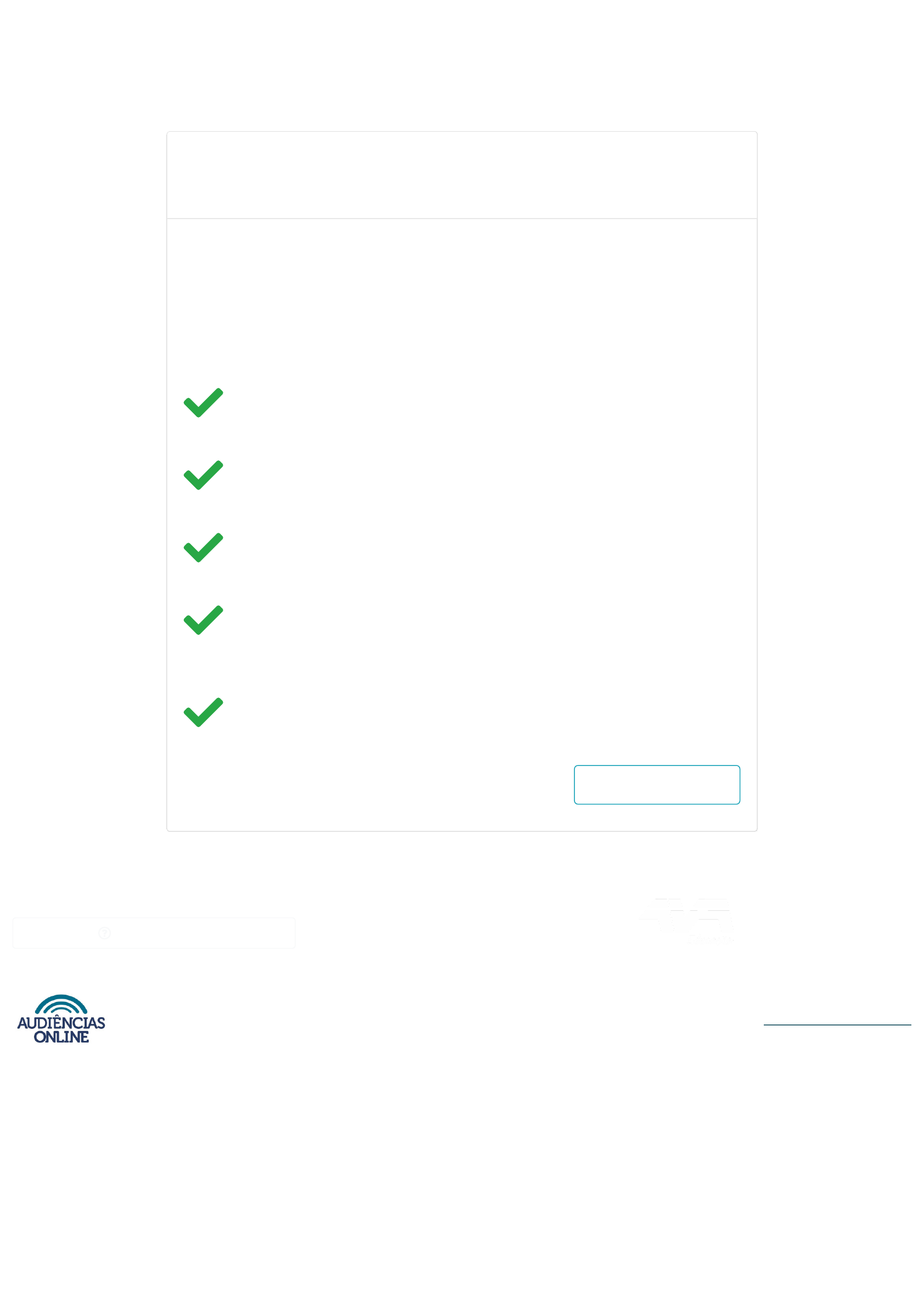 Avaliação de Conhecimento : Justiça do Trabalho Audiências de Instrução Audiência Trabalhista de Instrução 15 Audiência Trabalhista de Instrução 15 Processo: 0024759-44.2018.5.24.0021 Voltar para a home Parabéns, você atingiu a pontuação necessária para a emissão do certificado. Dentro de no máximo 5 minutos você poderá acessar o seu certificado na opção "Meus Certificados", existente no Menu. Qual o desfecho da audiência? As partes celebraram acordo; Quem esteve presente à audiência? Ambas as partes e advogados. Que tipo de providência foi adotada pelo juiz em audiência? Expedição de alvará para saque do FGTS; As partes e procuradores fizeram algum questionamento sobre a gravação da audiência? Sim, a advogada do réu questionou seu cliente durante a audiência; Qual o primeiro nome do reclamado? Raimundo contato@avaeducacao.com.br CENTRAL DE DUVIDAS contato@avaeducacao.com.br Central de ajuda CONECTE-SE Apoio ©2022 Audiencias Online. Política de Privacidade Usuário logado com sucesso! mailto:contato@audienciasonline.com.br mailto:contato@audienciasonline.com.br https://www.facebook.com/joseandradeaudienciasonline/ https://www.youtube.com/channel/UC0VPVc46sgqyslyCuEOk0Lw https://www.instagram.com/joseandradeao/?hl=pt https://t.me/juizjoseandrade