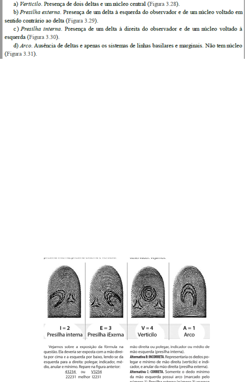 Esses tipos essenciais são simbolicamente representados por letras maiúsculas para os polegares e por algarismos para o restante dos dedos. Assim: Verticilo: V – 4 Presilha externa: E – 3 Presilha interna: I – 2 Arco: A – 1 Redundando na palavra VEIA, como um meio de memorização. Anotam-se com × os desenhos com defeito, por cicatrizes ou por qualquer alteração, e por 0 (zero) as amputações. Denomina-se fórmula dactiloscópica a sucessão de letras e algarismos que configuram os tipos fundamentais de uma pessoa a partir do polegar direito até o mínimo esquerdo, sentida por meio de uma fração que tem como numerador a mão direita e denominador a mão esquerda. Se evidenciam 12 pontos característicos idênticos, em uma e noutra impressão digital, em mesma localização e sem nenhuma discrepância, a identidade é estabelecida. Os pontos característicos mais comuns são: o ponto, a cortada, a bifurcação, a forquilha e o encerro. No estudo de uma impressão digital, notam-se, em cada linha papilar, diversos pontos claros, representados pelos poros. Em um fragmento de impressão, dá-se um grande valor à poroscopia, levando-se em conta, em uma determinada linha, o número, a forma, a posição e a dimensão dos poros sudoríparos. Por fim, examinando-se certas impressões digitais, podem-se notar, além dos desenhos das linhas negras papilares e dos espaços correspondentes aos sulcos interpapilares, algumas linhas brancas, de forma, direção e tamanho os mais variados, as quais, em seu conjunto, são conhecidas sob a denominação de “albodactilograma”. Para uma melhor visualização dessas linhas, é necessário que, na tomada da impressão digital, sejam usados uma camada de tinta bem fina, papel apropriado e dê-se uma pressão muito delicada. Em sua maioria, são representadas por cicatrizes ou ferimentos. Pode-se dizer que o método de identificação pelo sistema dactiloscópico de Vucetich é um processo de grande valia e de extraordinário efeito, porque ele apresenta os requisitos essenciais de um bom método: unicidade, praticabilidade, imutabilidade e classificabilidade. Só não apresenta o requisito da perenidade. OUTRAS: · Fotografia Sinalética: Tira foto de frente e de perfil. · Sistema geométrico de Matheios: Essa técnica assenta-se particularmente em traçar-se uma linha vertical passando pelo dorso do nariz, duas linhas paralelas à primeira passando pelas pupilas e várias linhas horizontais capazes de dividir a face em muitas frações, passando pela base da implantação dos cabelos, pelo meio da testa, pelas asas do nariz, pelos lábios superior e inferior, pelo meio do mento, duas linhas passando por cima e por baixo tangentes às sobrancelhas e uma cortando as pupilas. (O PROBLEMA É A CLASSIFICAÇÃO).