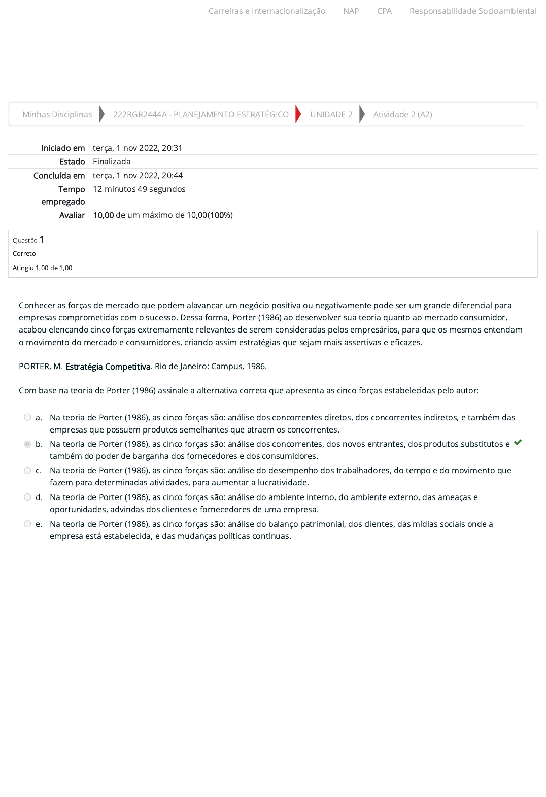 Minhas Disciplinas 222RGR2444A - PLANEJAMENTO ESTRATÉGICO UNIDADE 2 Atividade 2 (A2) Iniciado em terça, 1 nov 2022, 20:31 Estado Finalizada Concluída em terça, 1 nov 2022, 20:44 Tempo empregado 12 minutos 49 segundos Avaliar 10,00 de um máximo de 10,00(100%) Questão 1 Correto Atingiu 1,00 de 1,00 Conhecer as forças de mercado que podem alavancar um negócio positiva ou negativamente pode ser um grande diferencial para empresas comprometidas com o sucesso. Dessa forma, Porter (1986) ao desenvolver sua teoria quanto ao mercado consumidor, acabou elencando cinco forças extremamente relevantes de serem consideradas pelos empresários, para que os mesmos entendam o movimento do mercado e consumidores, criando assim estratégias que sejam mais assertivas e e�cazes. PORTER, M. Estratégia Competitiva. Rio de Janeiro: Campus, 1986. Com base na teoria de Porter (1986) assinale a alternativa correta que apresenta as cinco forças estabelecidas pelo autor: a. Na teoria de Porter (1986), as cinco forças são: análise dos concorrentes diretos, dos concorrentes indiretos, e também das empresas que possuem produtos semelhantes que atraem os concorrentes. b. Na teoria de Porter (1986), as cinco forças são: análise dos concorrentes, dos novos entrantes, dos produtos substitutos e também do poder de barganha dos fornecedores e dos consumidores. c. Na teoria de Porter (1986), as cinco forças são: análise do desempenho dos trabalhadores, do tempo e do movimento que fazem para determinadas atividades, para aumentar a lucratividade. d. Na teoria de Porter (1986), as cinco forças são: análise do ambiente interno, do ambiente externo, das ameaças e oportunidades, advindas dos clientes e fornecedores de uma empresa. e. Na teoria de Porter (1986), as cinco forças são: análise do balanço patrimonial, dos clientes, das mídias sociais onde a empresa está estabelecida, e das mudanças políticas contínuas. Carreiras e Internacionalização NAP CPA Responsabilidade Socioambiental https://ambienteacademico.com.br/my/ https://ambienteacademico.com.br/course/view.php?id=17737 https://ambienteacademico.com.br/course/view.php?id=17737§ion=4 https://ambienteacademico.com.br/mod/quiz/view.php?id=486915 https://informa.fmu.br/carreiras/ https://codely-fmu-content.s3.amazonaws.com/Moodle/NAP/inicial/nap/fmu/index.html https://codely-fmu-content.s3.amazonaws.com/Moodle/CPA/landing_CPA/index.html https://portal.fmu.br/sustentabilidade Questão 2 Correto Atingiu 1,00 de 1,00 Dentre as diversas teorias da administração, temos uma da qual não podemos nos esquecer, sendo a teoria clássica. Nela um dos principais autores, Fayol, ajudou a conceber conceitos até hoje vividos pelas organizações, que auxiliam desde a concepção até o encerramento e avaliação de uma ação junto ao mercado consumidor. Os conceitos estabelecidos por volta do �nal do século XIX estão latentes junto aos empresários que buscam se diferenciar em um cenário de tanta competitividade. Sobre os termos PODC (Planejar, Organizar, Dirigir e Controlar), analise as a�rmativas a seguir e assinale V para a(s) Verdadeira(s) e F para a(s) Falsa(s). ( ) Planejar indica predispor os recursos para o alcance dos objetivos; Organizar se refere à de�nição das metas para o plano; Dirigir é uma forma de corrigir as ações estabelecidas; e, Controlar indica como executar os objetivos traçados. ( ) Planejar indica a avaliação que deve ser feita de cada objetivo; Organizar se refere à de�nição das metas para o plano; Dirigir é conduzir as ações traçadas; e, Controlar indica como executar os objetivos traçados. ( ) Planejar indica a condução estratégica de cada objetivo; Organizar se refere à formatação lógica e sequencial para cada plano; Dirigir é uma forma de corrigir as ações estabelecidas; e, Controlar indica como executar os objetivos traçados. ( ) Planejar indica traçar metas e objetivos organizacionais; Organizar se refere a uma padronização lógica e sequencial; Dirigir seria a condução de cada uma das metas; e, Controlar é a avaliação �xa e contínua de cada ação junto às metas iniciais. Com base nas a�rmativas assinale a alternativa que apresenta a sequência correta: a. F, V, F, V. b. V, F, V, F. c. F, F, F, V. d. V, V, F, V. e. F, F, F, F. Carreiras e Internacionalização NAP CPA Responsabilidade Socioambiental https://informa.fmu.br/carreiras/ https://codely-fmu-content.s3.amazonaws.com/Moodle/NAP/inicial/nap/fmu/index.html https://codely-fmu-content.s3.amazonaws.com/Moodle/CPA/landing_CPA/index.html https://portal.fmu.br/sustentabilidade Questão 3 Correto Atingiu 1,00 de 1,00 Questão 4 Correto Atingiu 1,00 de 1,00 O mercado é composto por empresas e consumidores, que diariamente negociam produtos e serviços, para atender a demandas especí�cas, desejos e necessidades. Um mesmo produto acaba sendo comercializado em diversas empresas, esse fato é conhecido como concorrência, ou seja, a oferta de determinado bem em lojas diferentes faz com que o consumidor barganhe pelas melhores condições antes de decidir pela compra. Nessa perspectiva é fundamental que uma empresa estude diariamente sua concorrência, para que sua oferta seja mais atrativa para o consumidor. Sendo assim, sobre a re�exão que deve fazer dos seus rivais, analise as a�rmativas a seguir e assinale V para a(s) Verdadeira(s) e F para a(s) Falsa(s). I. (X) Quanto à análise do produto ou serviço, uma organização deve conhecer a estratégia de preço de seus concorrentes e a margem de lucros que eles praticam, para se estabelecer de forma mais e�caz. II. (X) Quanto à análise do preço, uma organização deve entender as características do produto ou serviço para que possam atender ao mercado-alvo de forma mais e�caz garantindo a satisfação dos clientes. III. (X) Quanto à análise gerencial, uma organização deve compreender de que forma seus concorrentes fazem suas promoções, ou seja