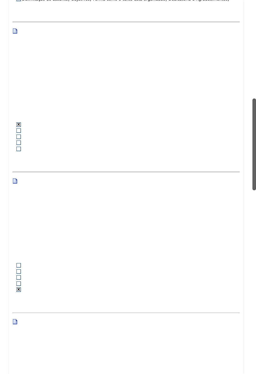 Delimitação do assunto; Objetivos; Forma como o texto está organizado; Dedicatória e Agradecimentos; 3a Questão (Ref.: 202008890801) Ao final de um curso de graduação, o aluno terá que apresentar um Trabalho de Conclusão de Curso (TCC). Neste trabalho ele apresentará todo o conhecimento adquirido ao longo do seu curso e comprovará que está apto para exercer a profissão da graduação que escolheu. Quanto ao Referencial Teórico de um TCC, atribua Verdadeiro (V) ou Falso (F) para as afirmativas feitas sobre este elemento textual nos itens abaixo e, a seguir, marque a alternativa correta: I. O Referencial Teórico refere-se ao embasamento teórico e acadêmico sobre o tema tratado no TCC. II. O Referencial Teórico deverá ser apresentado na forma de um texto que fala sobre os conceitos acadêmicos aprendidas ao longo do curso de Engenharia e que estão sendo utilizadas para a execução do TCC. III. O Referencial Teórico deve ser composto de um texto elaborado com base nas bibliografias adotadas para o TCC; IV. O Referencial Teórico deve explicar os principais conceitos acadêmicos envolvidos no trabalho. V. Deve ser explicado somente como os conceitos acadêmicos descritos se relacionam com a pesquisa que será feita no trabalho. I, II, III, IV estão corretas I e II estão corretas II, IV e V estão corretas I, II e IV estão corretas I, II e III estão corretas 4a Questão (Ref.: 202008890803) Ao final de um curso de graduação, o aluno terá que apresentar um Trabalho de Conclusão de Curso (TCC). Neste trabalho ele apresentará todo o conhecimento adquirido ao longo do seu curso e comprovará que está apto para exercer a profissão da graduação que escolheu. A definição do tema, que é o assunto escolhido para ser pesquisado, é de suma importância para o bom desenvolvimento da pesquisa, sendo que a escolha do tema deve ser condicionada a alguns fatores, verifique quais das afirmativas abaixo são verdadeiras e, a seguir, marque a alternativa correta: I. Encontrar ao menos uma referência bibliográfica sobre o tema; II. Relevância do tema; III. Gosto pelo assunto escolhido como tema; IV. Habilidade para desenvolver o tema; V. Tempo necessário para desenvolver a pesquisa sobre o tema escolhido. I, III e IV são verdadeiras Apenas I e II são verdadeiras Apenas I e III são verdadeiras III, IV e V são verdadeiras II, III, IV e V são verdadeiras 5a Questão (Ref.: 202008890805) Ao final de um curso de graduação, o aluno terá que apresentar um Trabalho de Conclusão de Curso (TCC). Neste trabalho ele apresentará todo o conhecimento adquirido ao longo do seu curso e comprovará que está apto para exercer a profissão da graduação que escolheu. Sobre "Delimitação do Tema" em um TCC, analise as afirmativas: I. Um tema com muitas restrições nas características pode levar a uma dificuldade para realizar o TCC, tendo muito pouco para se escrever; II. Um tema muito amplo pode levar a uma pesquisa sem foco, demandar muito tempo e correr o risco de não conseguir atingir os objetivos desta; javascript:alert('C%C3%B3digo da quest%C3%A3o: 6075469\n\nStatus da quest%C3%A3o: Liberada para Uso.'); javascript:alert('C%C3%B3digo da quest%C3%A3o: 6075471\n\nStatus da quest%C3%A3o: Liberada para Uso.'); javascript:alert('C%C3%B3digo da quest%C3%A3o: 6075473\n\nStatus da quest%C3%A3o: Liberada para Uso.');