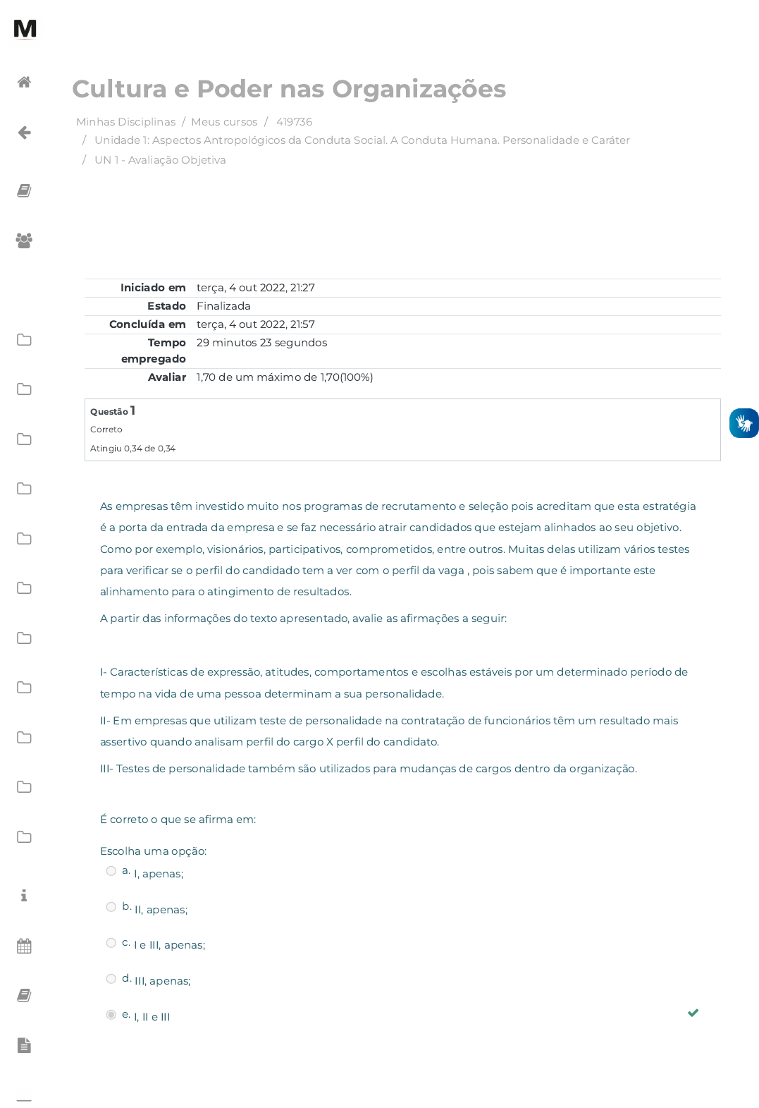 Minhas Disciplinas / Meus cursos / 419736 / Unidade 1: Aspectos Antropológicos da Conduta Social. A Conduta Humana. Personalidade e Caráter / UN 1 - Avaliação Objetiva Cultura e Poder nas Organizações Iniciado em terça, 4 out 2022, 21:27 Estado Finalizada Concluída em terça, 4 out 2022, 21:57 Tempo empregado 29 minutos 23 segundos Avaliar 1,70 de um máximo de 1,70(100%) Questão 1 Correto Atingiu 0,34 de 0,34 As empresas têm investido muito nos programas de recrutamento e seleção pois acreditam que esta estratégia é a porta da entrada da empresa e se faz necessário atrair candidados que estejam alinhados ao seu objetivo. Como por exemplo, visionários, participativos, comprometidos, entre outros. Muitas delas utilizam vários testes para veri�car se o per�l do candidado tem a ver com o per�l da vaga , pois sabem que é importante este alinhamento para o atingimento de resultados. A partir das informações do texto apresentado, avalie as a�rmações a seguir: I- Características de expressão, atitudes, comportamentos e escolhas estáveis por um determinado período de tempo na vida de uma pessoa determinam a sua personalidade. II- Em empresas que utilizam teste de personalidade na contratação de funcionários têm um resultado mais assertivo quando analisam per�l do cargo X per�l do candidato. III- Testes de personalidade também são utilizados para mudanças de cargos dentro da organização. É correto o que se a�rma em: Escolha uma opção: a. I, apenas; b. II, apenas; c. I e III, apenas; d. III, apenas; e. I, II e III https://avap.multivix.edu.br/my/ https://avap.multivix.edu.br/course/view.php?id=19138 https://avap.multivix.edu.br/course/view.php?id=19138§ion=2 https://avap.multivix.edu.br/mod/quiz/view.php?id=1264541 https://avap.multivix.edu.br/my/ https://avap.multivix.edu.br/course/view.php?id=19138 https://avap.multivix.edu.br/user/index.php?id=19138 https://avap.multivix.edu.br/course/view.php?id=19138§ion=1 https://avap.multivix.edu.br/course/view.php?id=19138§ion=2 https://avap.multivix.edu.br/course/view.php?id=19138§ion=3 https://avap.multivix.edu.br/course/view.php?id=19138§ion=4 https://avap.multivix.edu.br/course/view.php?id=19138§ion=5 https://avap.multivix.edu.br/course/view.php?id=19138§ion=6 https://avap.multivix.edu.br/course/view.php?id=19138§ion=7 https://avap.multivix.edu.br/course/view.php?id=19138§ion=8 https://avap.multivix.edu.br/course/view.php?id=19138§ion=9 https://avap.multivix.edu.br/course/view.php?id=19138§ion=10 https://avap.multivix.edu.br/course/view.php?id=19138§ion=11 https://avap.multivix.edu.br/mod/page/view.php?id=1252%2F%22%20target%3D%22_blank https://avap.multivix.edu.br/calendar/view.php/ https://avap.multivix.edu.br/local/staticpage/view.php?page=biblioteca https://portalweb.multivix.edu.br/gabaritos/login.aspx https://multivix.edu.br/office-365/ https://avap.multivix.edu.br/ Questão 2 Correto Atingiu 0,34 de 0,34 O ministro da Educação, Rossieli Soares, enfatizou esta semana no auditório da Confederação da Agricultura e Pecuária do Brasil (CNA) em reunião sobre combate à corrupção que “não existe a possibilidade de combater a corrupção somente nas esferas midiáticas. Nós precisamos combater a corrupção cultural, precisamos combater a corrupção junto com as nossas crianças, pois é com elas que nós temos maior adesão”. Na mesma linha, a representante da Unesco no Brasil, Marlova Noleto, sustentou que “o Brasil, lamentavelmente, é um país onde existe uma cultura de corrupção muito enraizada. Está em pequenos hábitos e gestos do dia a dia e, portanto, o papel da educação é fundamental para mudar esse quadro”. Fonte: http://www.cgu.gov.br/noticias/2018/12/combate-a-corrupcao-mudanca-de-cultura-no-pais-passa-por- educacao-cidada-defendem-autoridades Consultado em 28 fev. 2019 A partir das informações do texto apresentado, avalie as a�rmações a seguir: I – A cultura tem por base o estudo do comportamento das pessoas e também de ideias, crenças e valores compartilhados, portanto podemos dizer que o ato da corrupção faz parte da nossa cultura; II – A cultura é um processo que vem ao longo do tempo e é passado de geração em geração, portanto não se muda. Assim, nunca poderemos mudar a concepção de corrupção em uma sociedade, por entender que o ato da corrupção faz parte da nossa cultura; III- Corrupção não faz parte da cultura de uma sociedade, pois cada pessoa possui suas crenças, seus valores e agem de acordo com o que consideram ético e moral. É correto o que se a�rma em: Escolha uma opção: a. I, apenas; b. I e II, apenas; c. II e III, apenas; d. III, apenas; e. II, apenas; http://www.cgu.gov.br/noticias/2018/12/combate-a-corrupcao-mudanca-de-cultura-no-pais-passa-por-educacao-cidada-defendem-autoridades https://avap.multivix.edu.br/my/ https://avap.multivix.edu.br/course/view.php?id=19138 https://avap.multivix.edu.br/user/index.php?id=19138 https://avap.multivix.edu.br/course/view.php?id=19138§ion=1 https://avap.multivix.edu.br/course/view.php?id=19138§ion=2 https://avap.multivix.edu.br/course/view.php?id=19138§ion=3 https://avap.multivix.edu.br/course/view.php?id=19138§ion=4 https://avap.multivix.edu.br/course/view.php?id=19138§ion=5 https://avap.multivix.edu.br/course/view.php?id=19138§ion=6 https://avap.multivix.edu.br/course/view.php?id=19138§ion=7 https://avap.multivix.edu.br/course/view.php?id=19138§ion=8 https://avap.multivix.edu.br/course/view.php?id=19138§ion=9 https://avap.multivix.edu.br/course/view.php?id=19138§ion=10 https://avap.multivix.edu.br/course/view.php?id=19138§ion=11 https://avap.multivix.edu.br/mod/page/view.php?id=1252%2F%22%20target%3D%22_blank https://avap.multivix.edu.br/calendar/view.php/ https://avap.multivix.edu.br/local/staticpage/view.php?page=biblioteca https://portalweb.multivix.edu.br/gabaritos/login.aspx https://multivix.edu.br/office-365/ https://avap.multivix.edu.br/ Quest